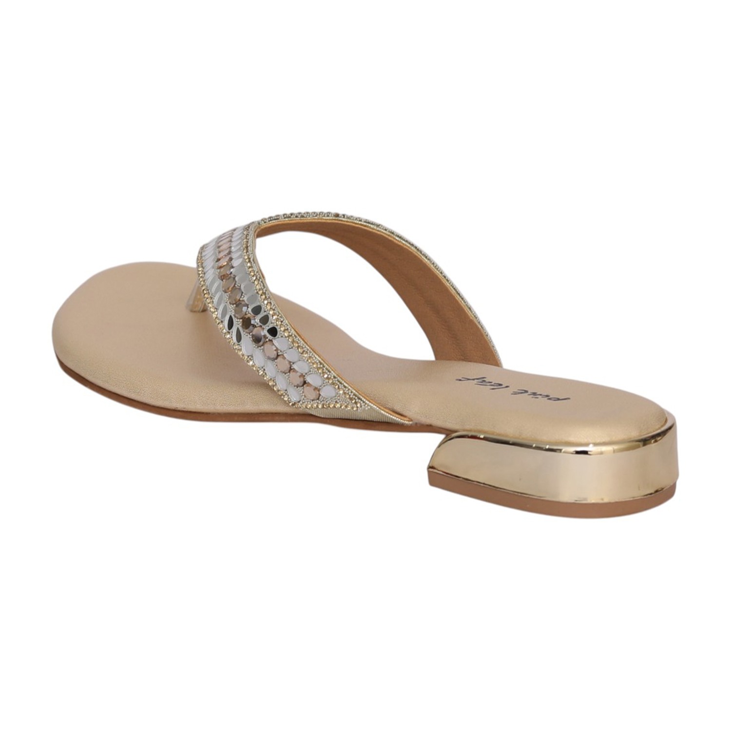 Shine with refined elegance in the Women’s Gold Celestial Crystal Sandal. Designed with a beautifully embellished crystal strap and a graceful toe-post silhouette, this sandal radiates subtle glamour. The sleek, open design offers effortless sophistication, while the cushioned footbed ensures lasting comfort. Finished in a luminous gold tone, it’s the perfect choice for festive occasions, celebrations, or adding sparkle to your everyday style.
