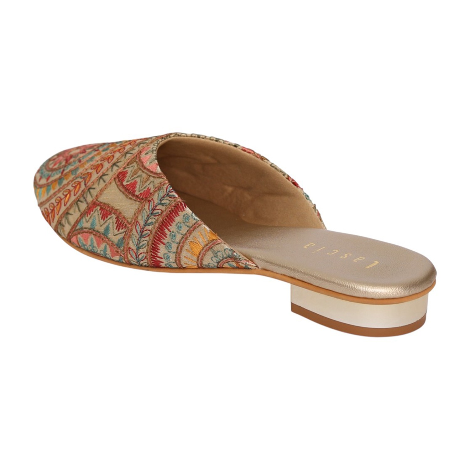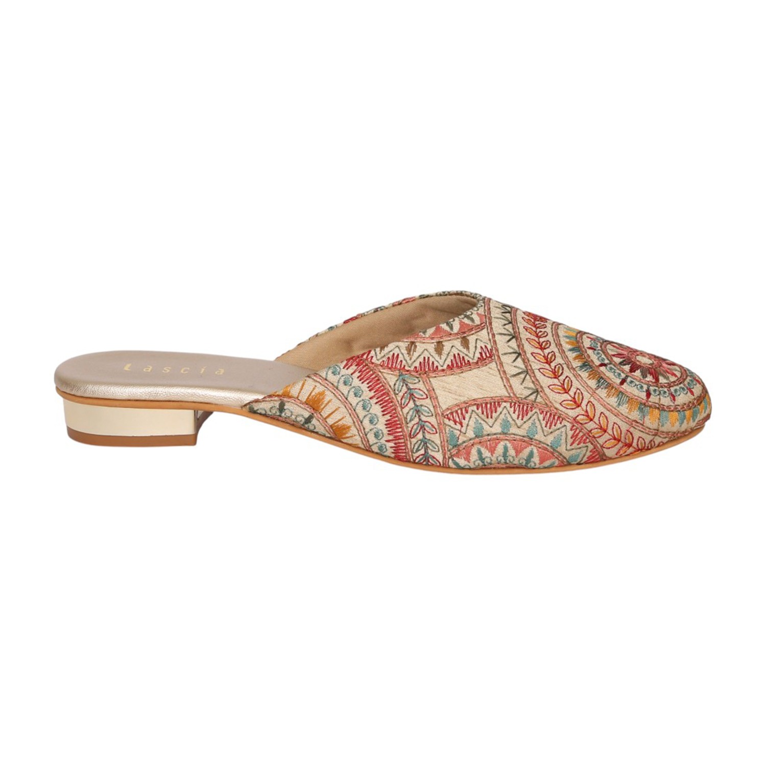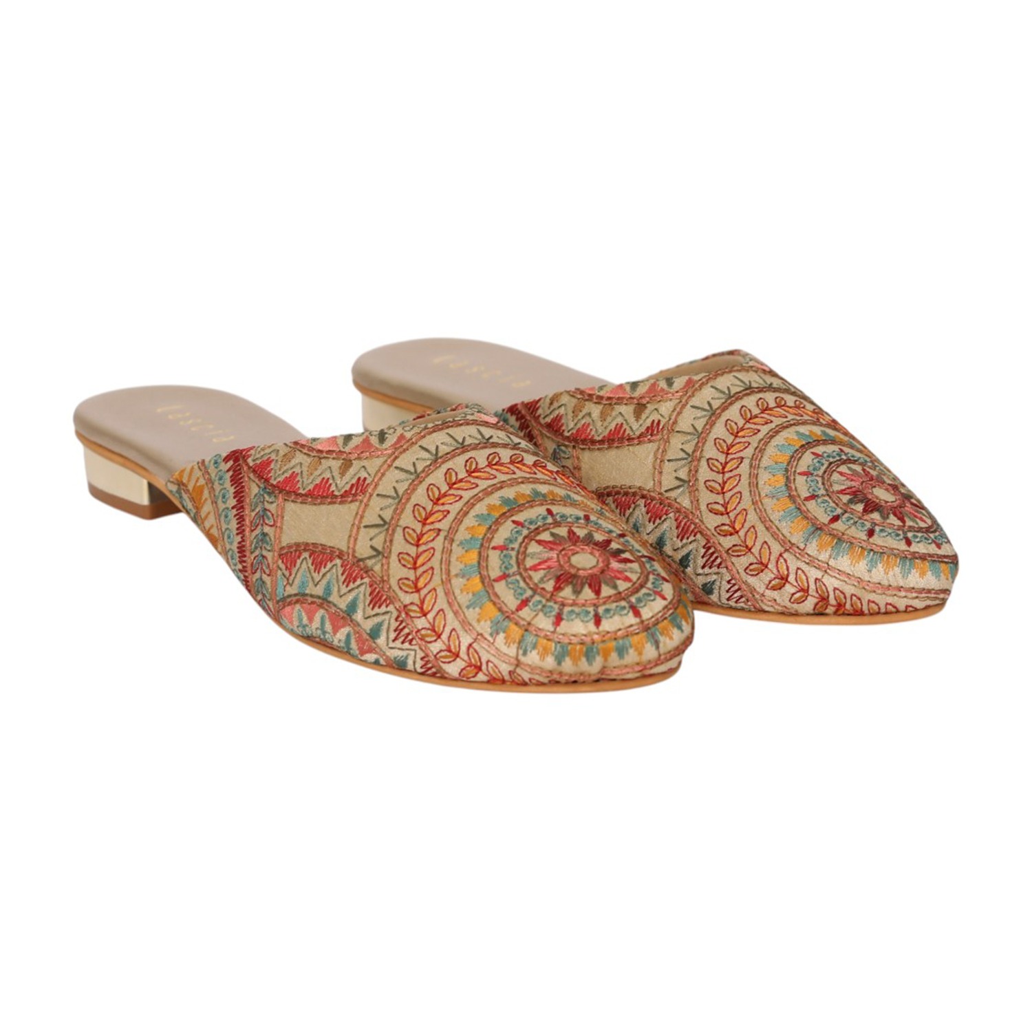 Add a touch of artisanal charm to your footwear collection with these elegant gold mule heels. Designed with intricate multicolor embroidery in a striking circular and geometric pattern, these slip-ons bring a perfect blend of tradition and contemporary style. The pointed toe silhouette enhances the overall look, while the low block heel offers comfortable elevation for all-day wear. Crafted for both style and ease, these mules feature a cushioned footbed and an open-back design for effortless wearability. Ideal for festive occasions, casual outings, or fusion wear styling, these statement mules are a must-have for a chic wardrobe.