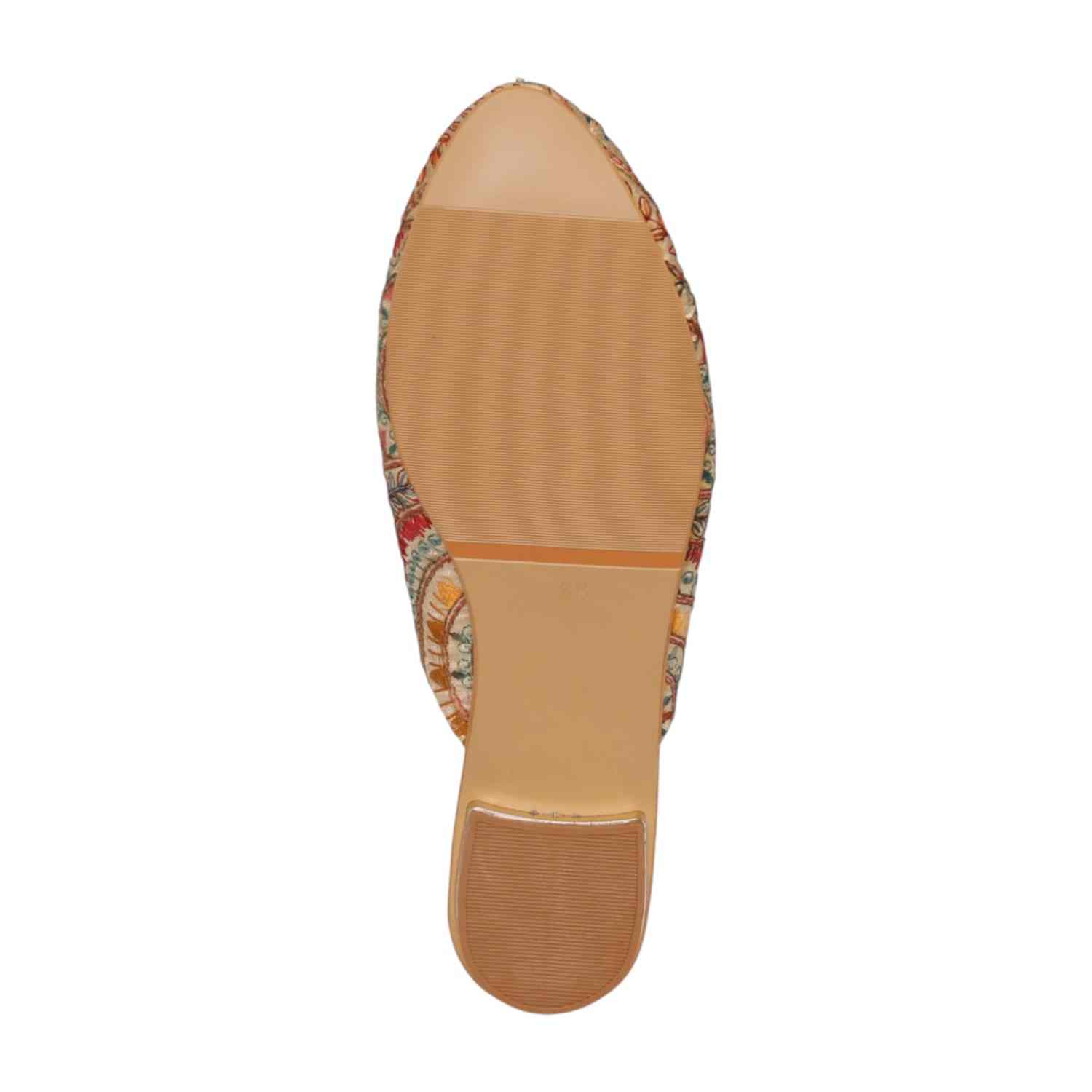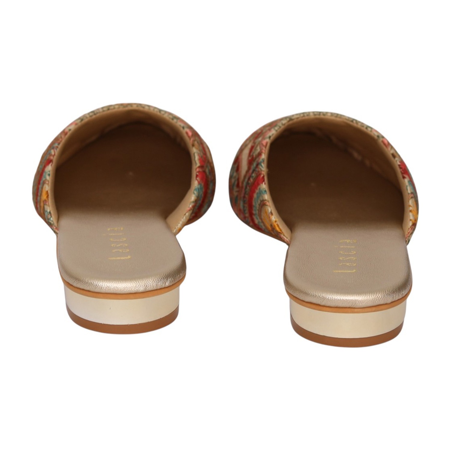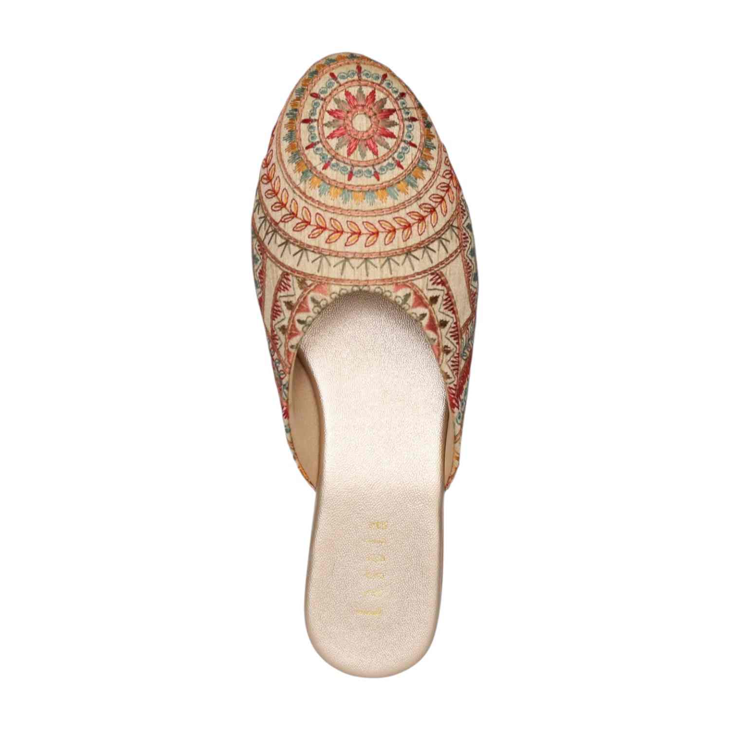 Add a touch of artisanal charm to your footwear collection with these elegant gold mule heels. Designed with intricate multicolor embroidery in a striking circular and geometric pattern, these slip-ons bring a perfect blend of tradition and contemporary style. The pointed toe silhouette enhances the overall look, while the low block heel offers comfortable elevation for all-day wear. Crafted for both style and ease, these mules feature a cushioned footbed and an open-back design for effortless wearability. Ideal for festive occasions, casual outings, or fusion wear styling, these statement mules are a must-have for a chic wardrobe.