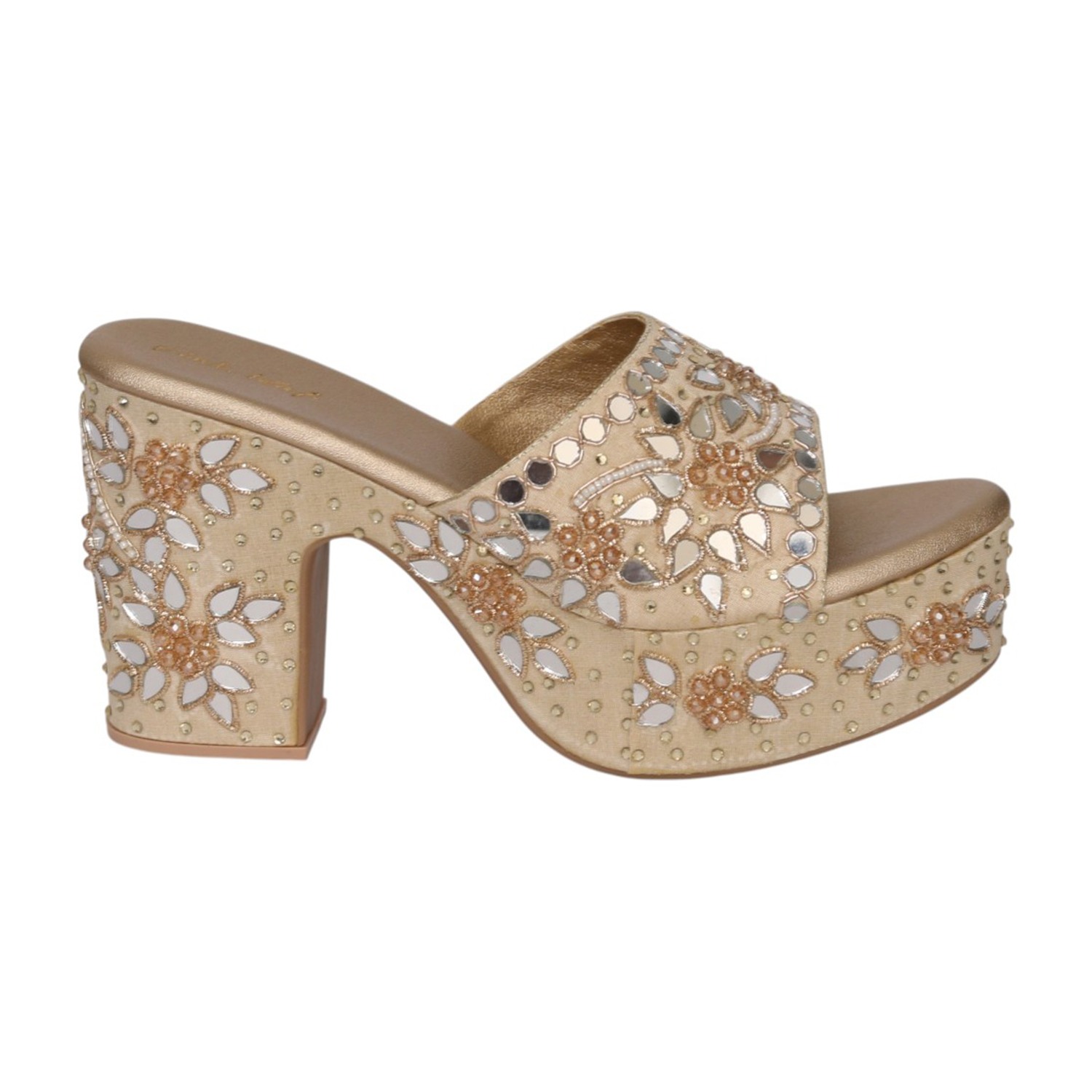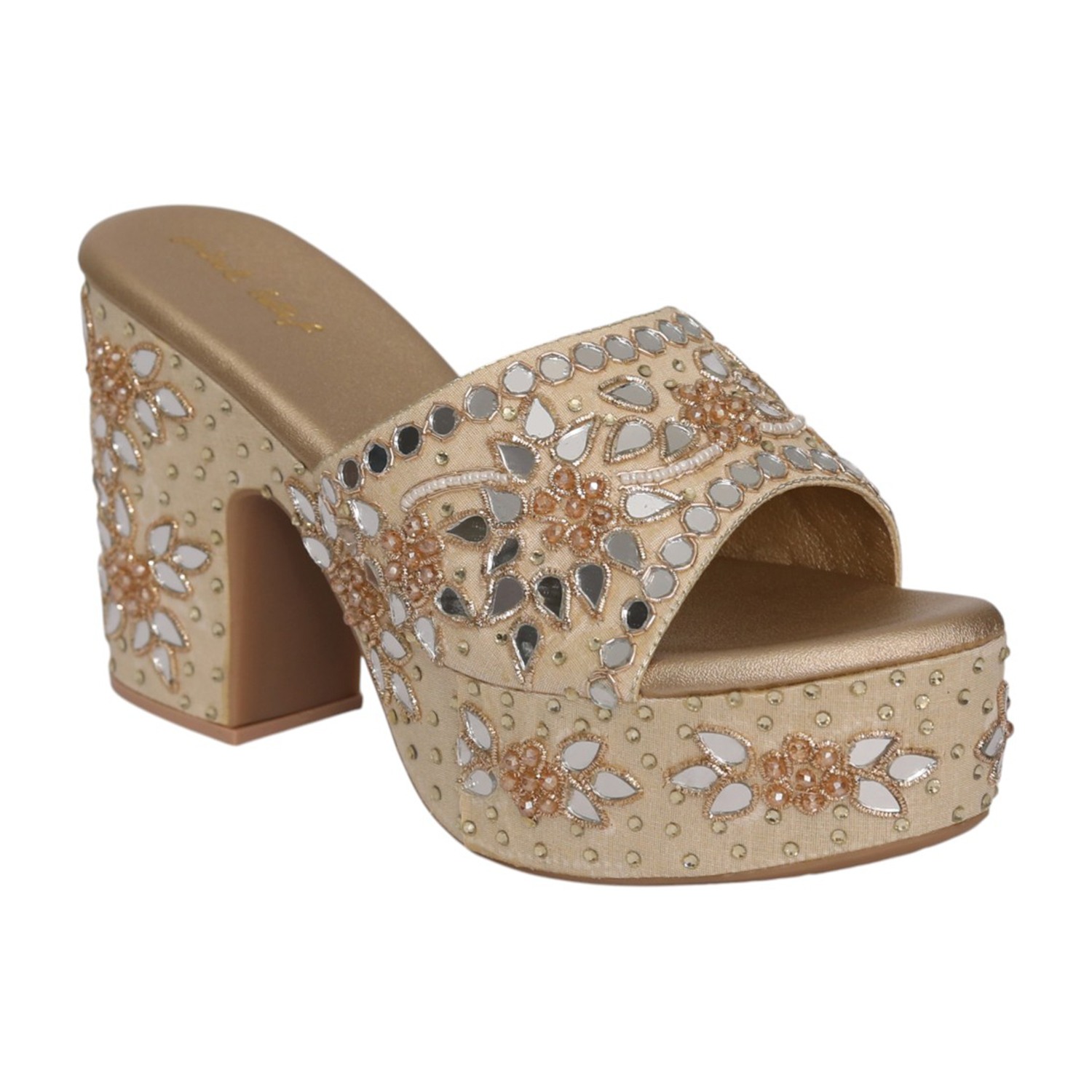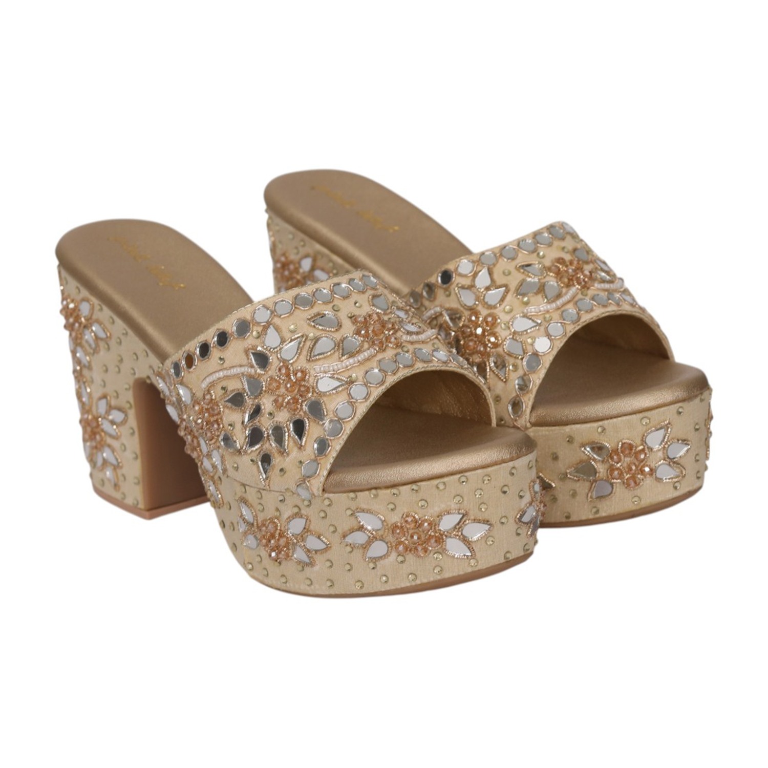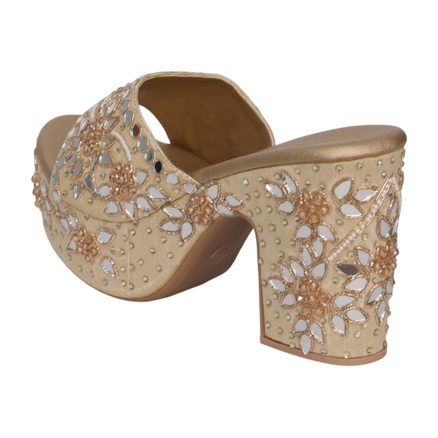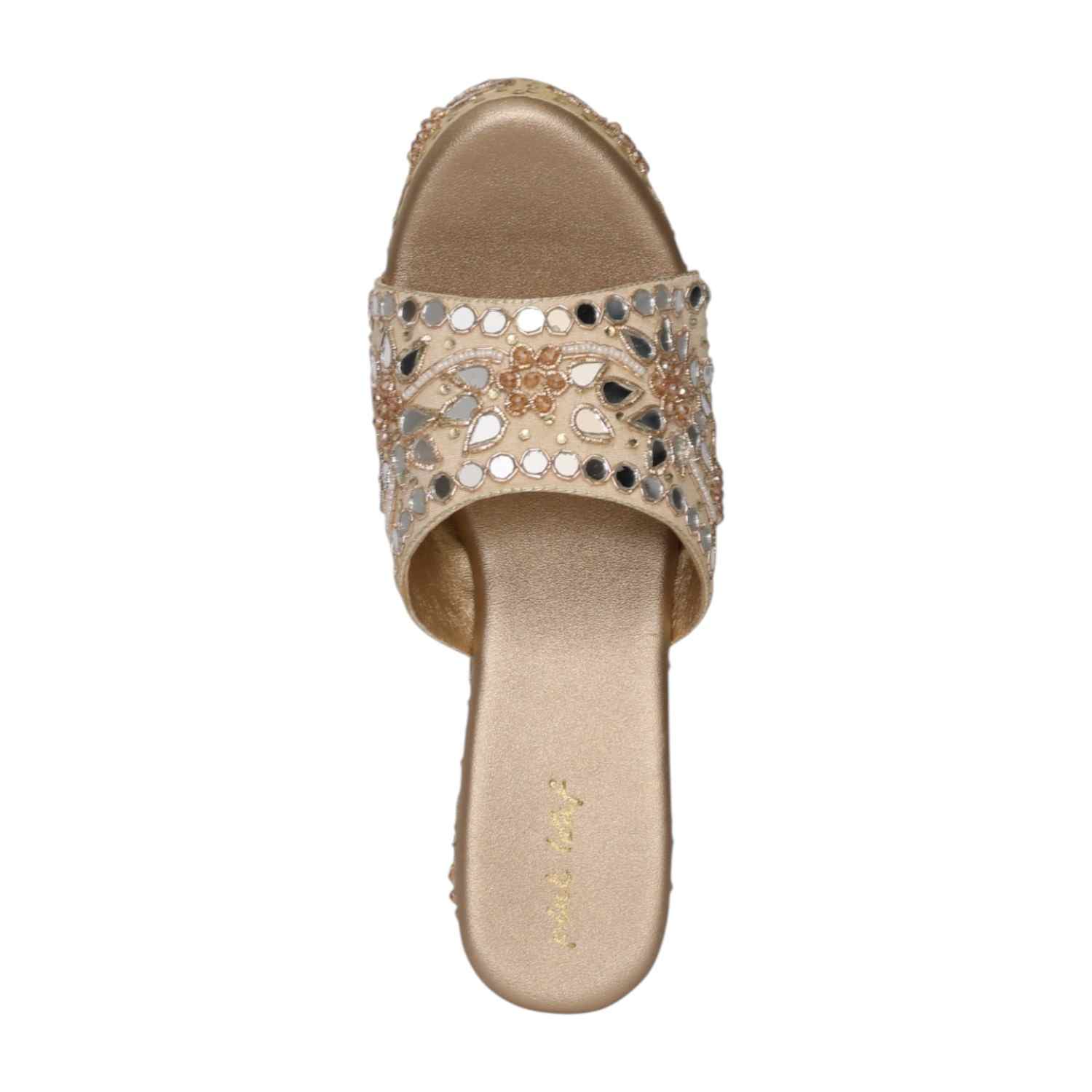 Home / Products / Pinkleaf / Women Gold Ethnic Mirror Work Slip-On Block Heels