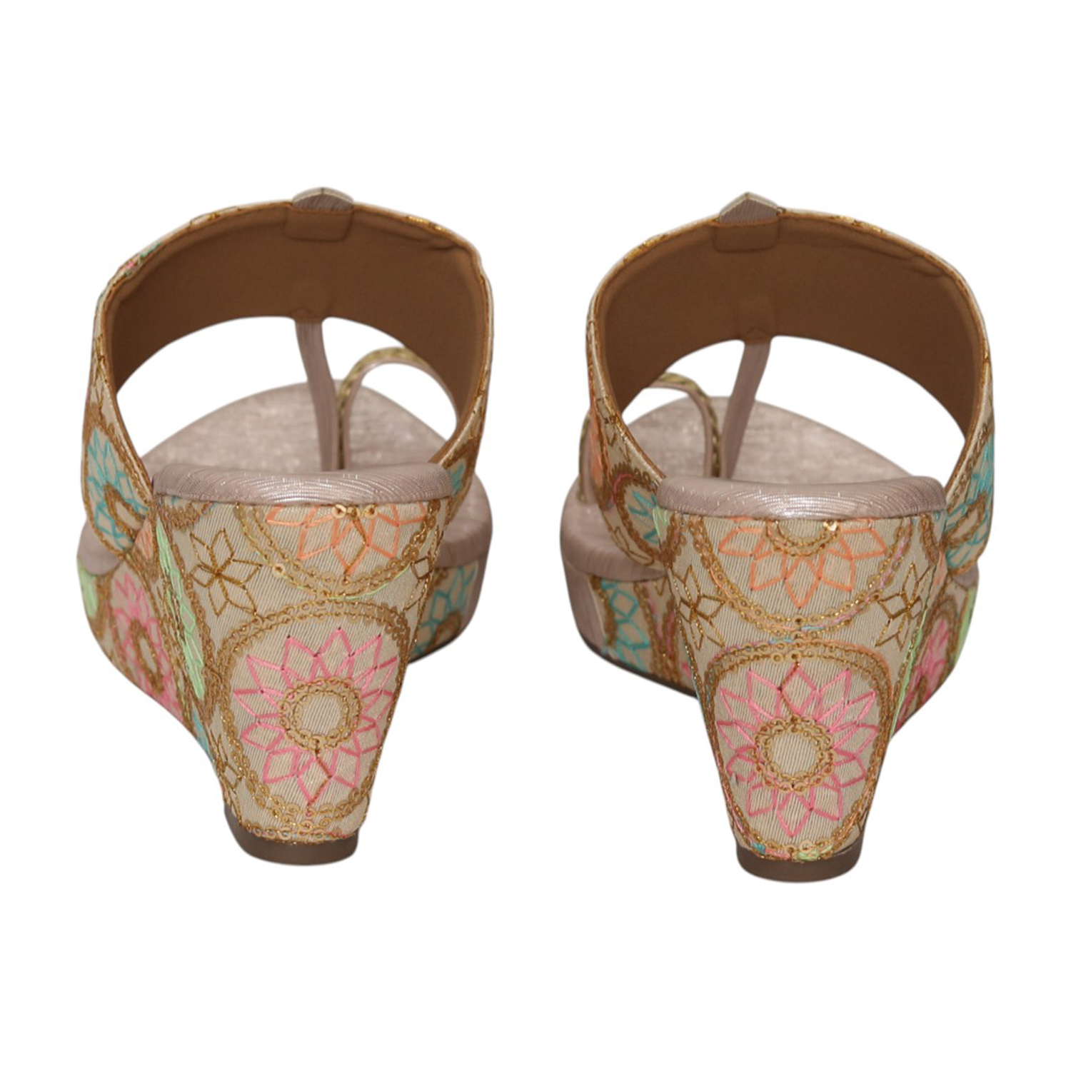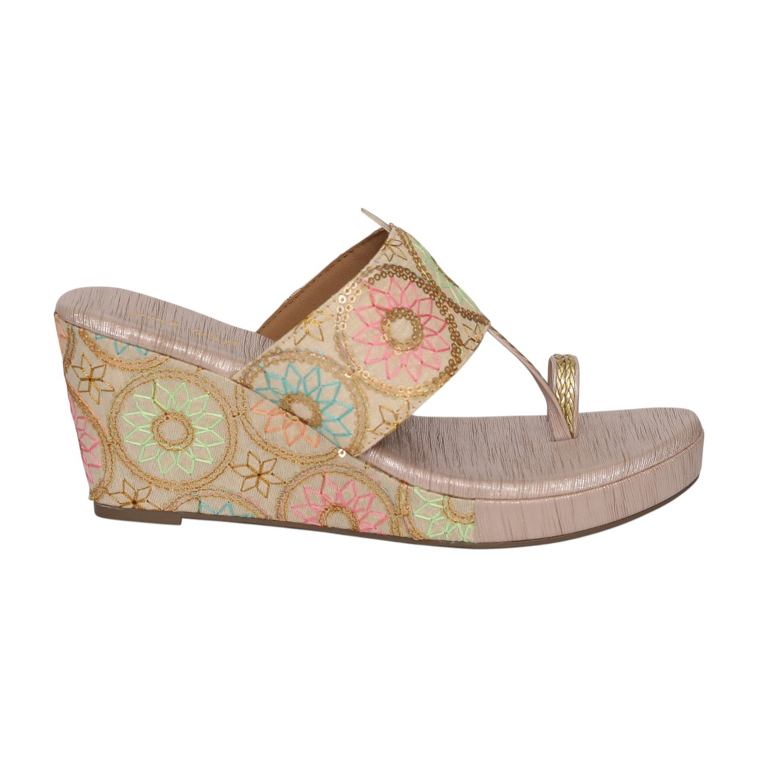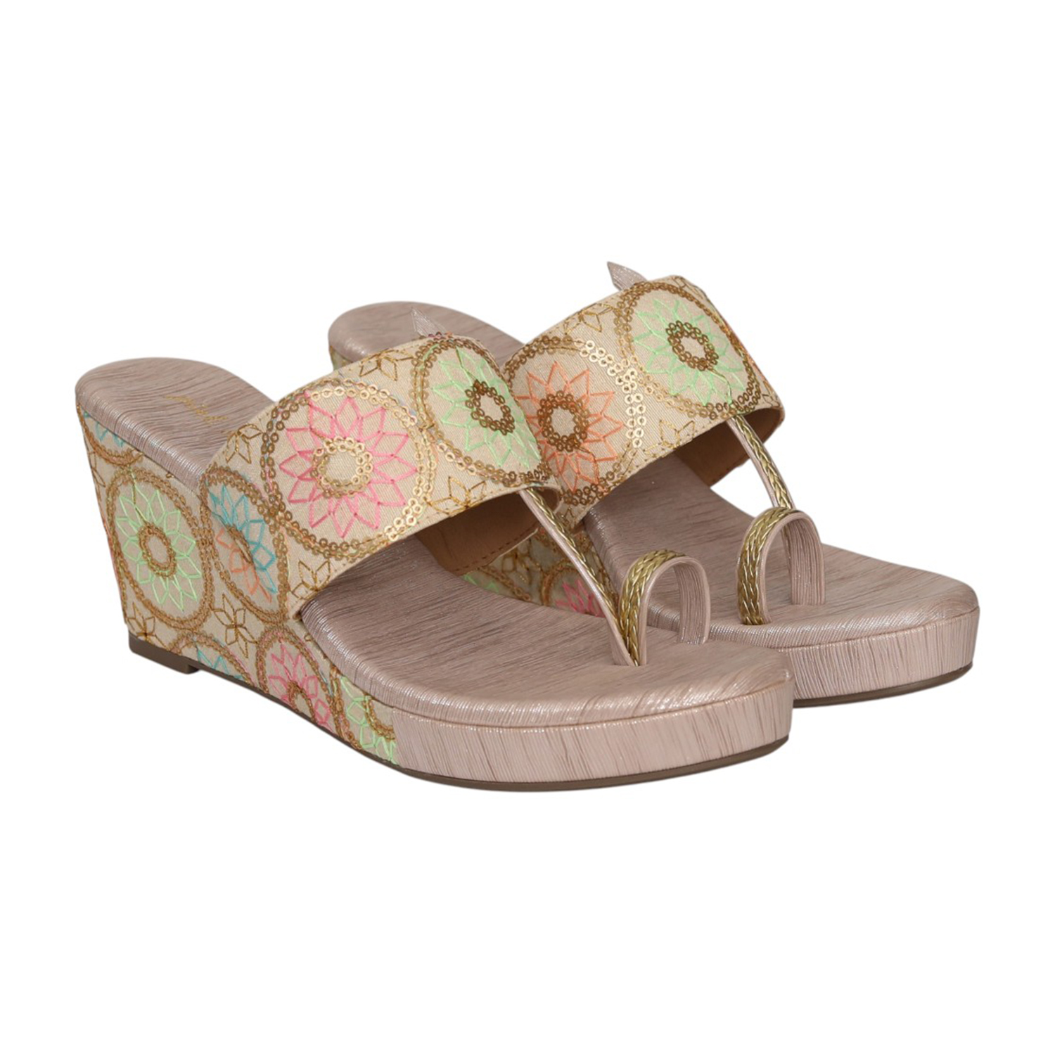 Home / Products / Pinkleaf / Women Gold Floral Embroidered Wedge Heel Toe-Ring Slip-On Sandals