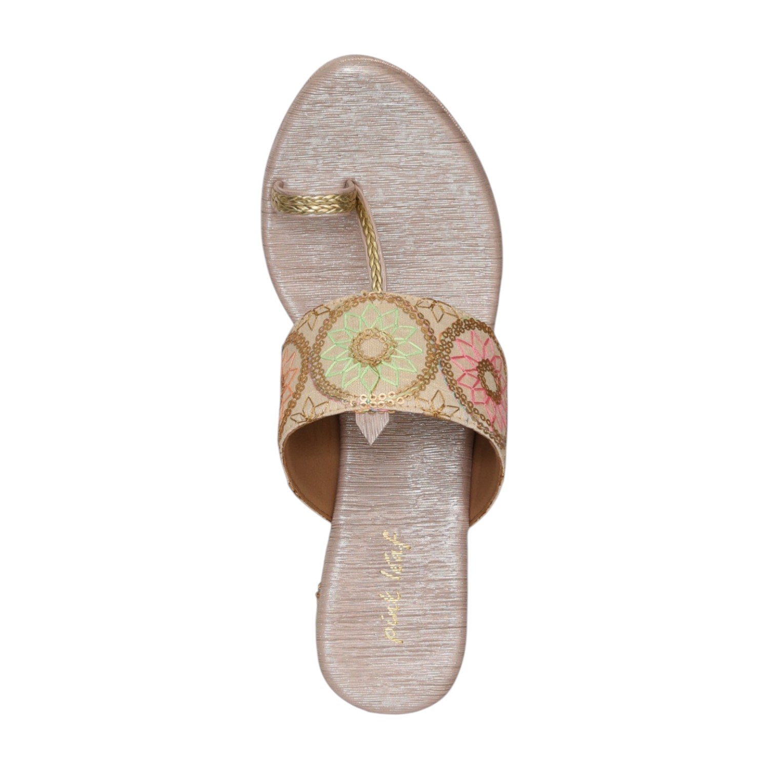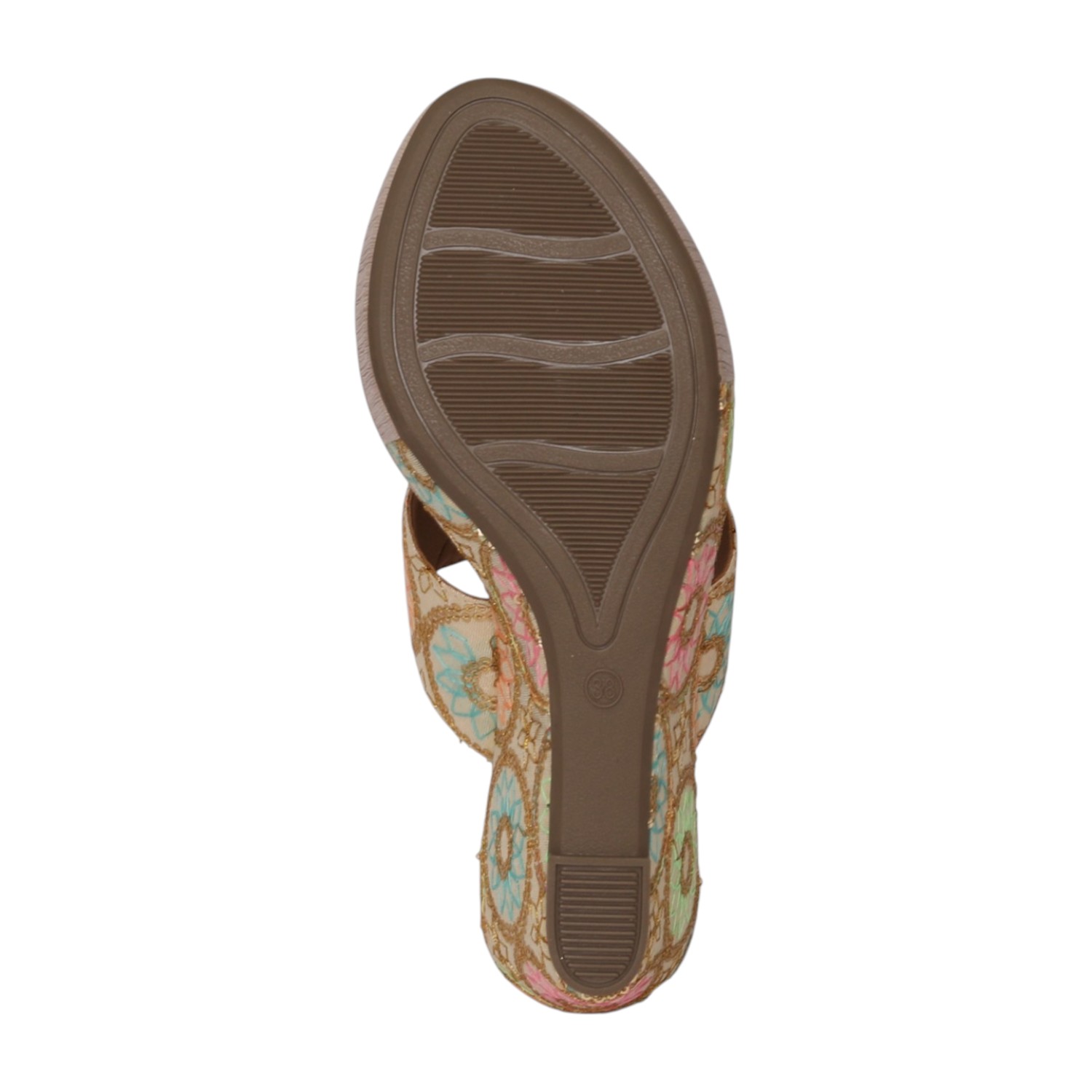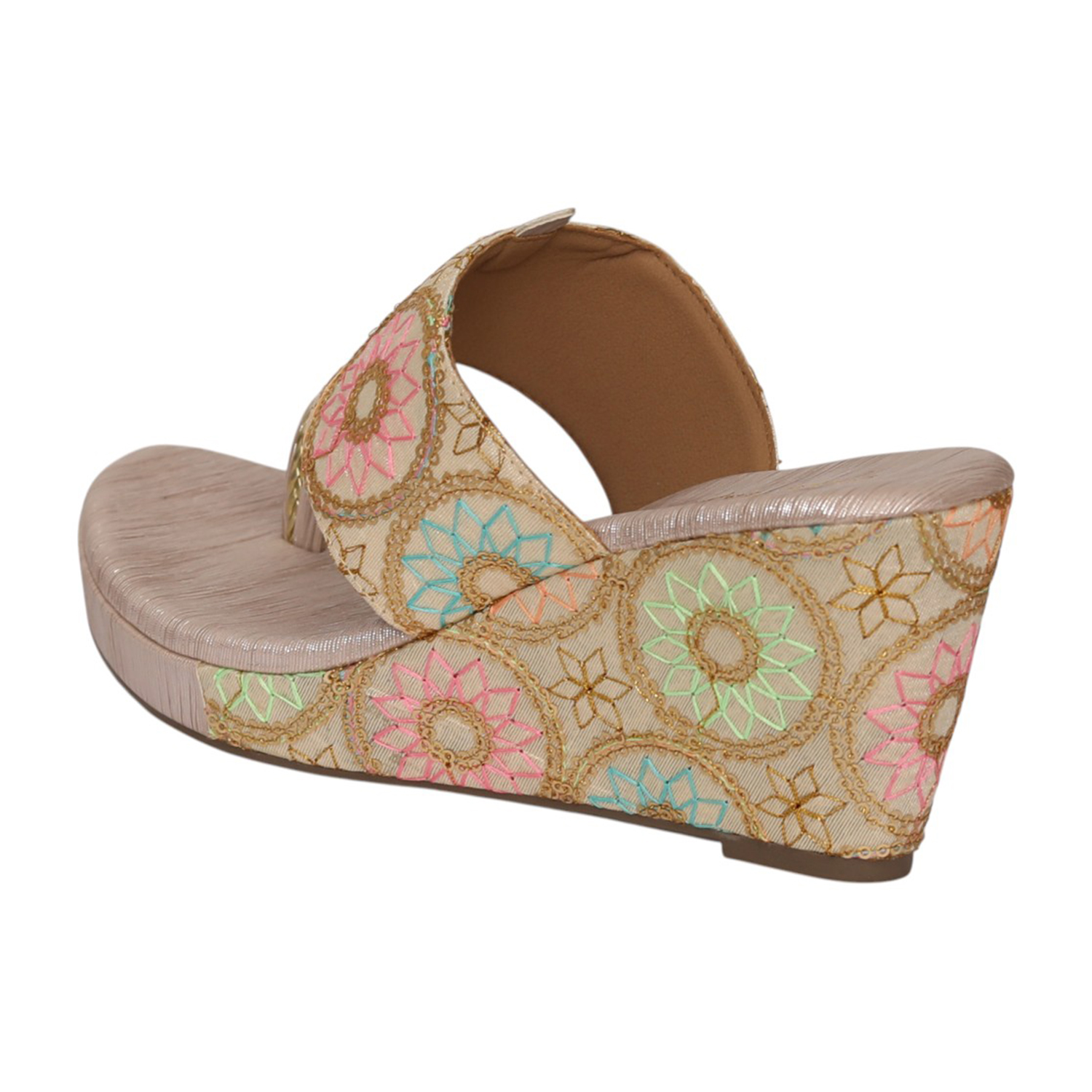 Home / Products / Pinkleaf / Women Gold Floral Embroidered Wedge Heel Toe-Ring Slip-On Sandals