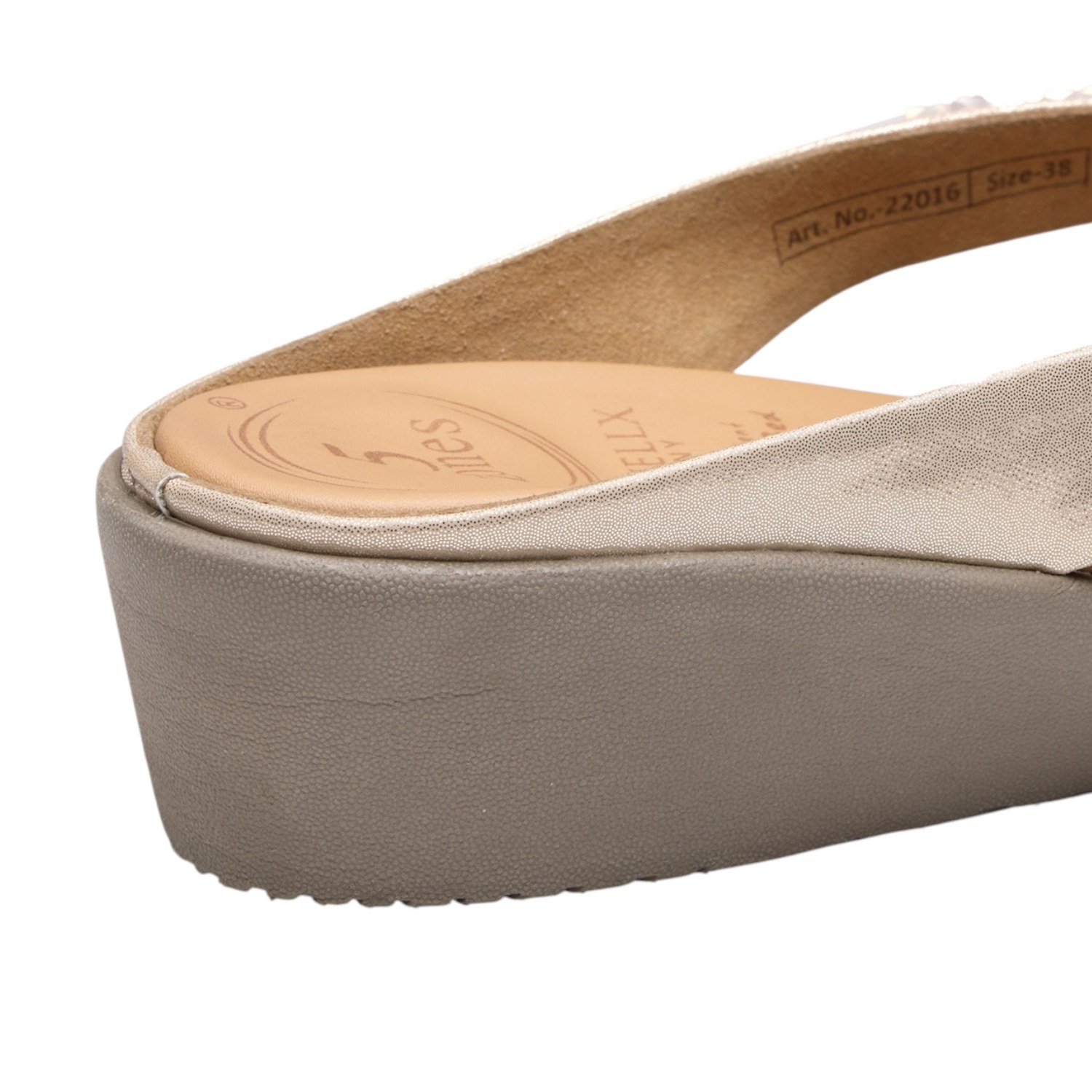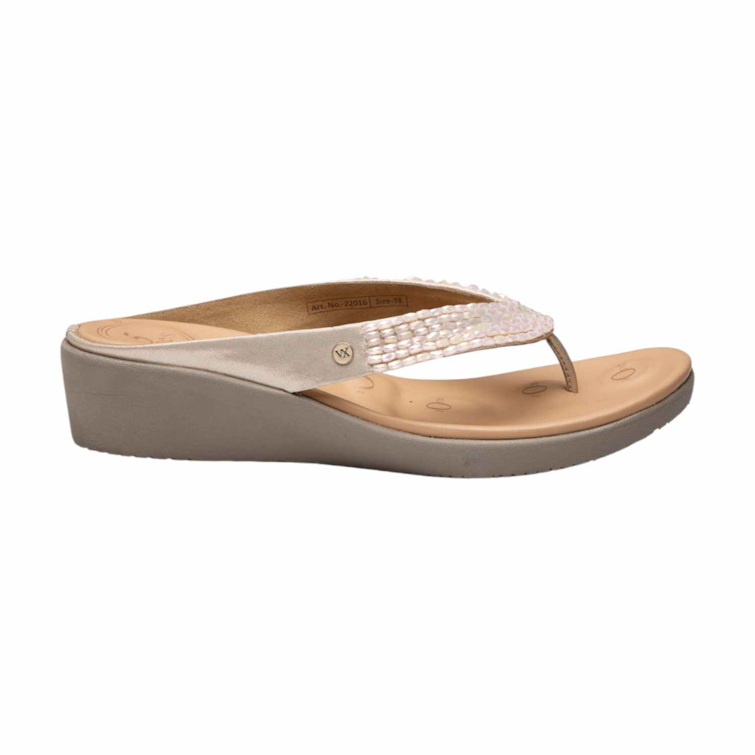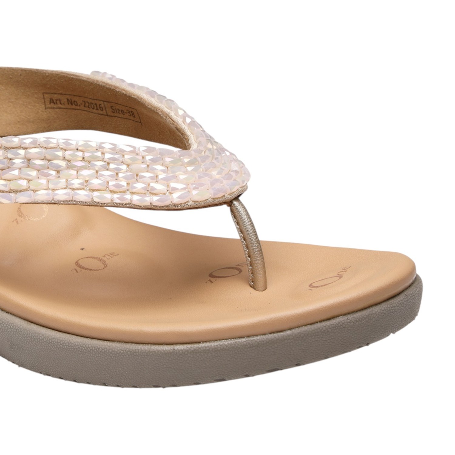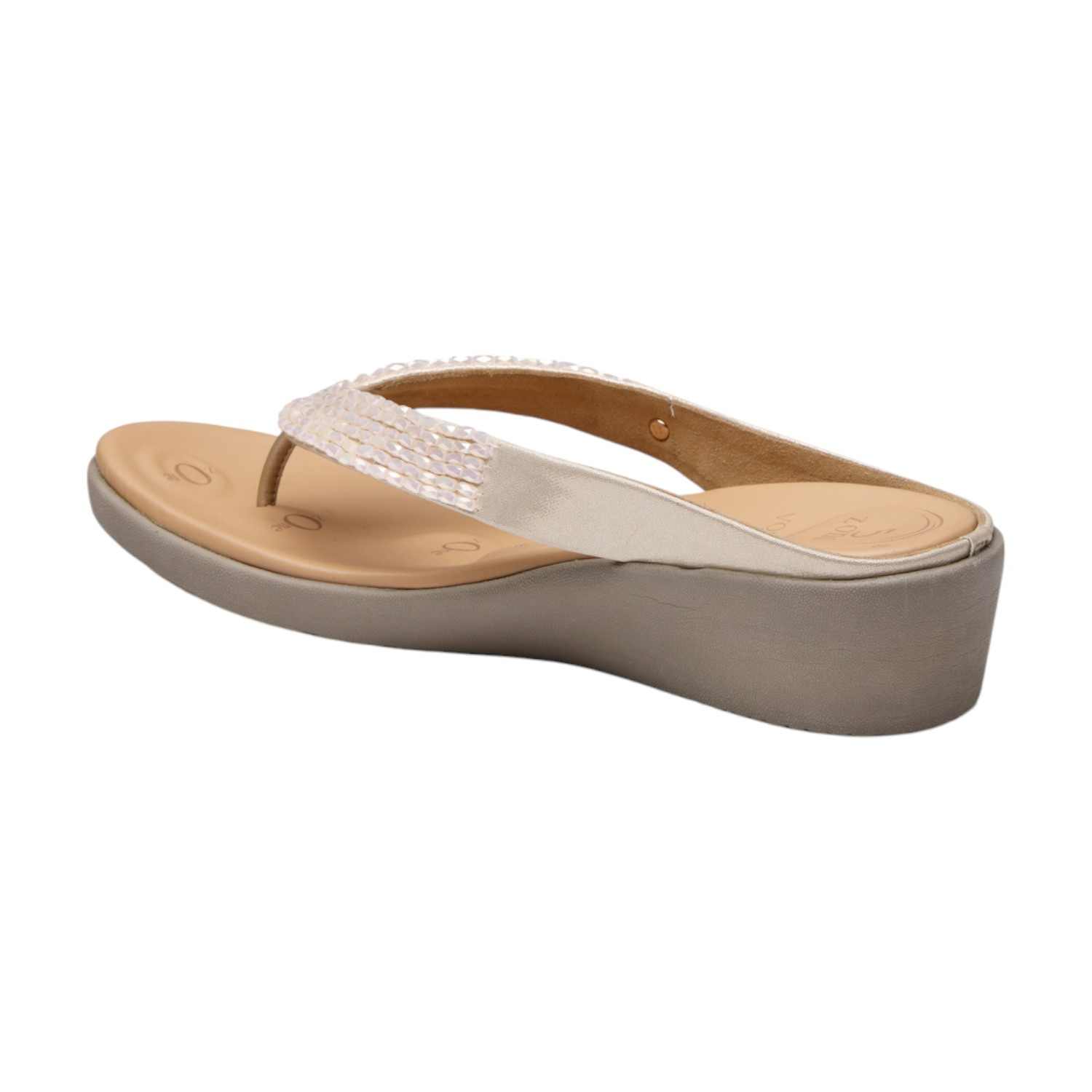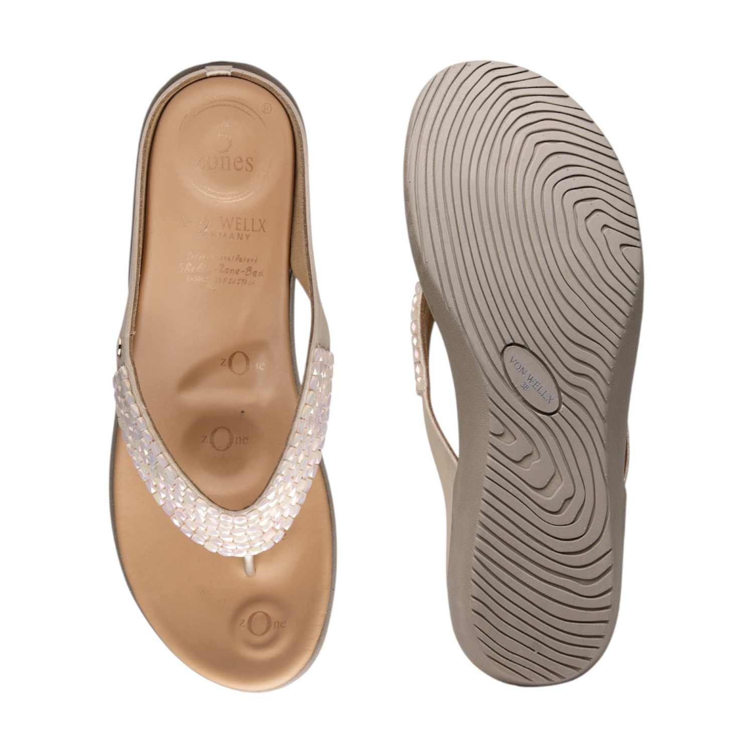 Add a touch of subtle glamour to your stride with these women's gold/neutral thong sandals. The stylish strap is adorned with delicate, iridescent beads, while the Von Wellx Germany's patented 5-Zone Reflex-Long-Bed footbed provides superior comfort and ergonomic support for your feet. Complete with a robust, textured outsole for reliable grip, these sandals are ideal for chic, comfortable wear all day long.