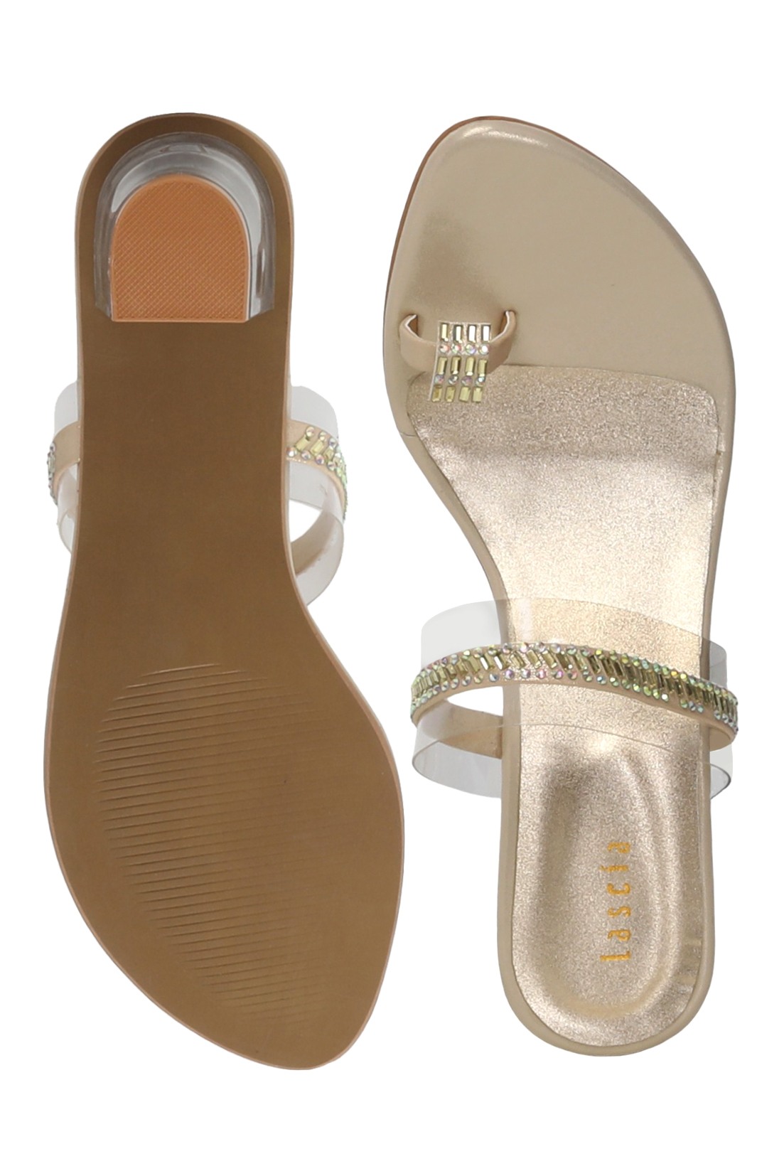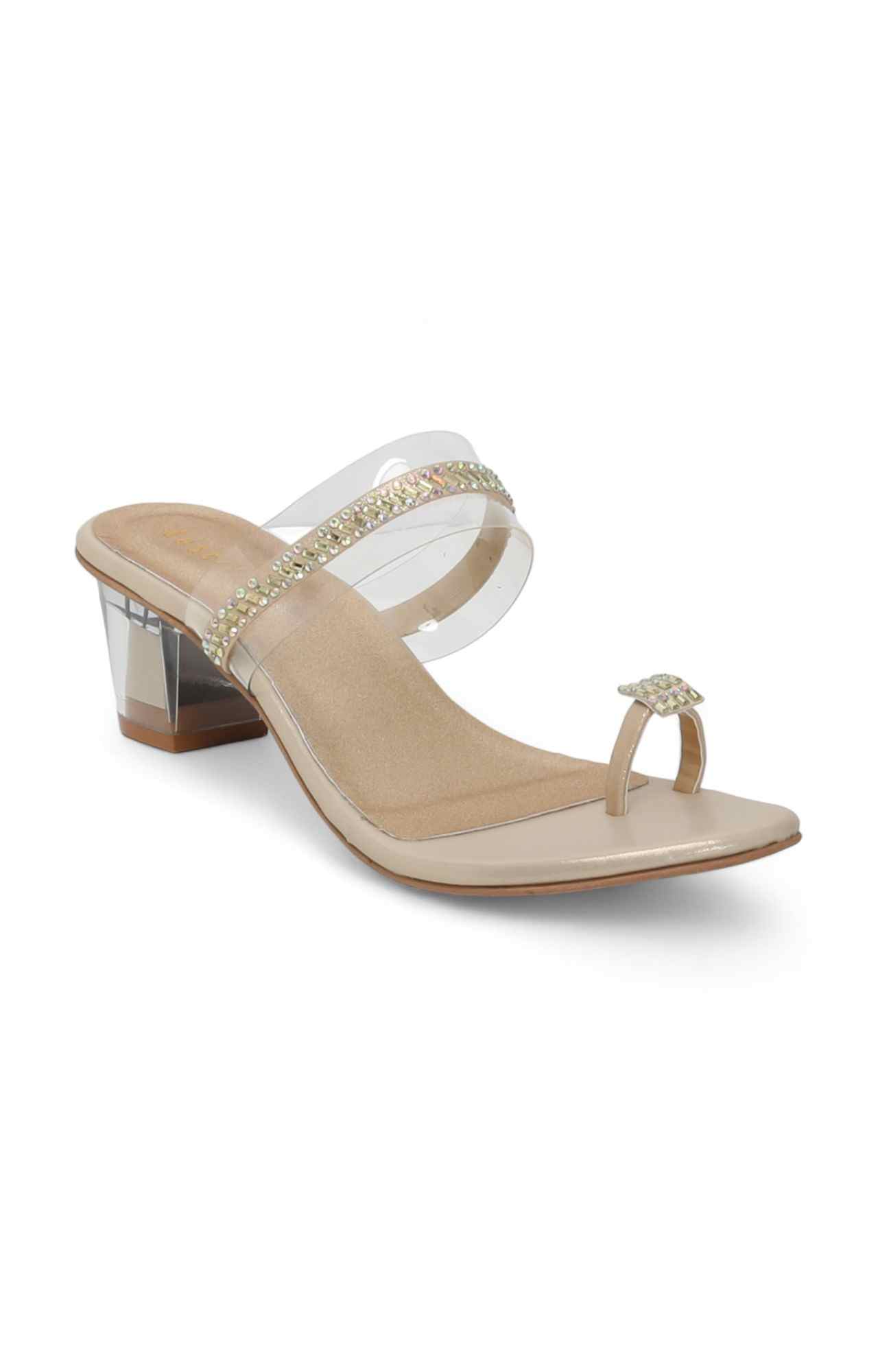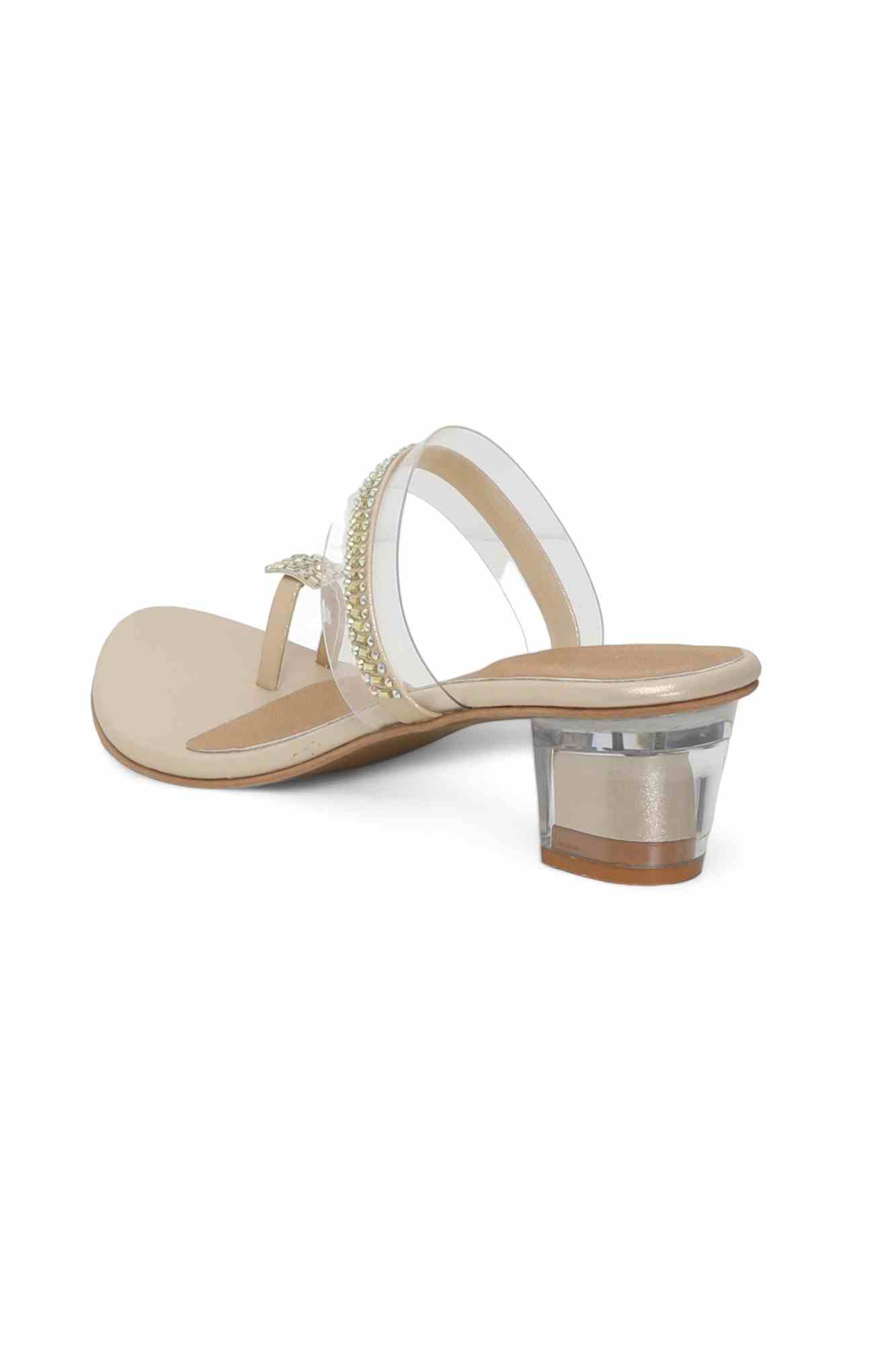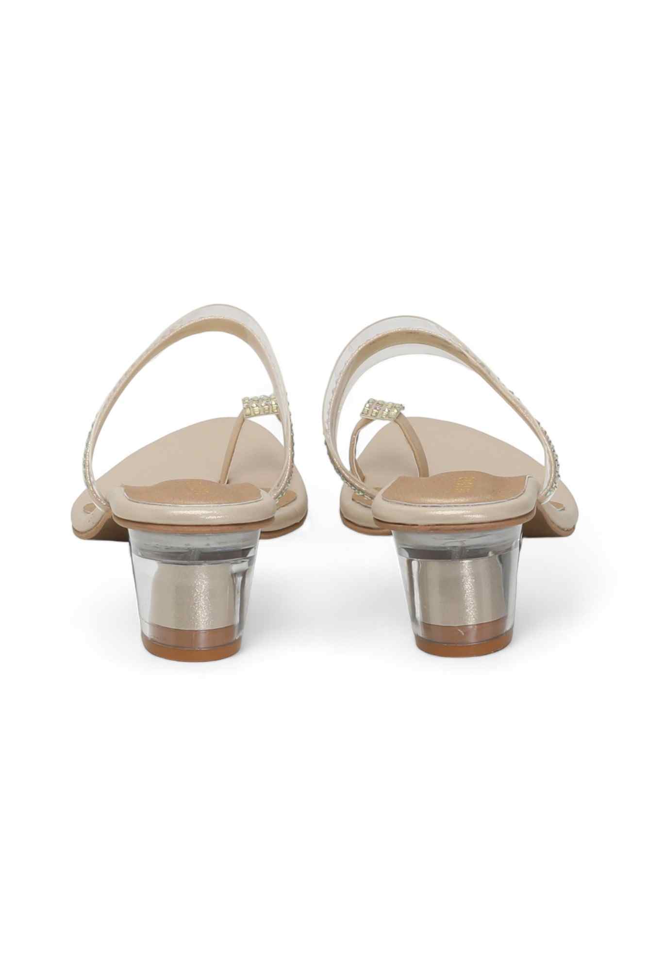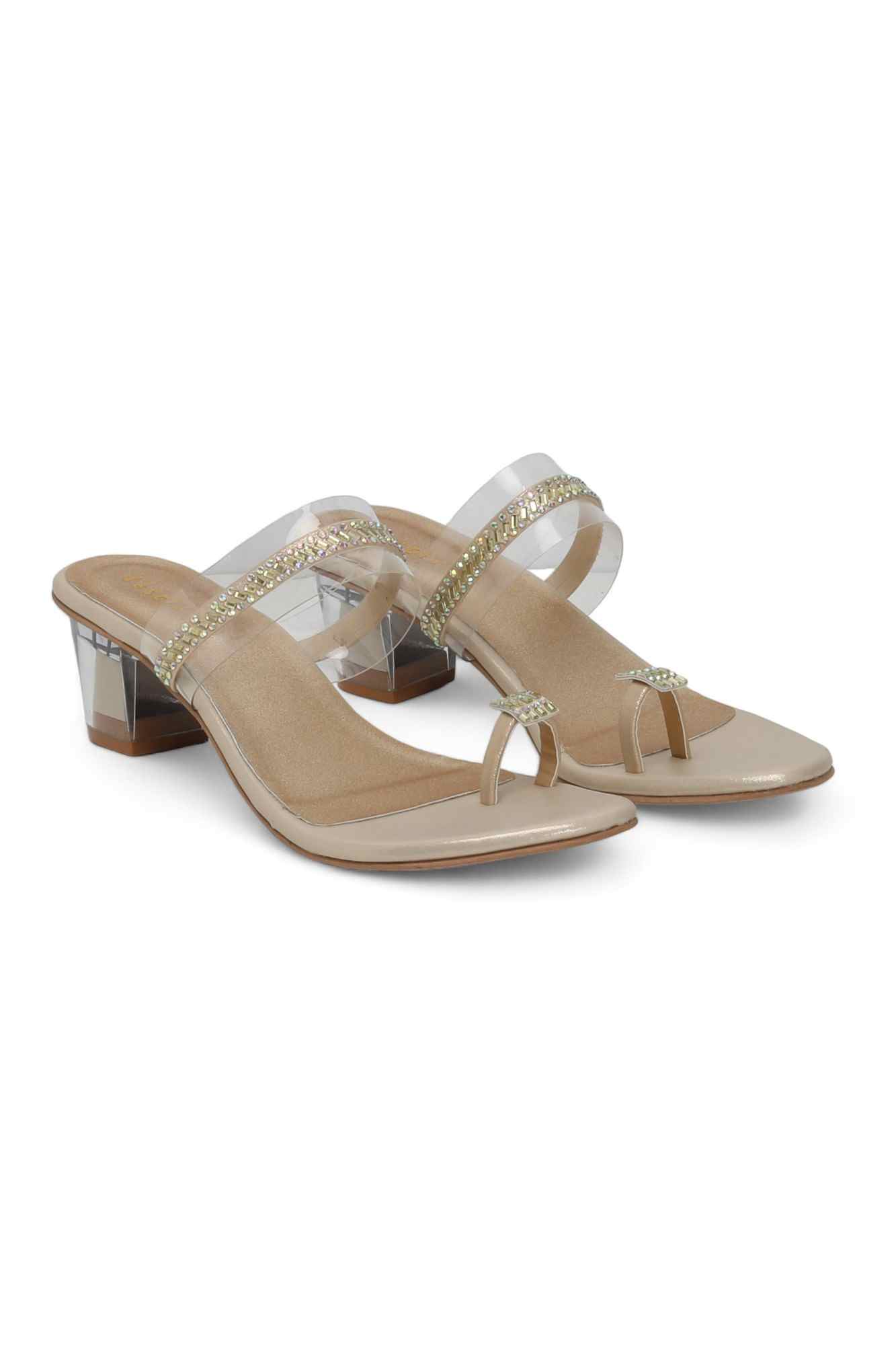 These Golden Crystal Toe-Ring Heels offer a captivating blend of modern design and dazzling elegance. They feature a chic transparent strap across the forefoot, adorned with shimmering rhinestones, and a matching embellished toe-ring, all set on a stylish clear acrylic block heel and a comfortable peach footbed, perfect for making a glamorous statement