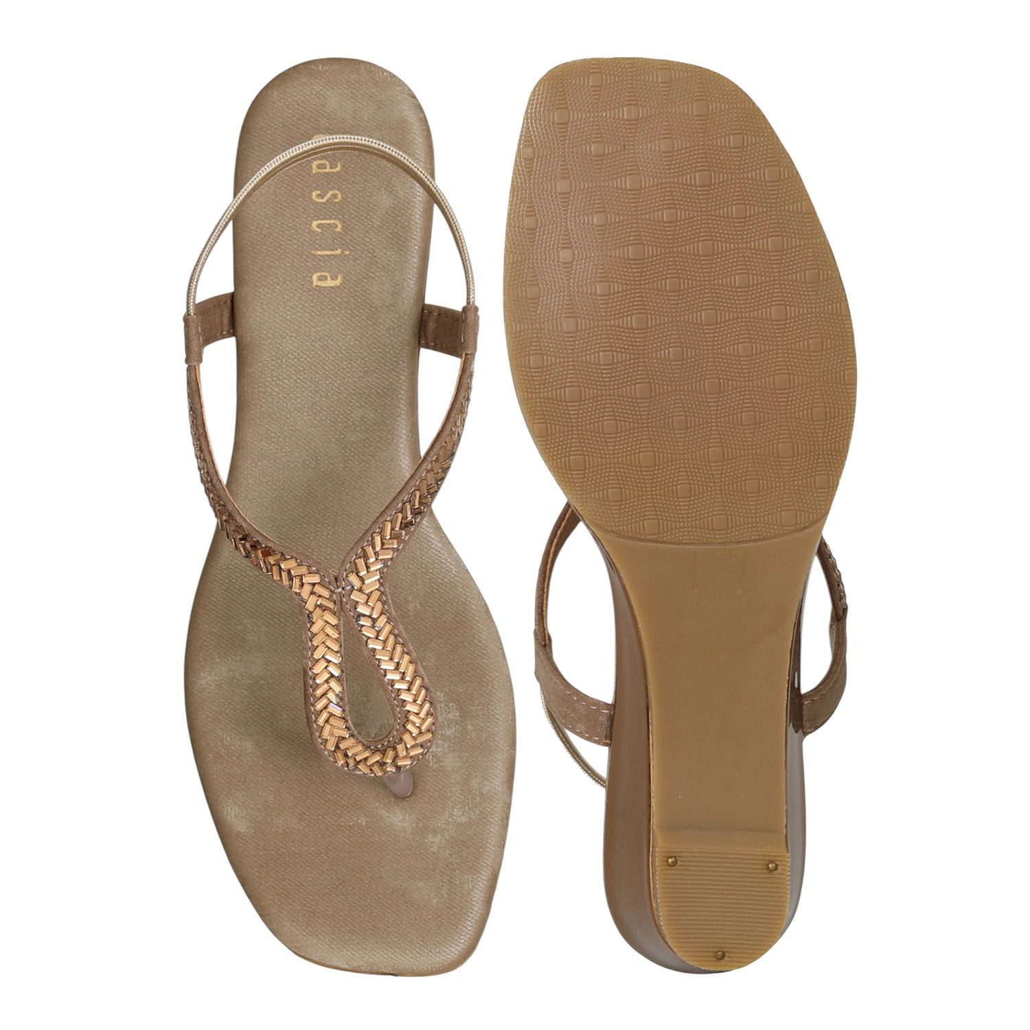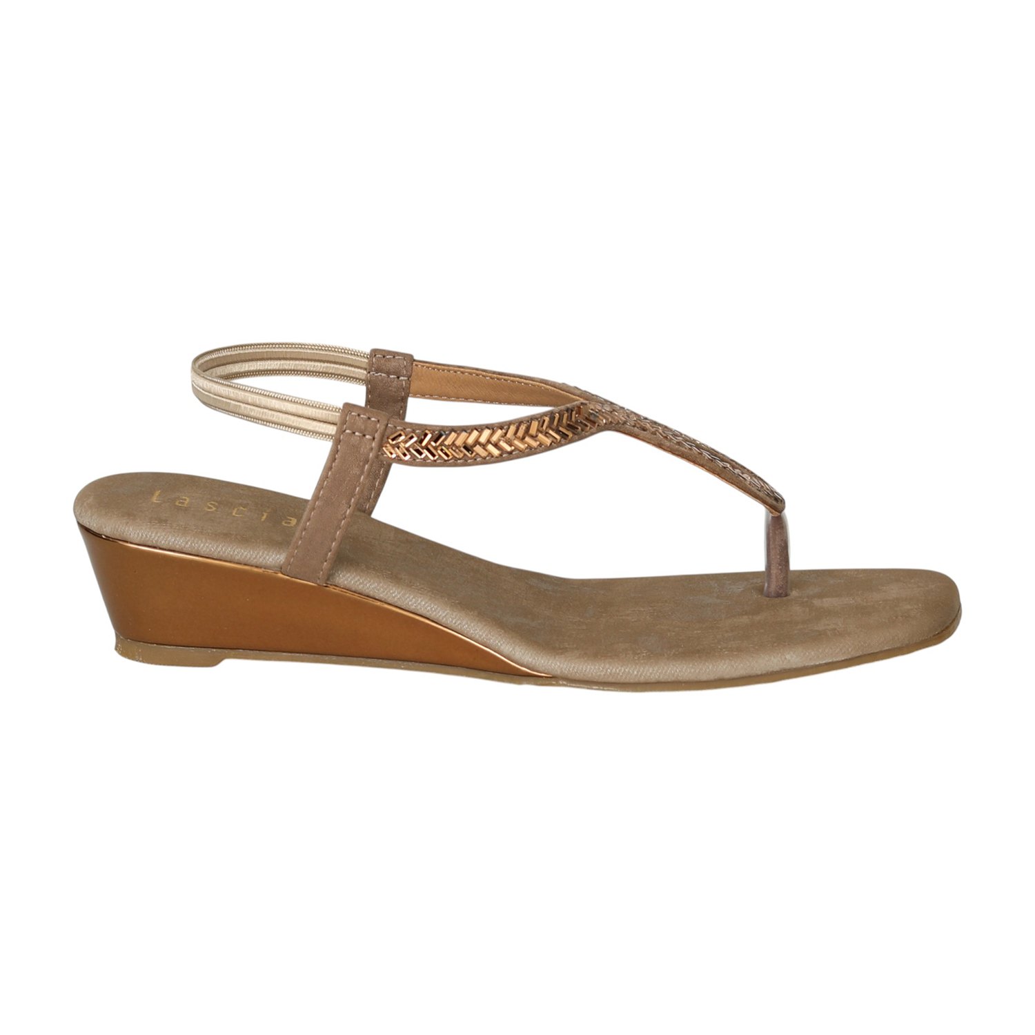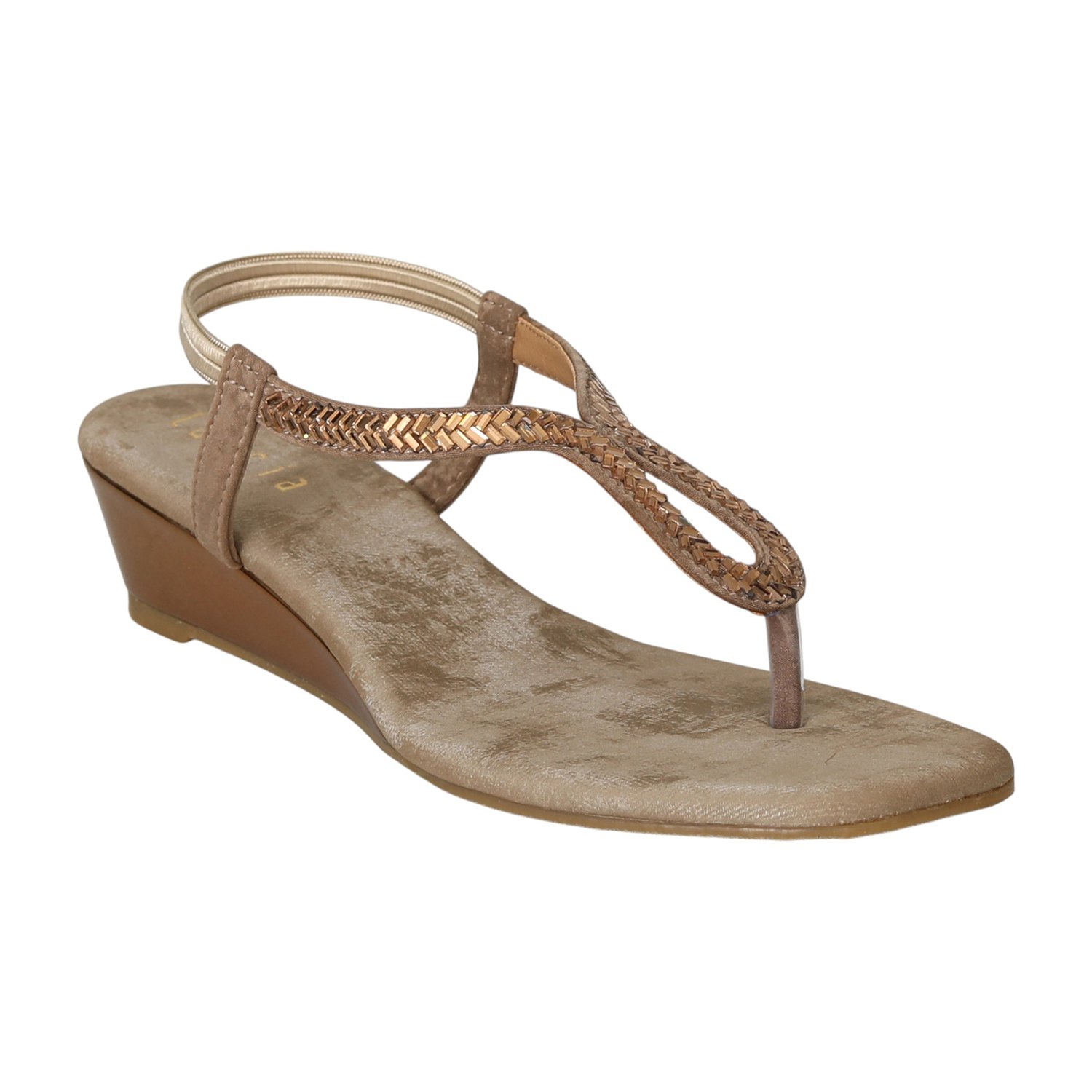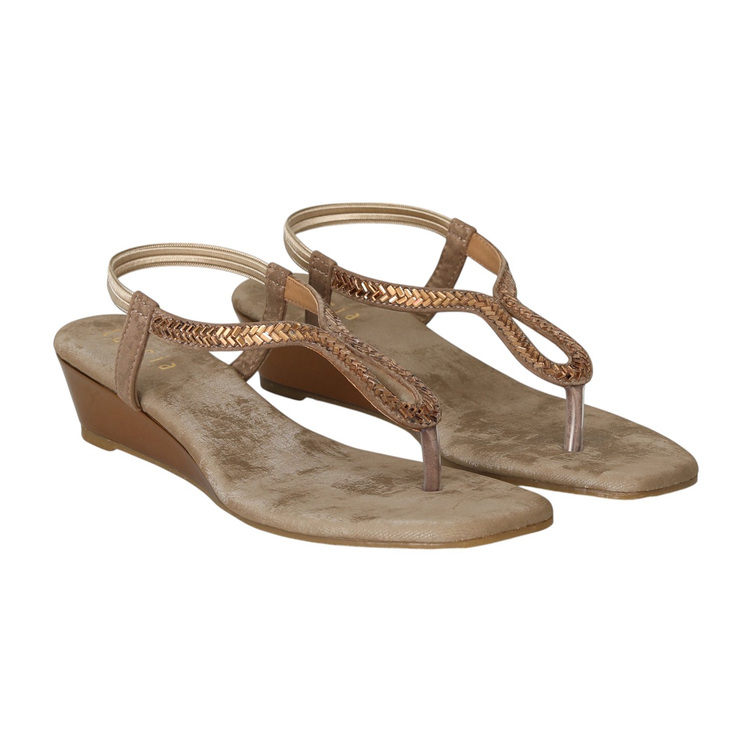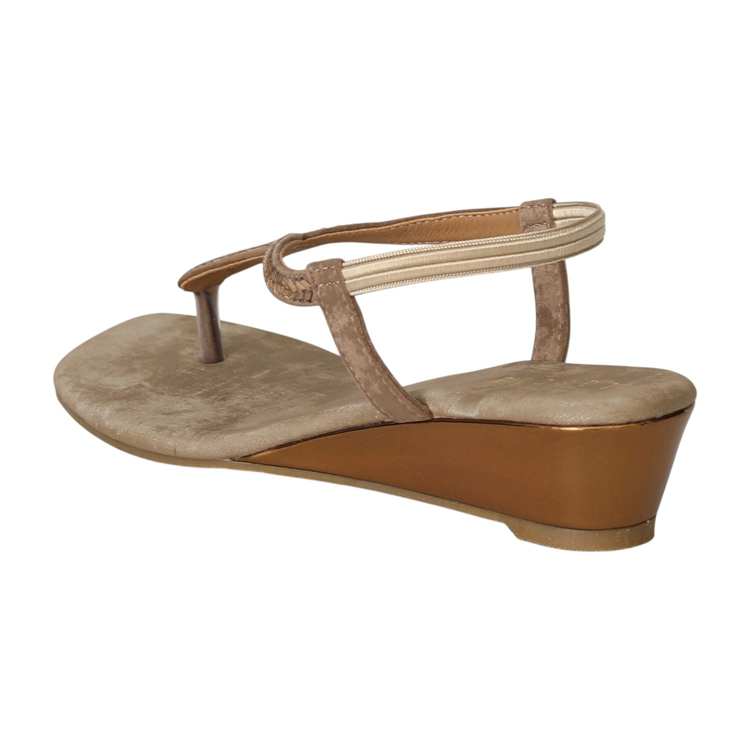 Elevate your ethnic or festive look with the timeless charm of the Golden Taupe T-Strap Wedges. Designed in a soft taupe base with golden embellishment on the sleek T-strap, these wedges strike the perfect balance between subtle shine and everyday elegance. The low wedge heel offers comfort with just the right lift, while the slingback strap ensures a secure fit for all-day wear.