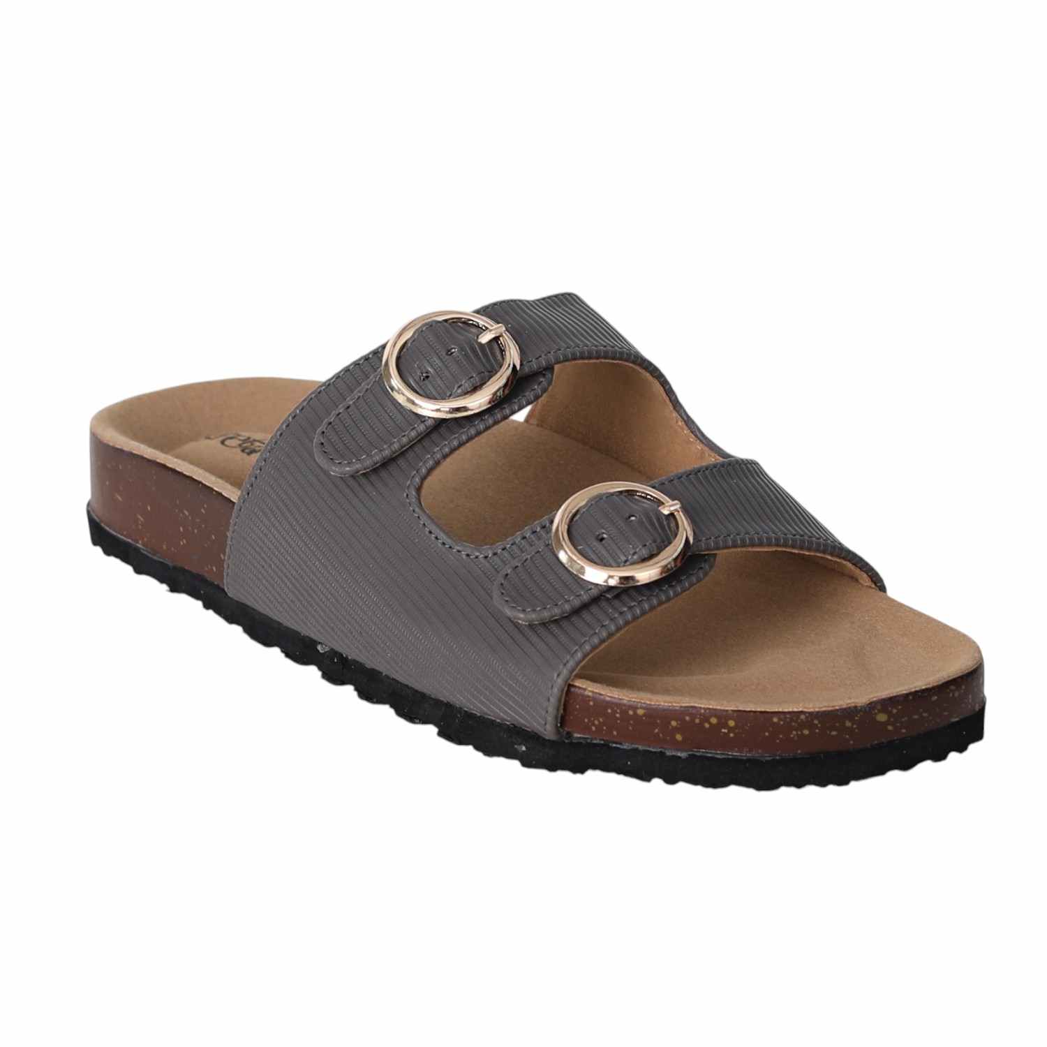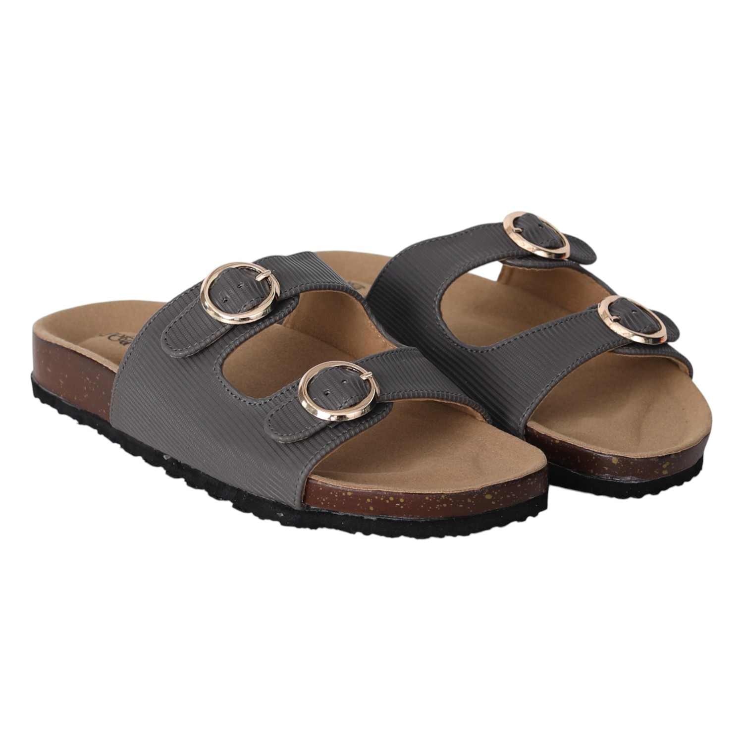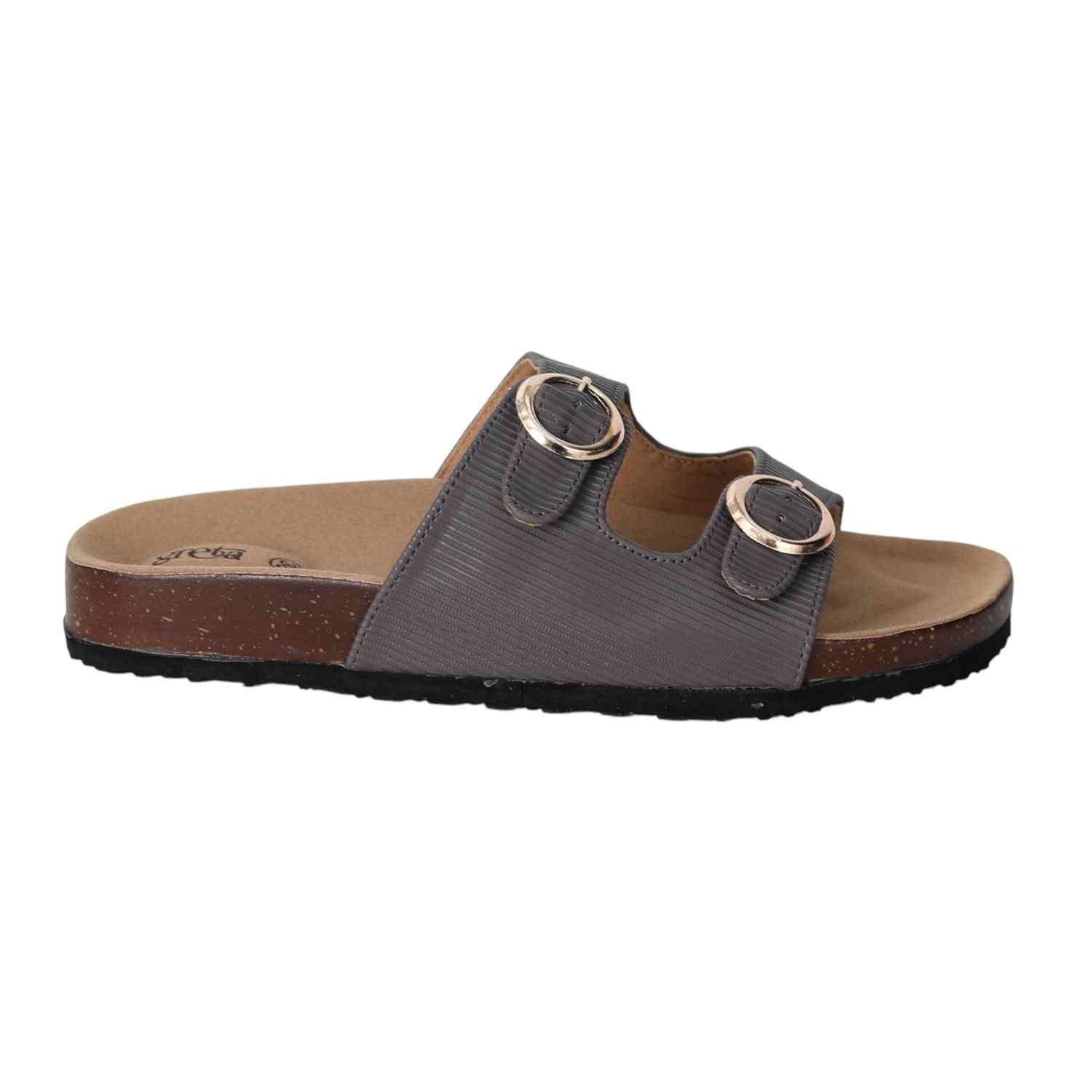 Stay effortlessly stylish and comfortable with these grey double buckle slide sandals for women. Featuring a contoured footbed and cork-textured sole, these sandals are designed for all-day support. The adjustable twin straps with metallic buckles offer a secure fit and add a touch of sophistication. Perfect for everyday wear