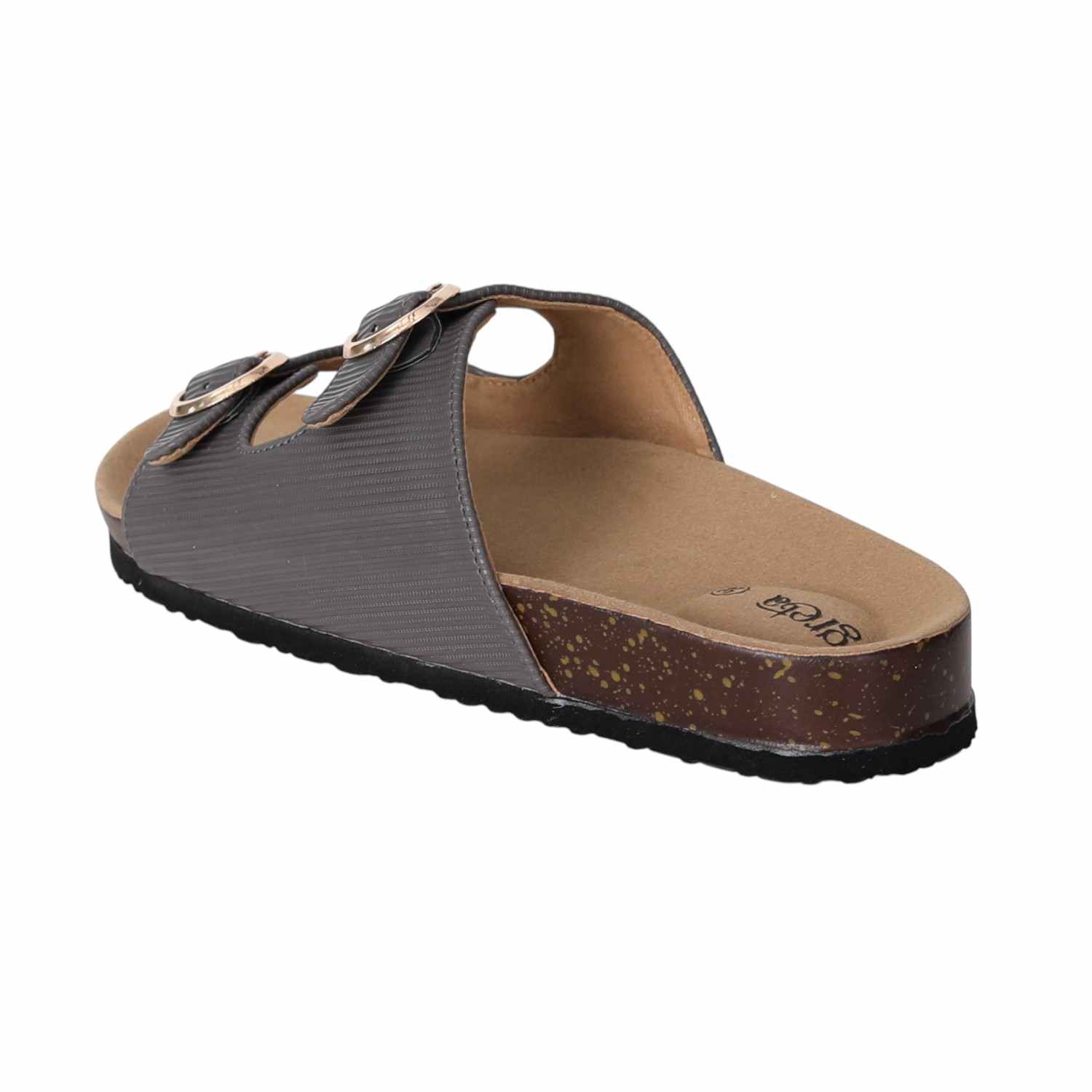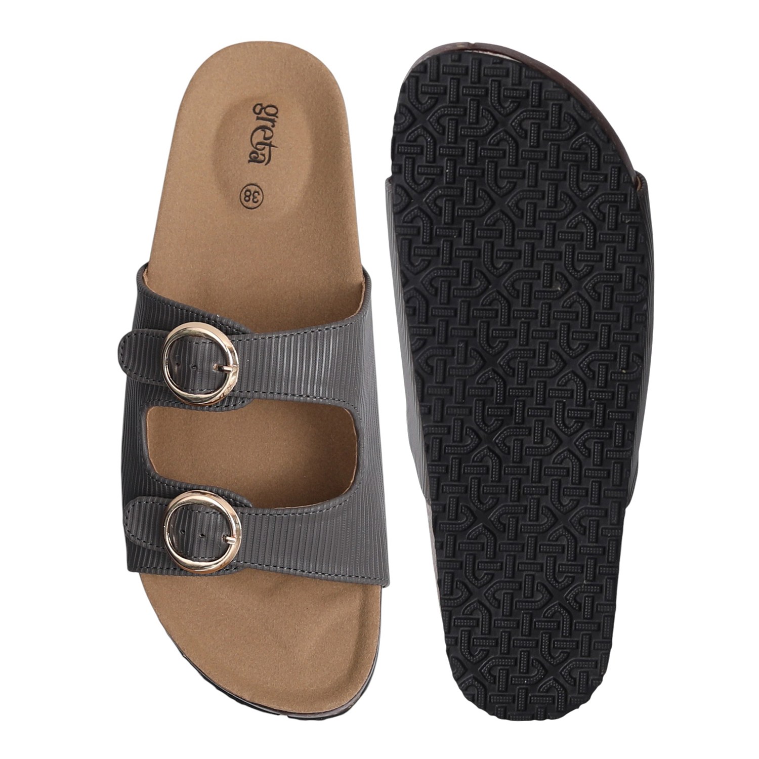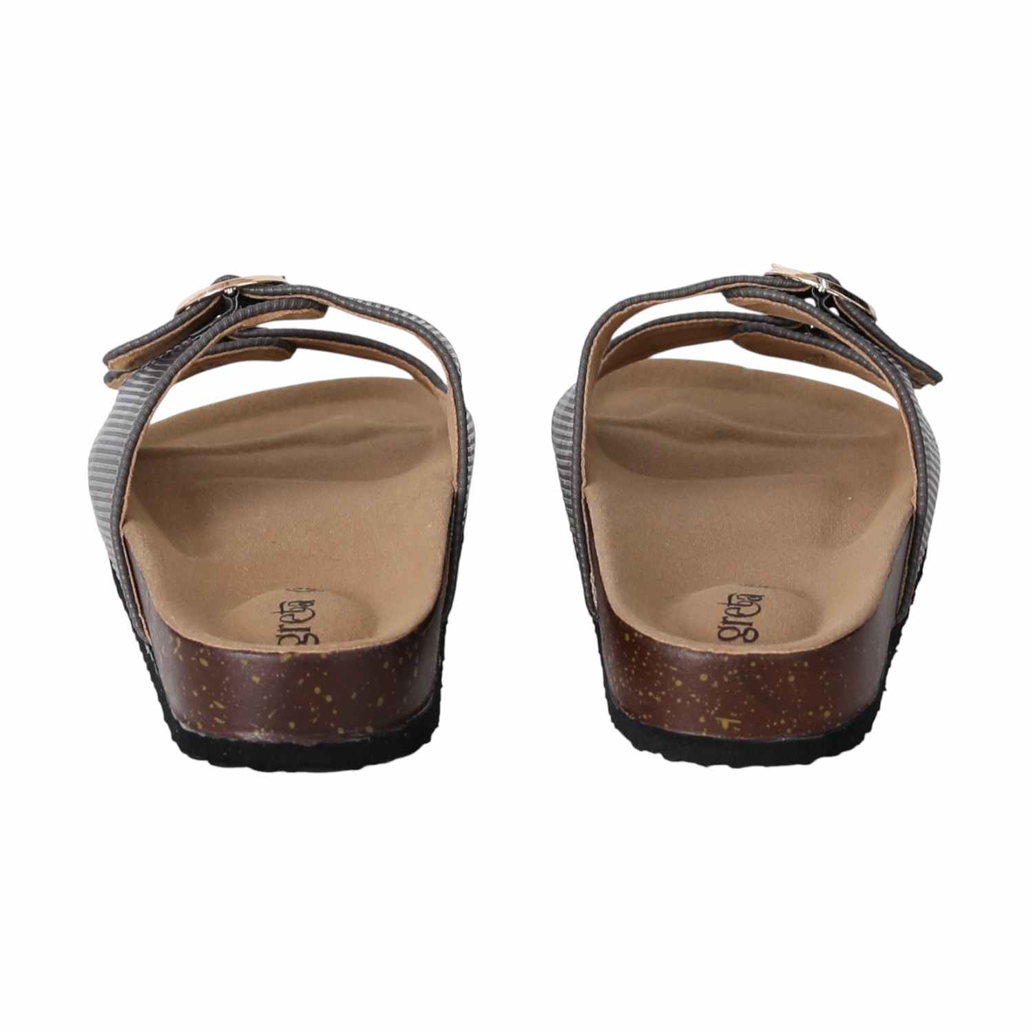 Stay effortlessly stylish and comfortable with these grey double buckle slide sandals for women. Featuring a contoured footbed and cork-textured sole, these sandals are designed for all-day support. The adjustable twin straps with metallic buckles offer a secure fit and add a touch of sophistication. Perfect for everyday wear
