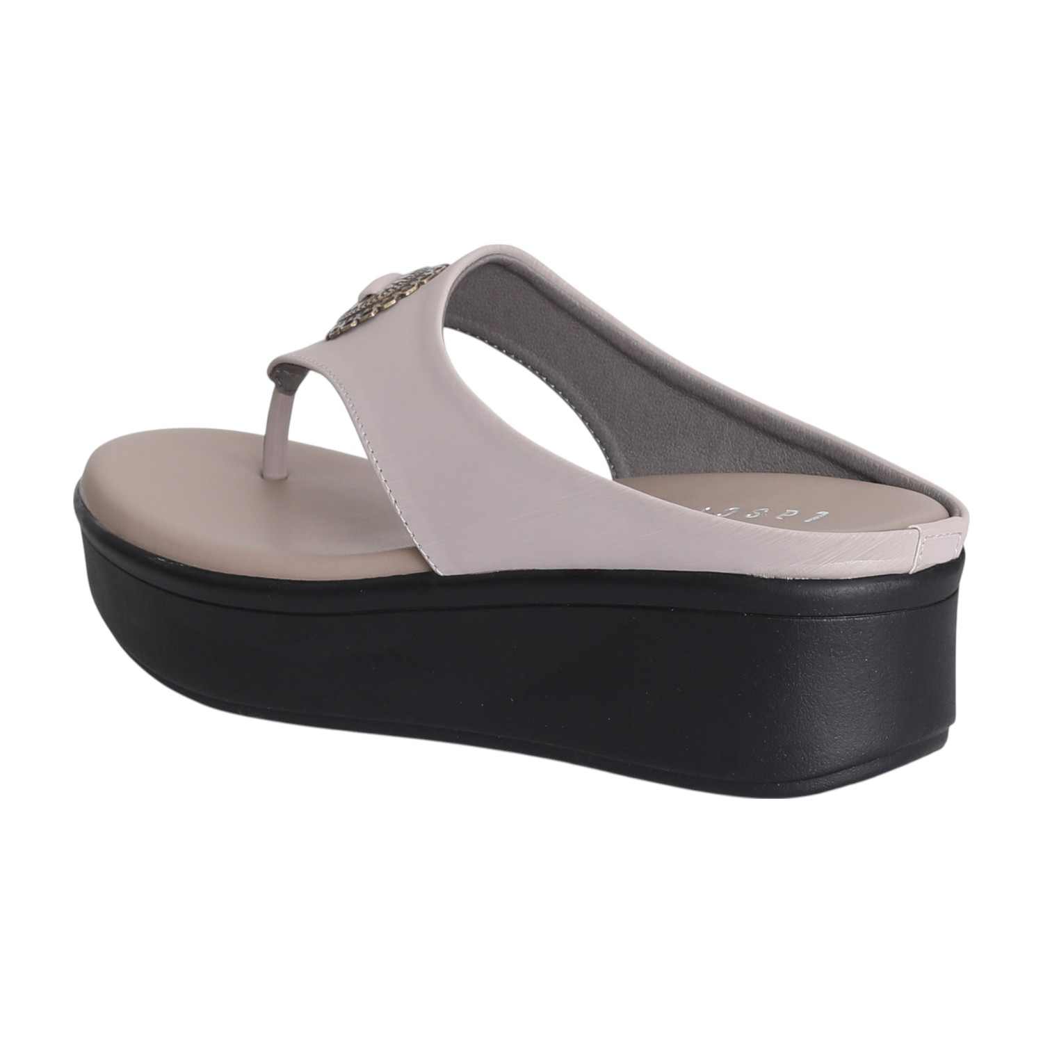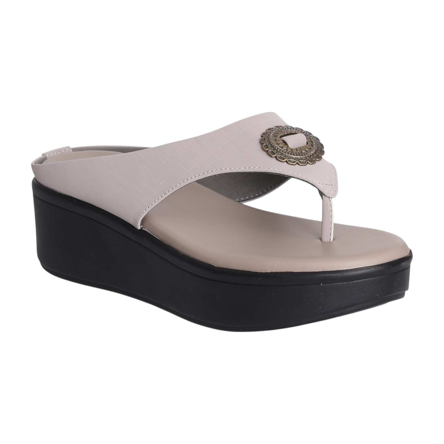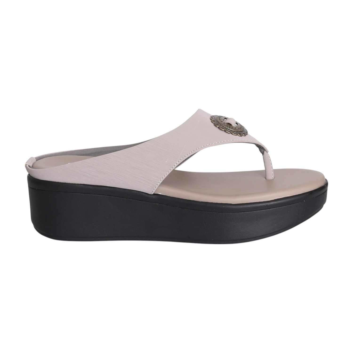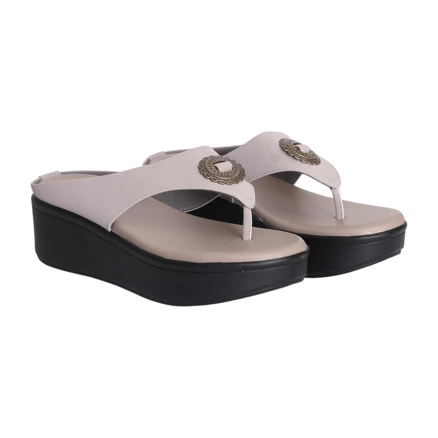 Elevate your everyday style with the Grey Medallion Platform Wedges. Crafted in a warm beige tone, these wedges feature a sleek platform sole that offers height without compromising on comfort. The broad upper strap is adorned with a vintage-style medallion embellishment, adding a touch of elegance to the modern silhouette. Whether paired with ethnic wear or casual outfits, these versatile thong wedges bring effortless charm and all-day ease to your step.