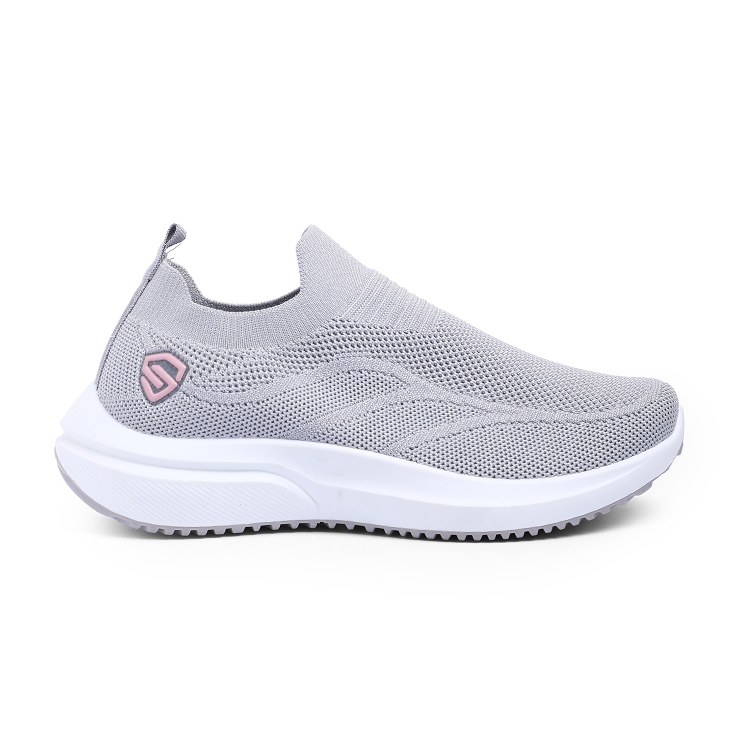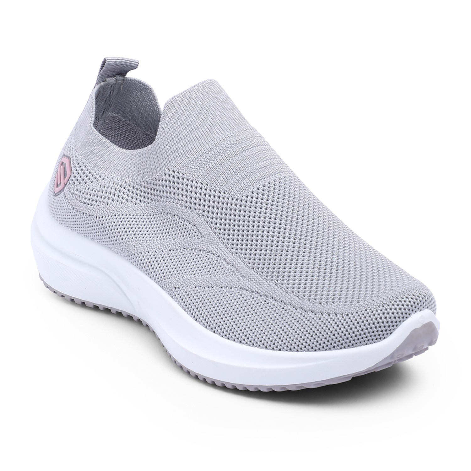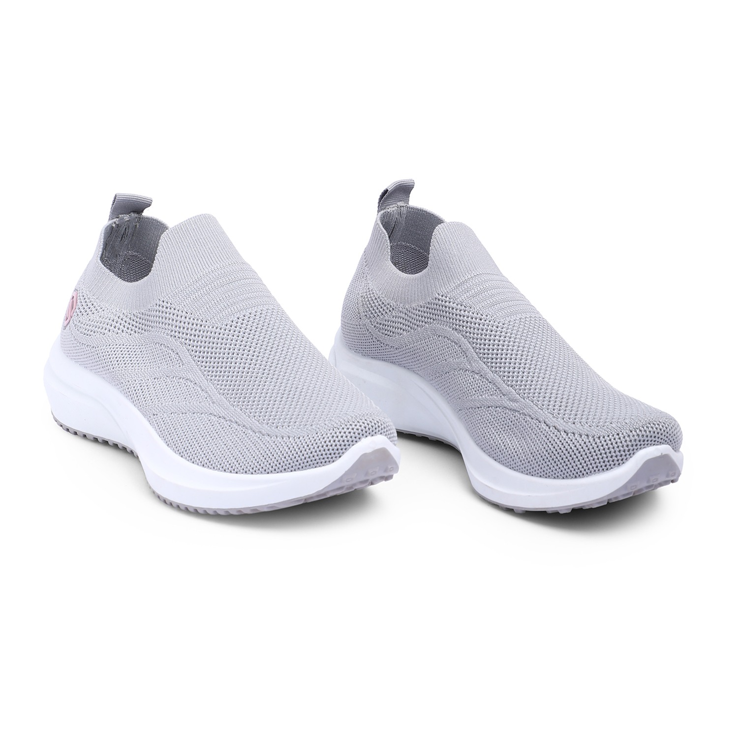 Discover effortless style and comfort with our Chic Grey Leisure Slip-Ons. These women's slip-on sneakers feature a breathable knit upper in a versatile light grey, offering a sleek and flexible fit. A subtle pink circular accent with a white logo on the side adds a touch of modern charm. Designed for ultimate ease, they boast a comfortable white sole with a textured bottom for reliable grip. Perfect for relaxed outings, light activities, or adding a minimalist yet chic touch to your everyday wardrobe