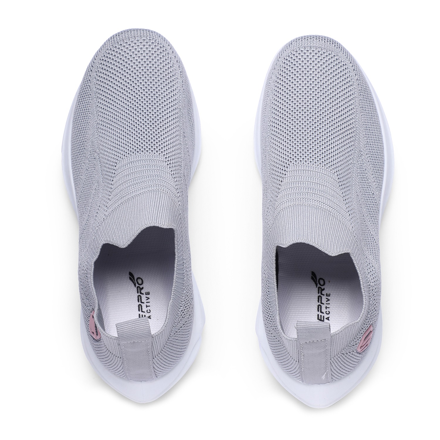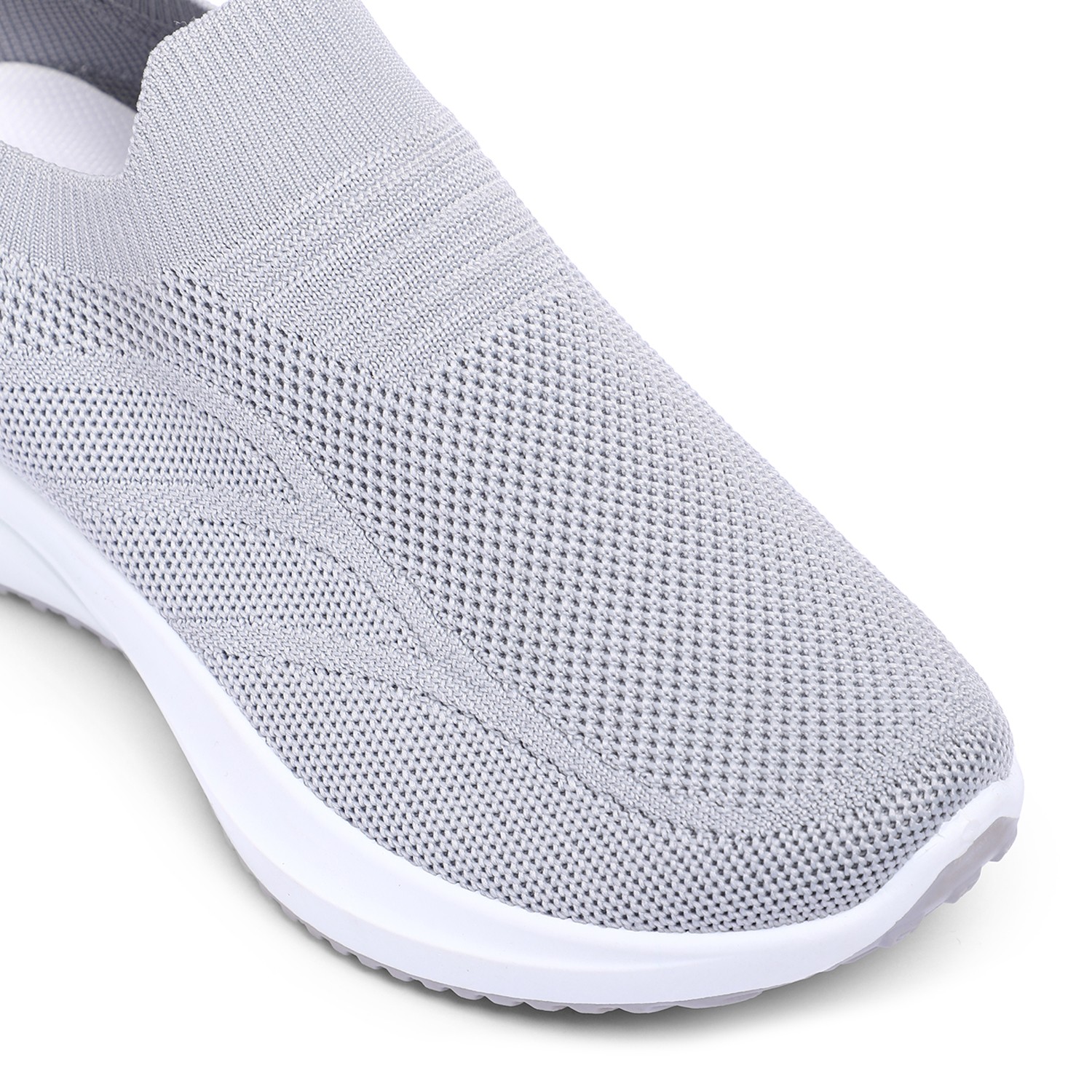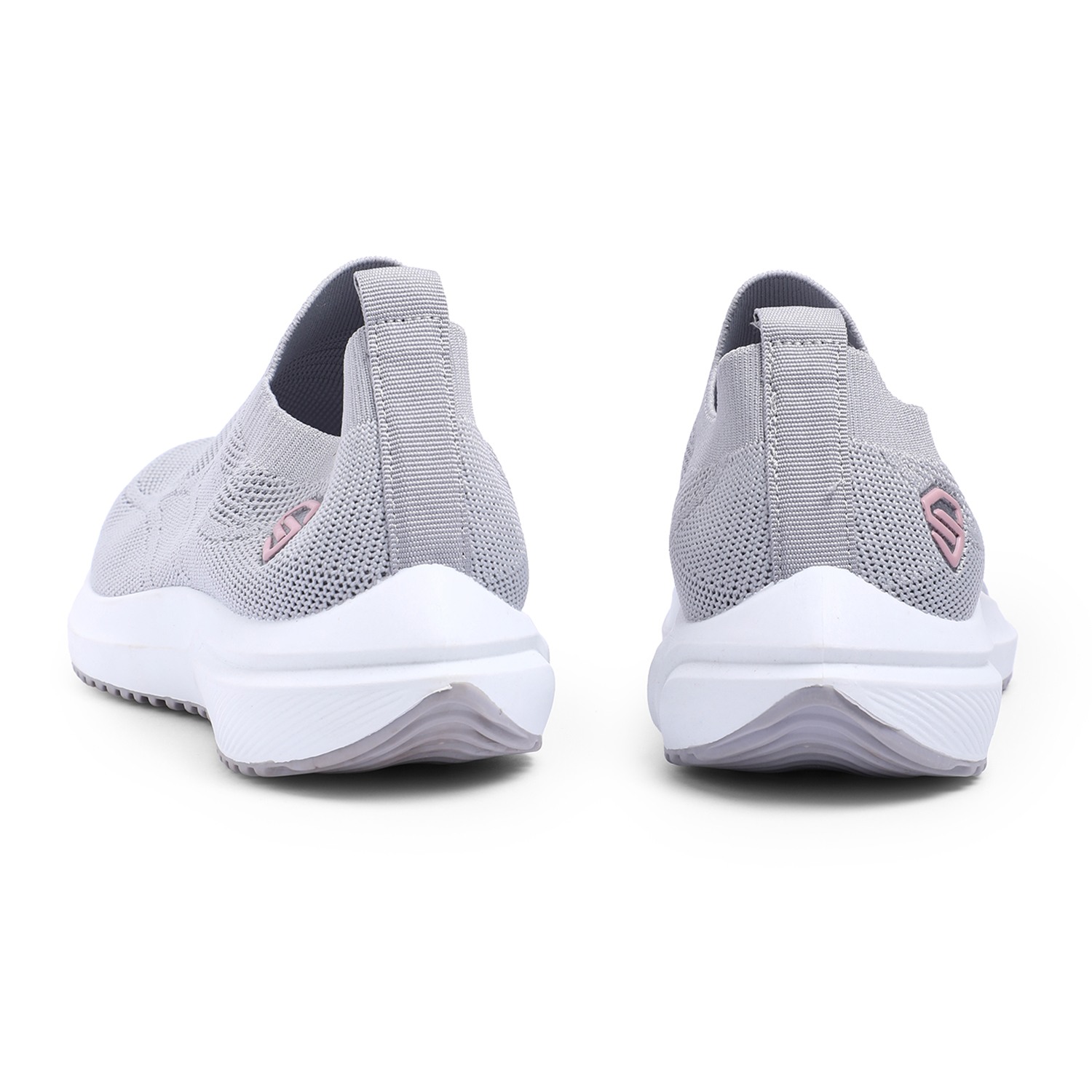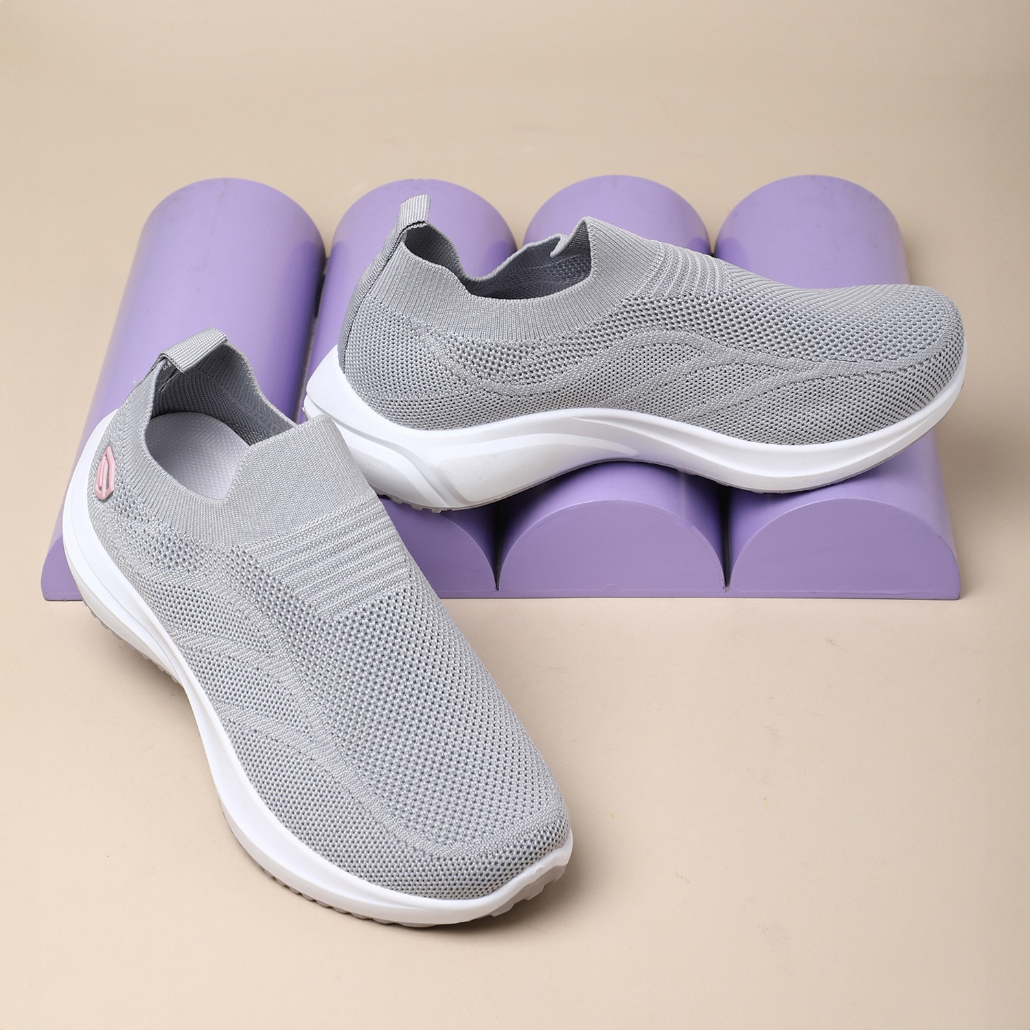 Discover effortless style and comfort with our Chic Grey Leisure Slip-Ons. These women's slip-on sneakers feature a breathable knit upper in a versatile light grey, offering a sleek and flexible fit. A subtle pink circular accent with a white logo on the side adds a touch of modern charm. Designed for ultimate ease, they boast a comfortable white sole with a textured bottom for reliable grip. Perfect for relaxed outings, light activities, or adding a minimalist yet chic touch to your everyday wardrobe