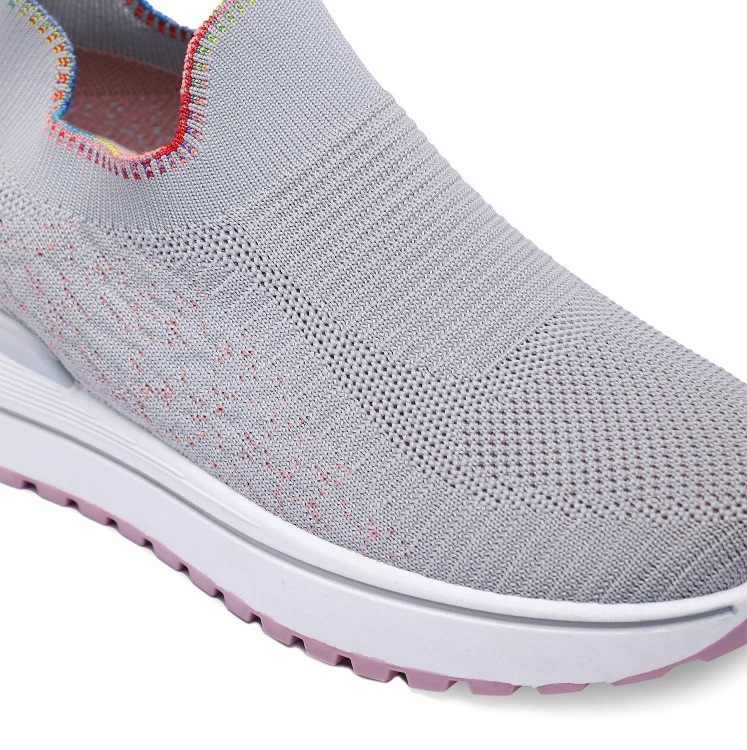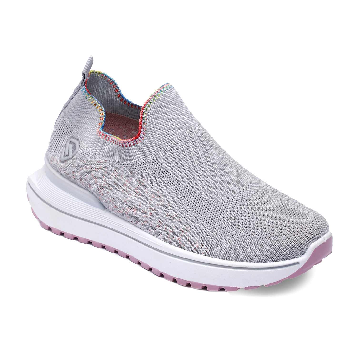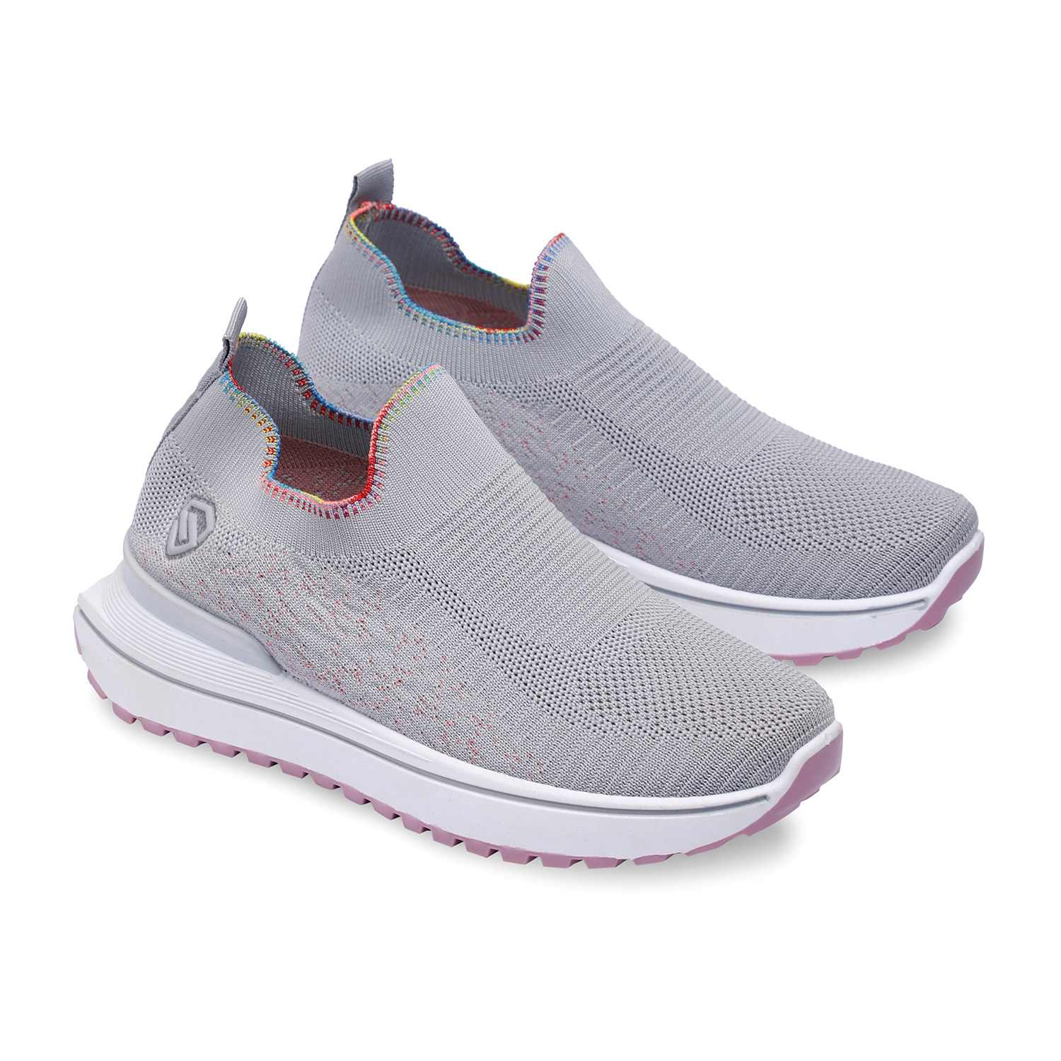 Unleash your vibrant side with our Active Grey Sprinkle Knitters. These dynamic women's slip-on sneakers feature a breathable Grey knit upper, uniquely accented with scattered Pink speckles or dots for a playful 'sprinkle' effect. A distinctive rainbow-colored trim elegantly frames the ankle opening, adding a lively pop of color. Complete with a thick white sole and contrasting pink outsole, these knitters provide exceptional comfort, reliable grip, and a standout style for all your active pursuits