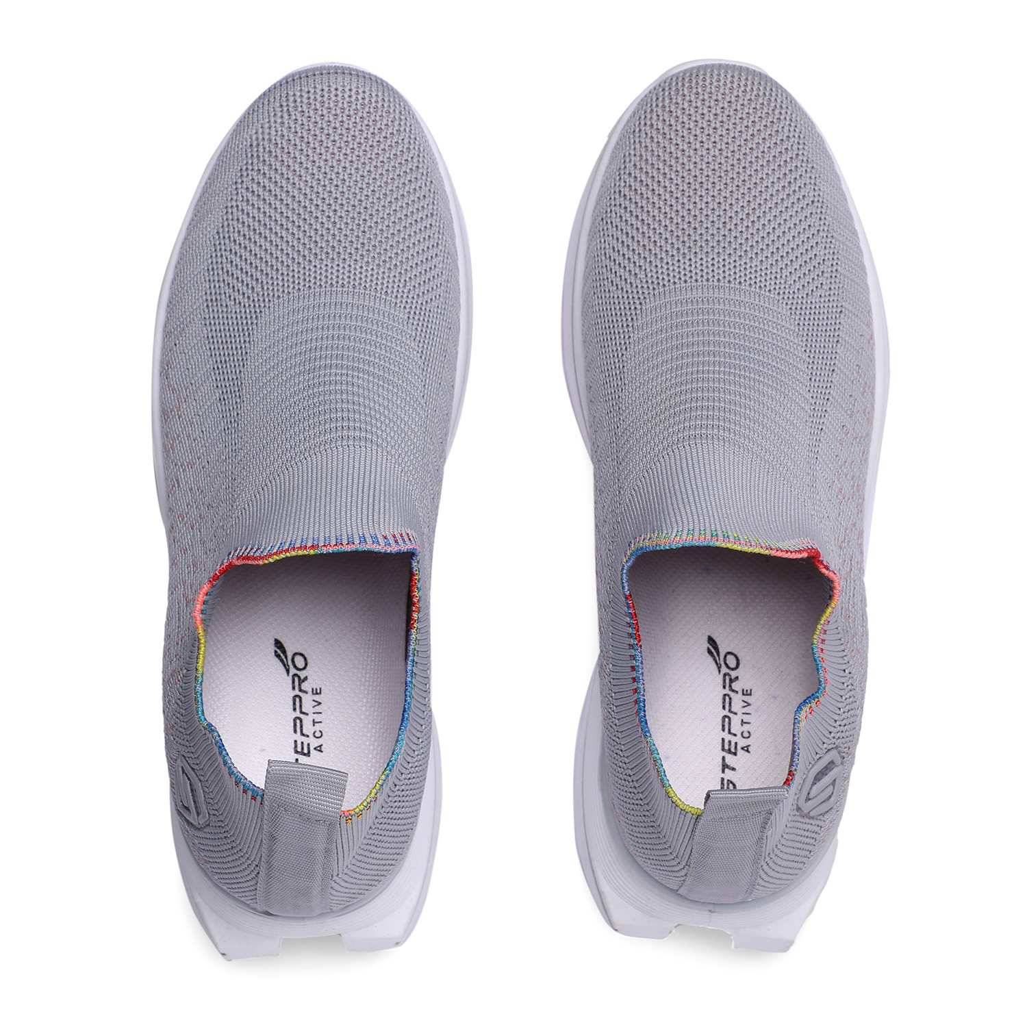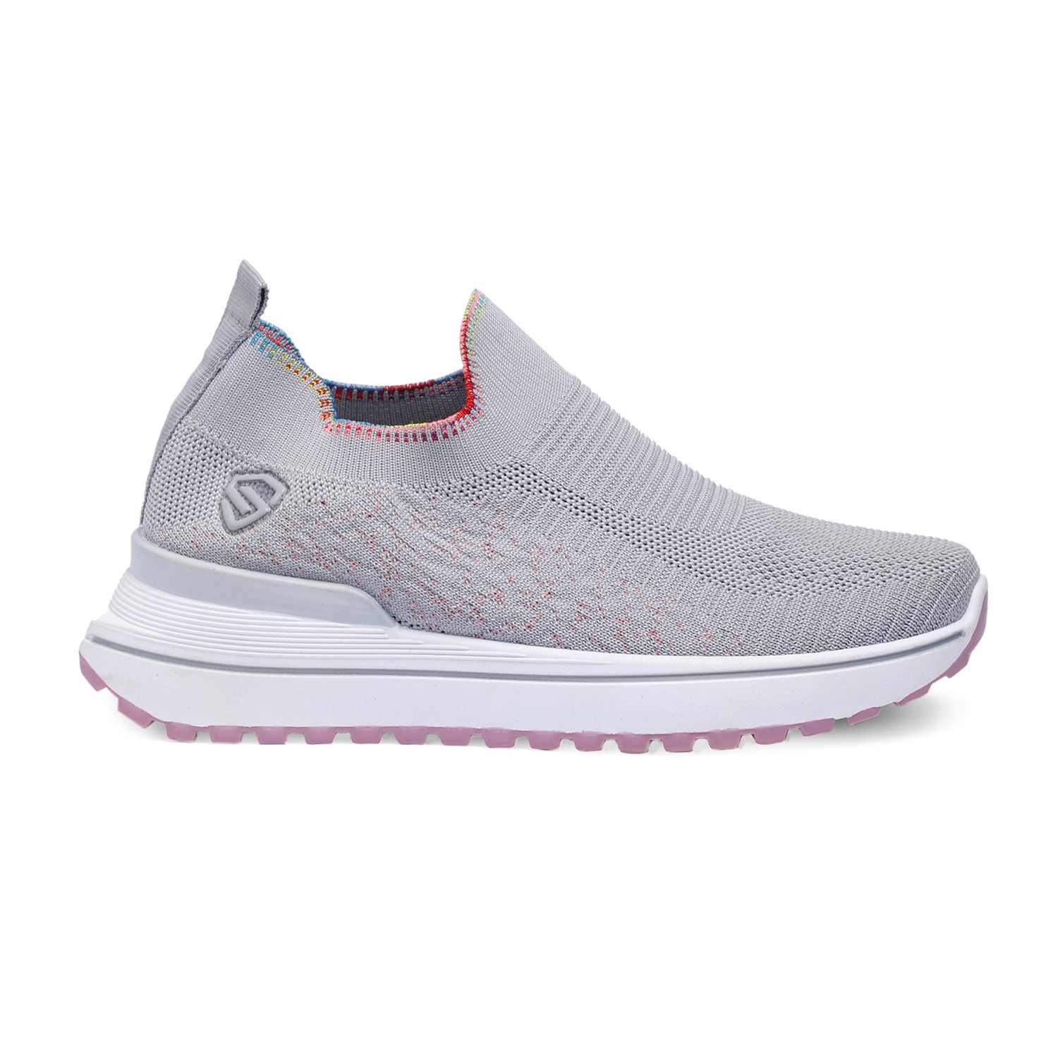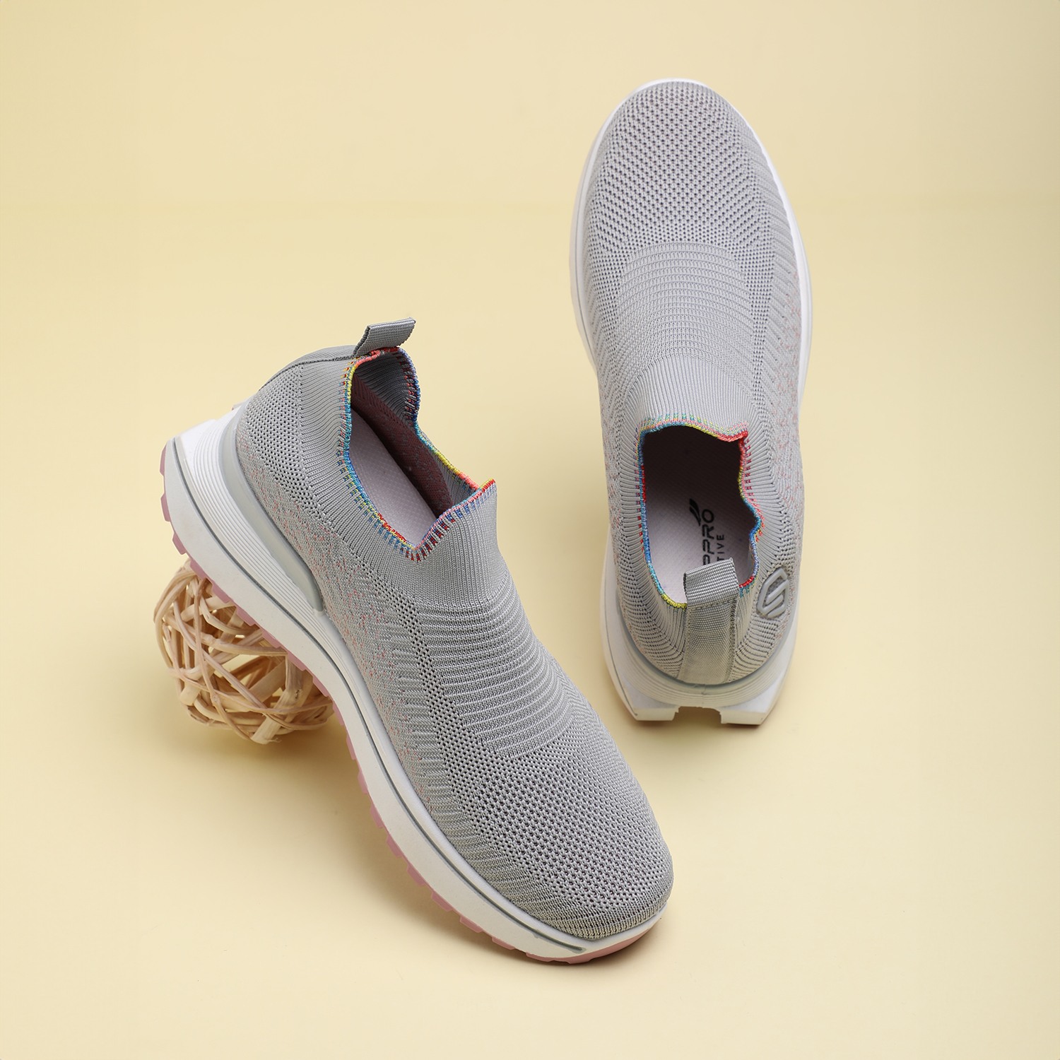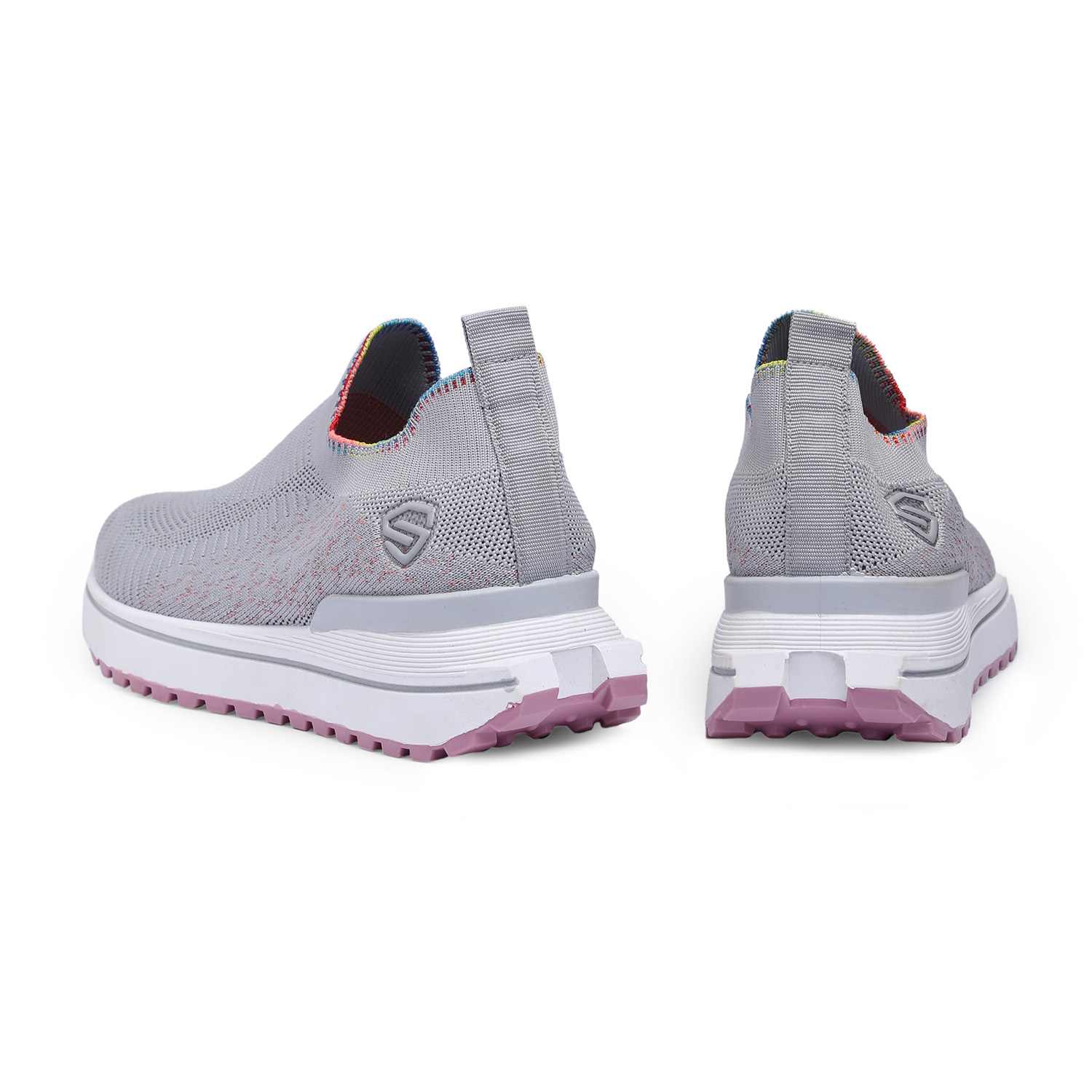 Unleash your vibrant side with our Active Grey Sprinkle Knitters. These dynamic women's slip-on sneakers feature a breathable Grey knit upper, uniquely accented with scattered Pink speckles or dots for a playful 'sprinkle' effect. A distinctive rainbow-colored trim elegantly frames the ankle opening, adding a lively pop of color. Complete with a thick white sole and contrasting pink outsole, these knitters provide exceptional comfort, reliable grip, and a standout style for all your active pursuits