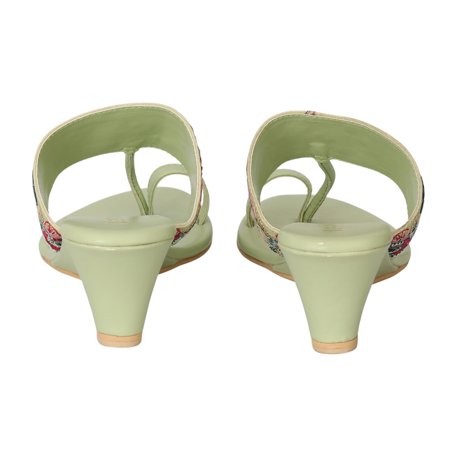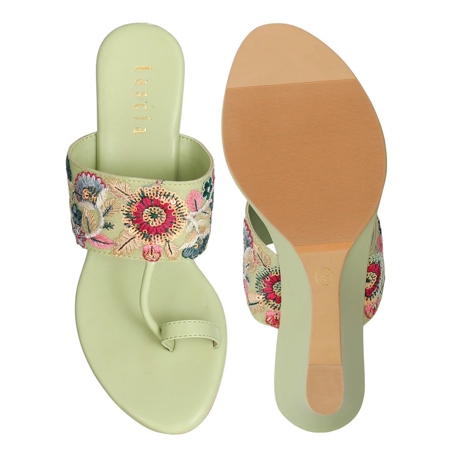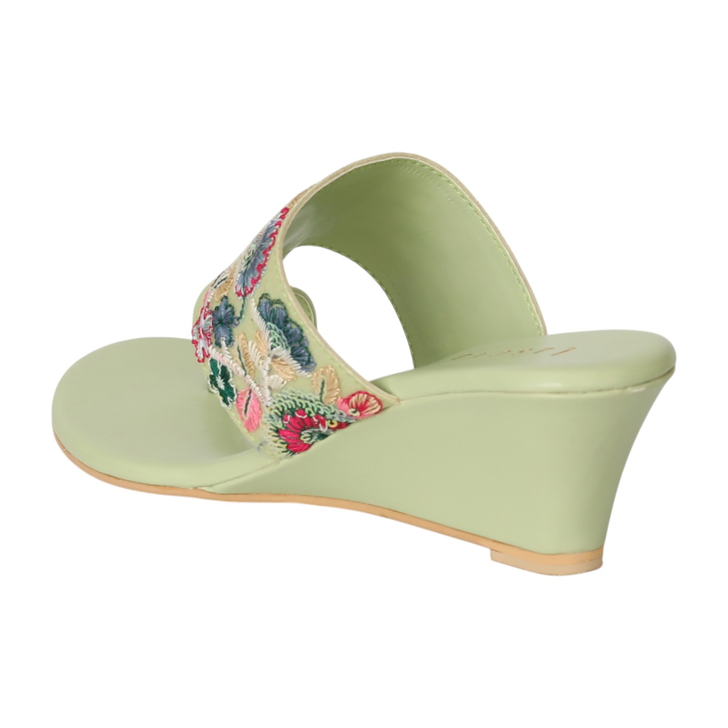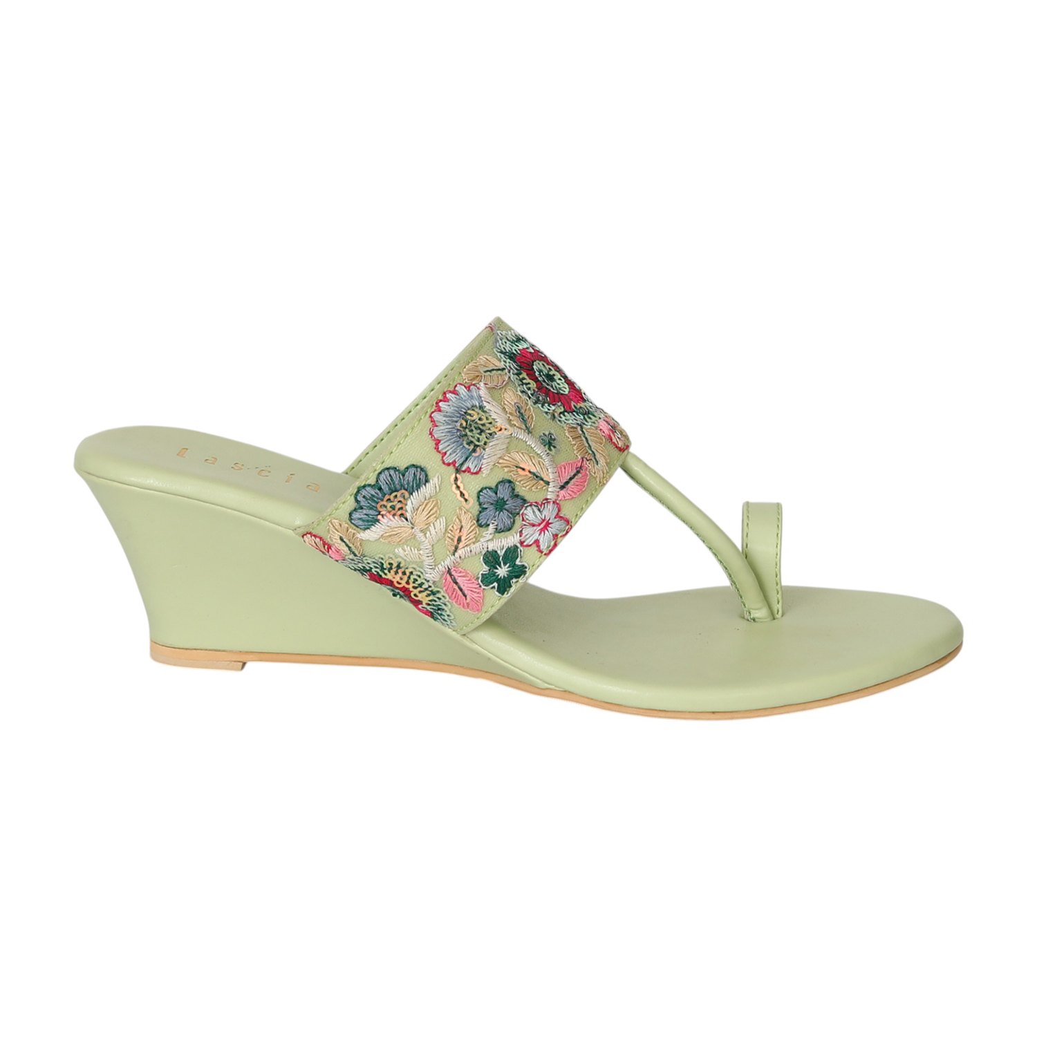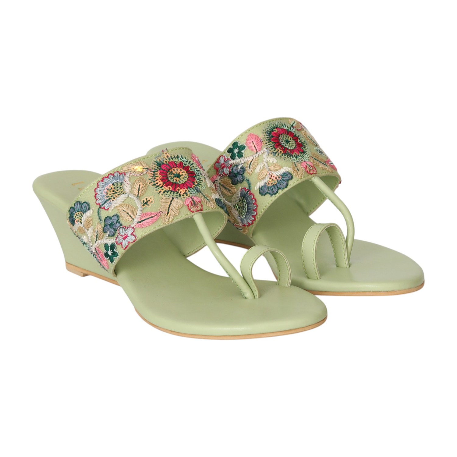 Step into effortless elegance with the Mint Floral Grace Wedges. Designed in a soft mint green tone, these wedges feature intricate multicolor floral embroidery on a wide front strap, blending ethnic charm with modern comfort. The gentle wedge heel provides just the right lift for all-day wear, while the toe-post design ensures a secure and stylish fit. Perfect for festive occasions, family gatherings, or ethnic day-outs.