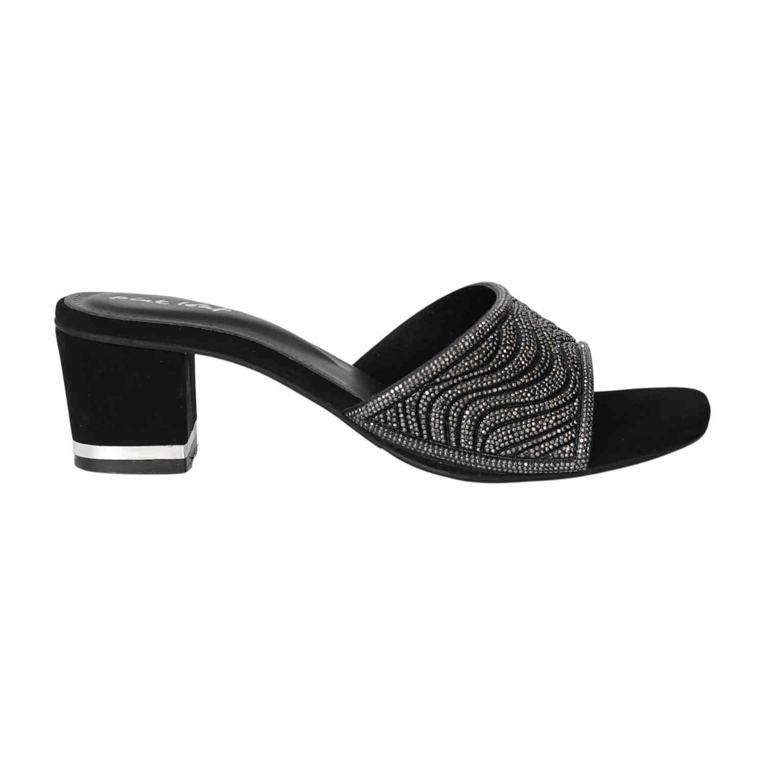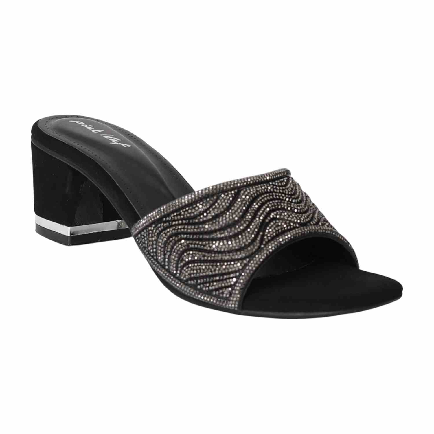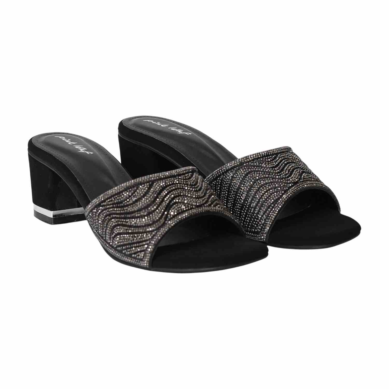 These heels combine a modern, edgy style with a touch of glamour. The shimmering strap in a gunmetal tone features a bold wave-like pattern that catches the light. The secure mule silhouette and comfortable block heel make them a confident and stylish statement piece for any evening look.