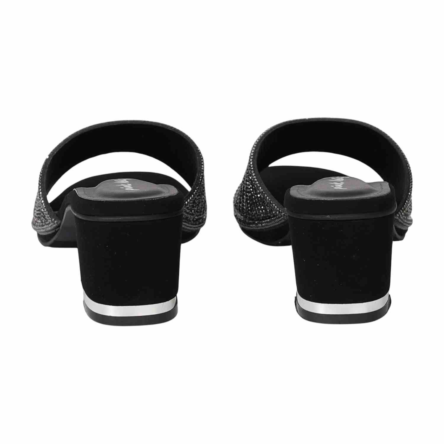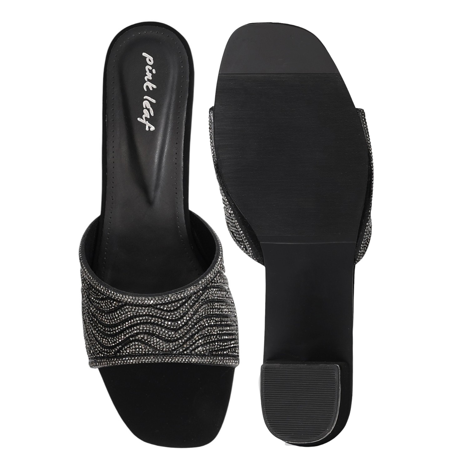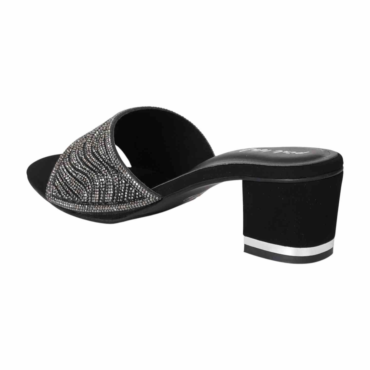 These heels combine a modern, edgy style with a touch of glamour. The shimmering strap in a gunmetal tone features a bold wave-like pattern that catches the light. The secure mule silhouette and comfortable block heel make them a confident and stylish statement piece for any evening look.