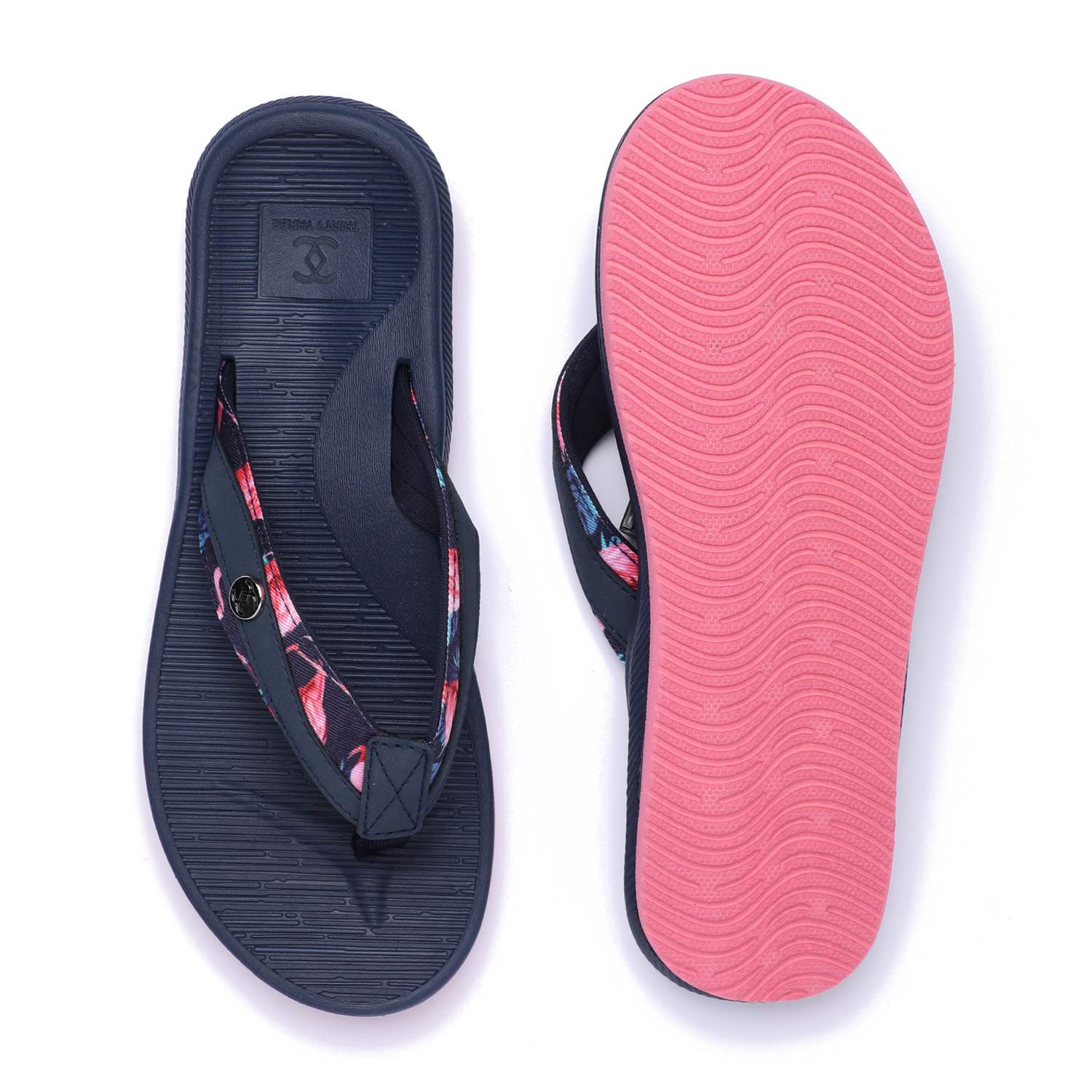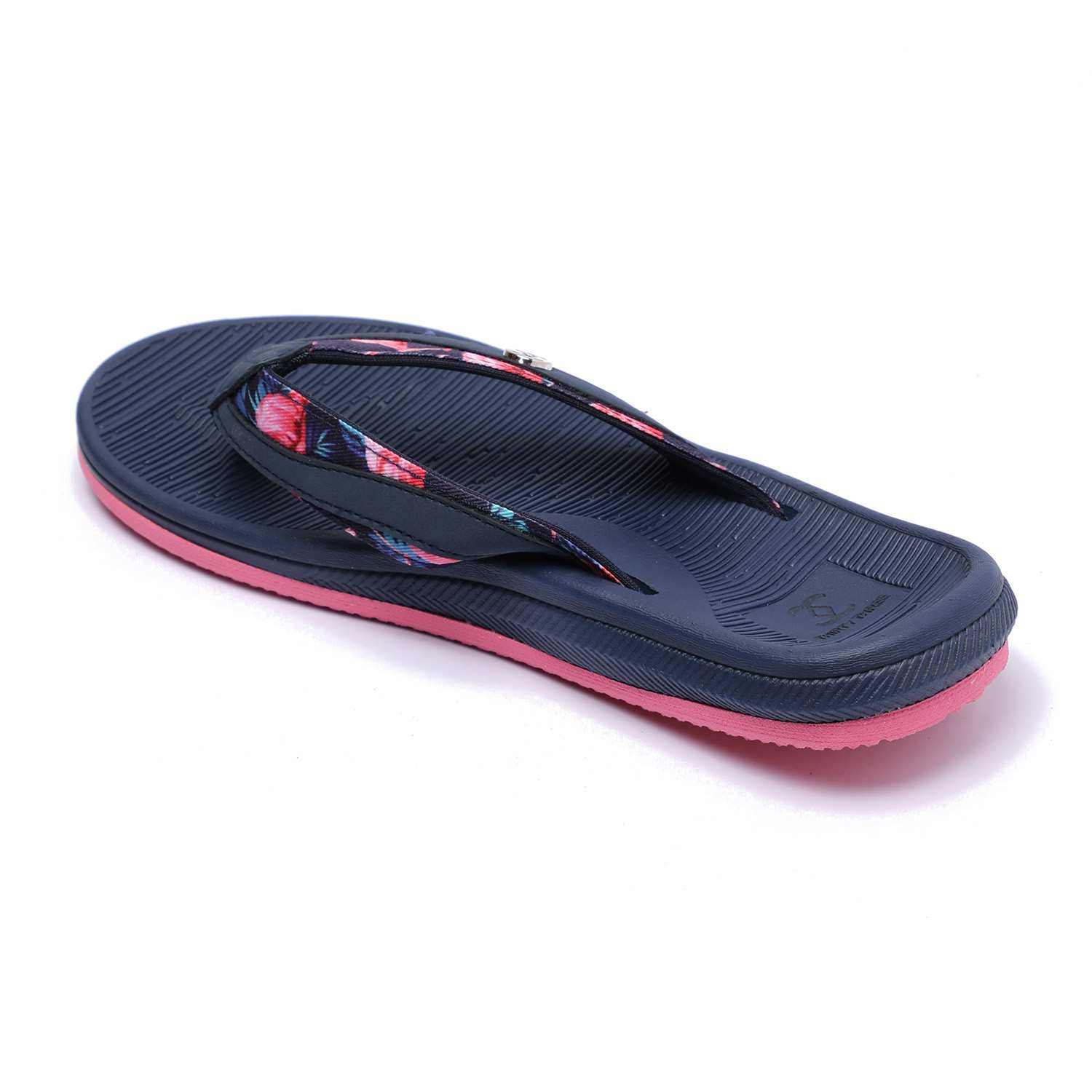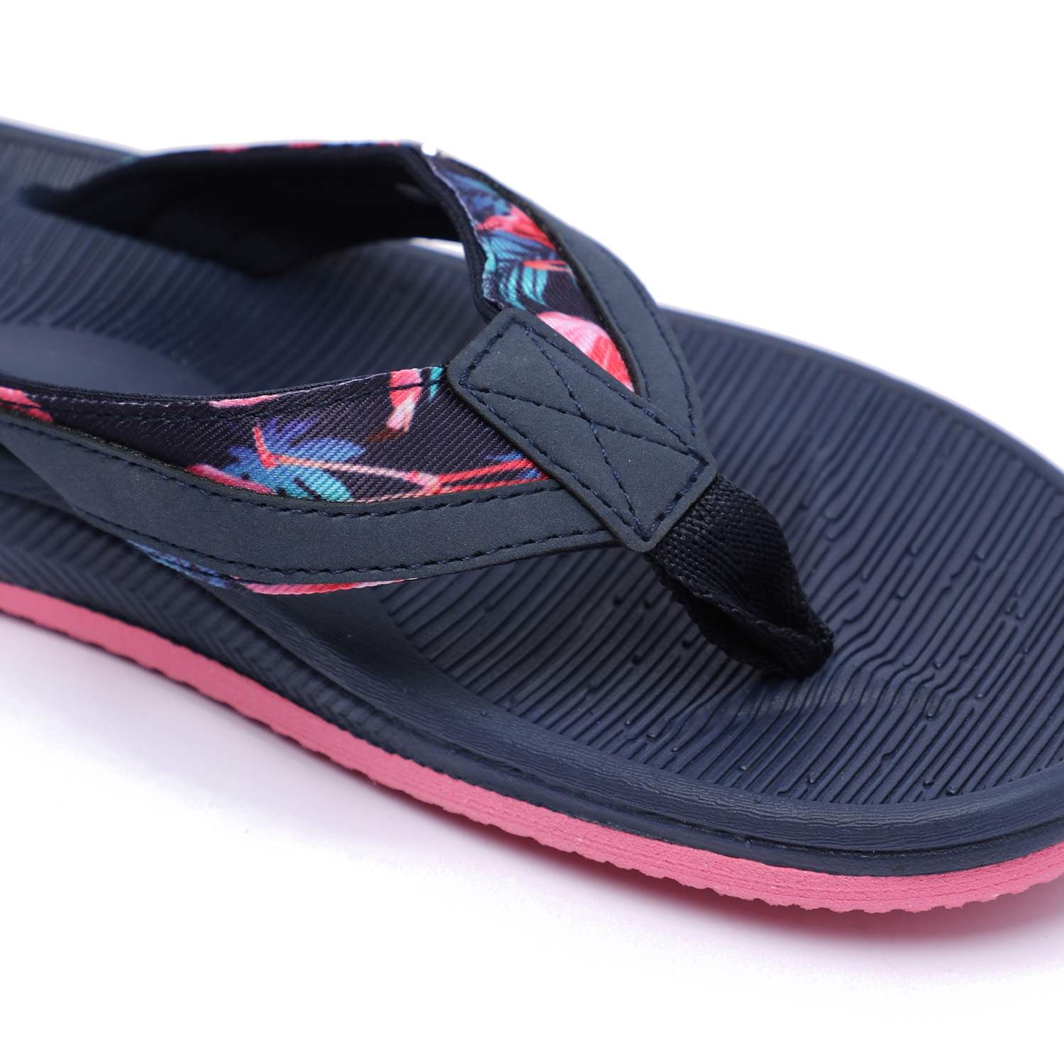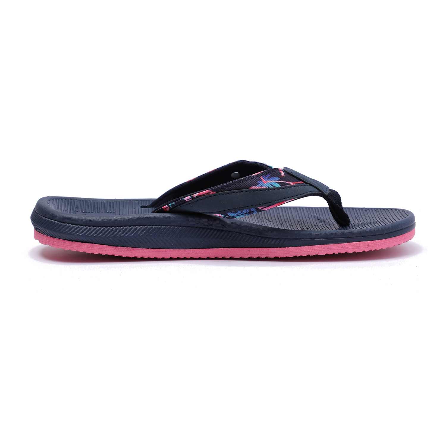 Step into comfort and style with these chic navy blue flip-flops designed especially for women. Featuring a floral-patterned strap and a contrasting pink sole, these flip-flops combine fashion with function. The textured footbed ensures a non-slip grip, while the soft thong strap offers all-day comfort.