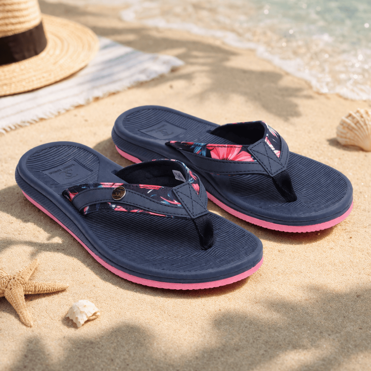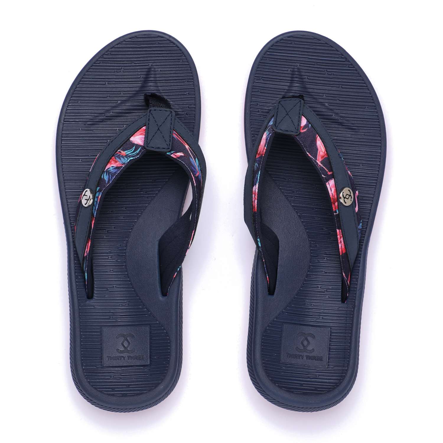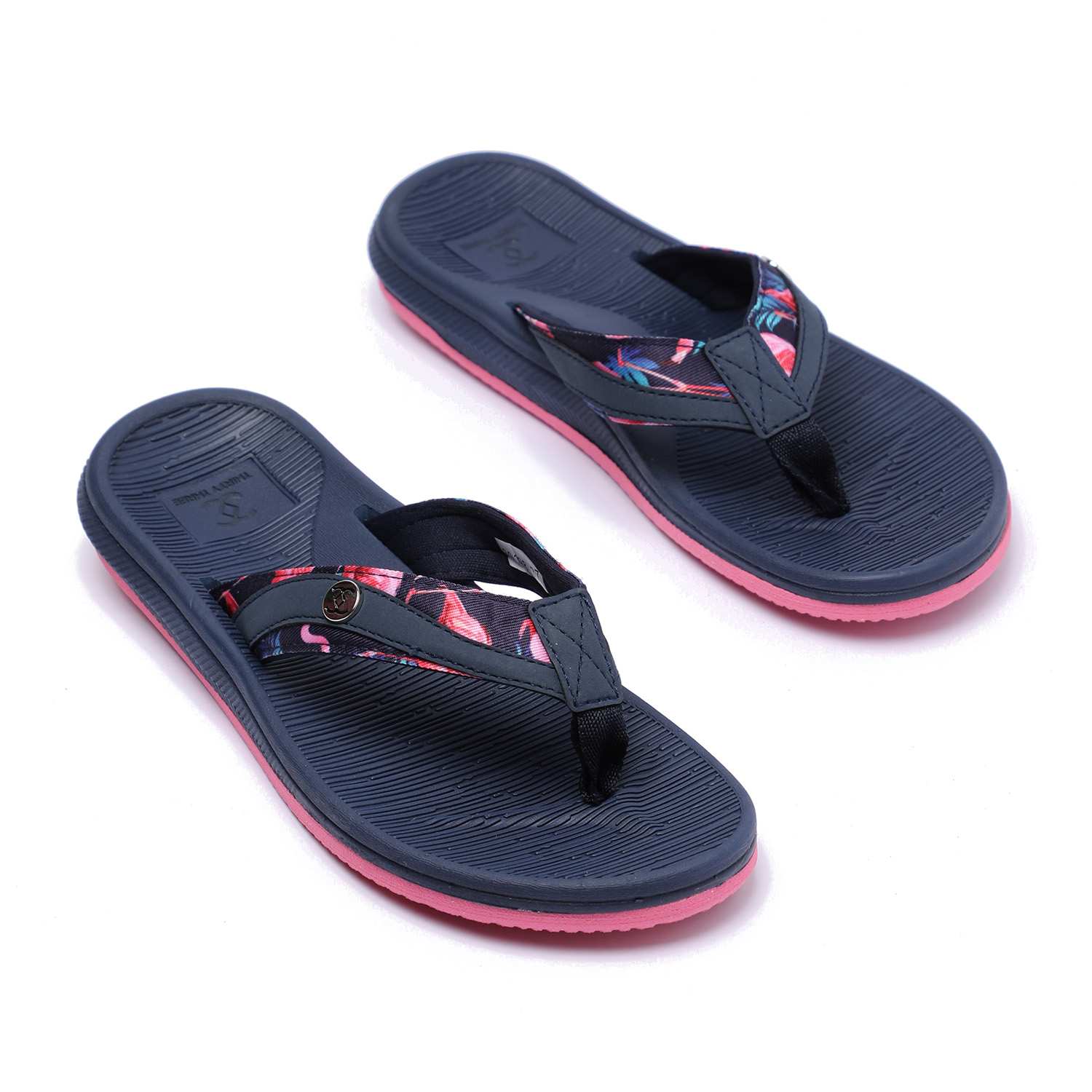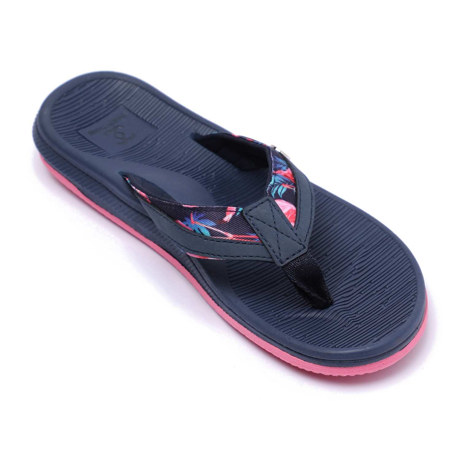 Step into comfort and style with these chic navy blue flip-flops designed especially for women. Featuring a floral-patterned strap and a contrasting pink sole, these flip-flops combine fashion with function. The textured footbed ensures a non-slip grip, while the soft thong strap offers all-day comfort.
