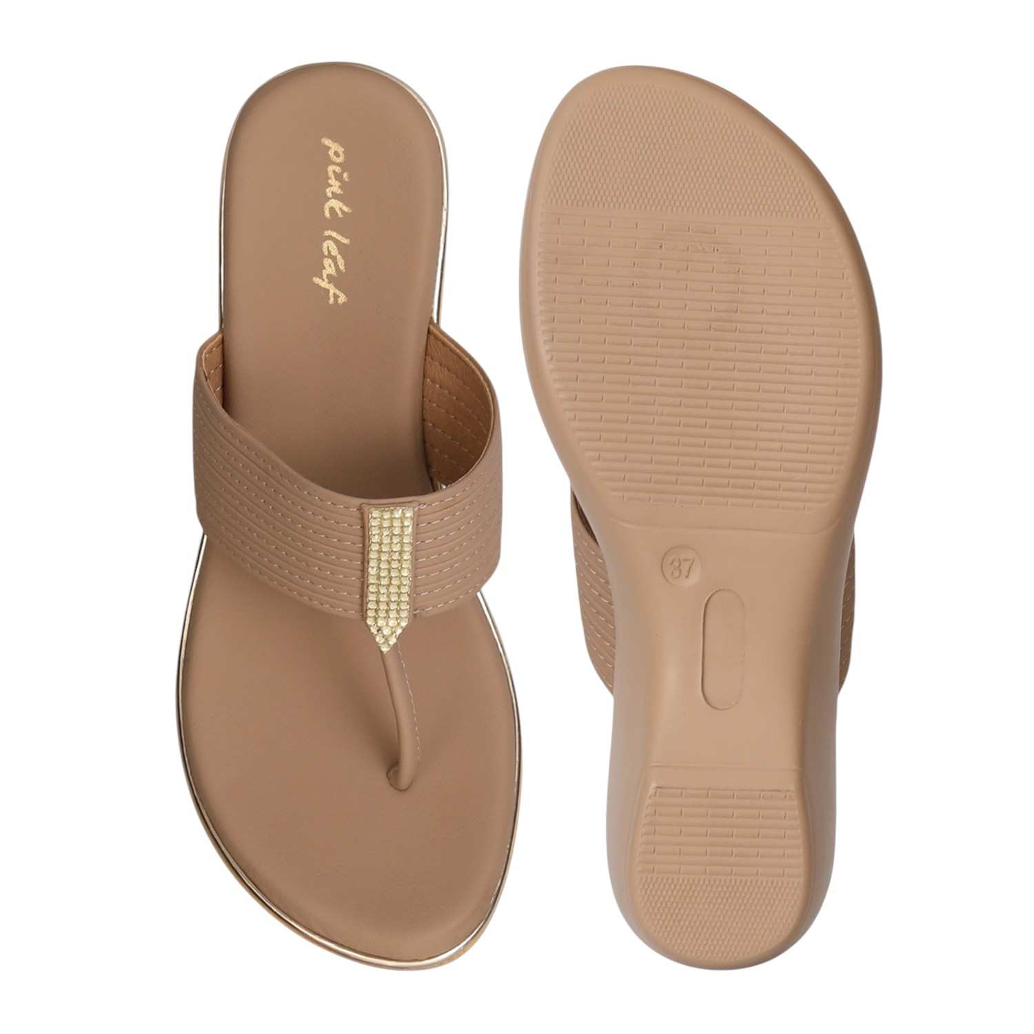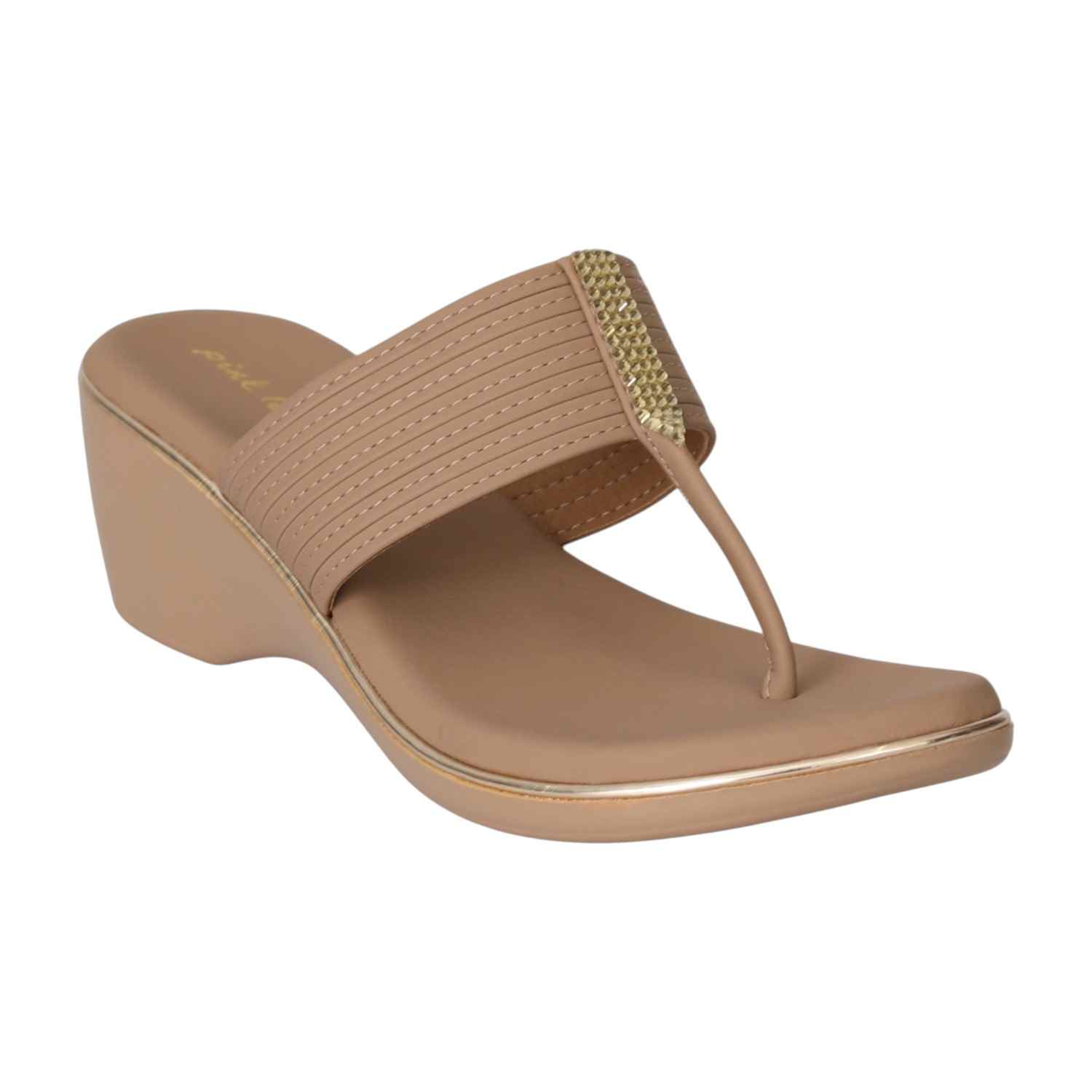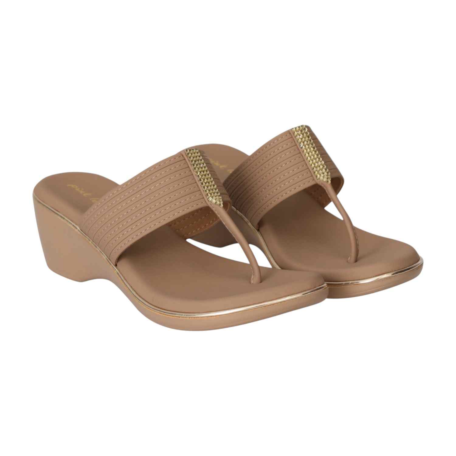 Step into effortless style and comfort with these Nude Wedge Toe-Ring Sandals. Featuring a wide strap with subtle stitched detailing and a touch of gold embellishment, these sandals offer a chic look paired with a comfortable wedge heel. The cushioned footbed ensures all-day support, making them perfect for casual outings or dressier occasions.