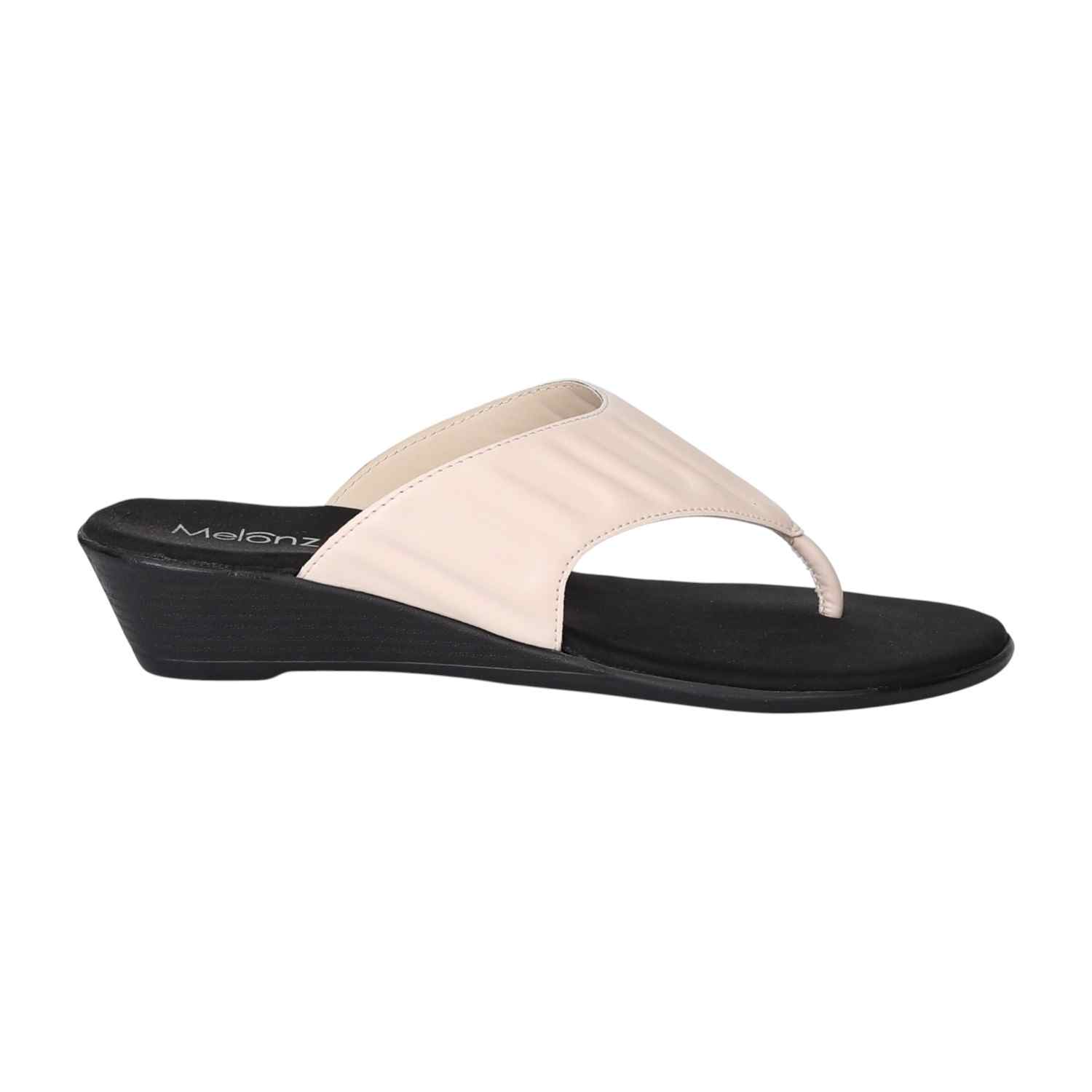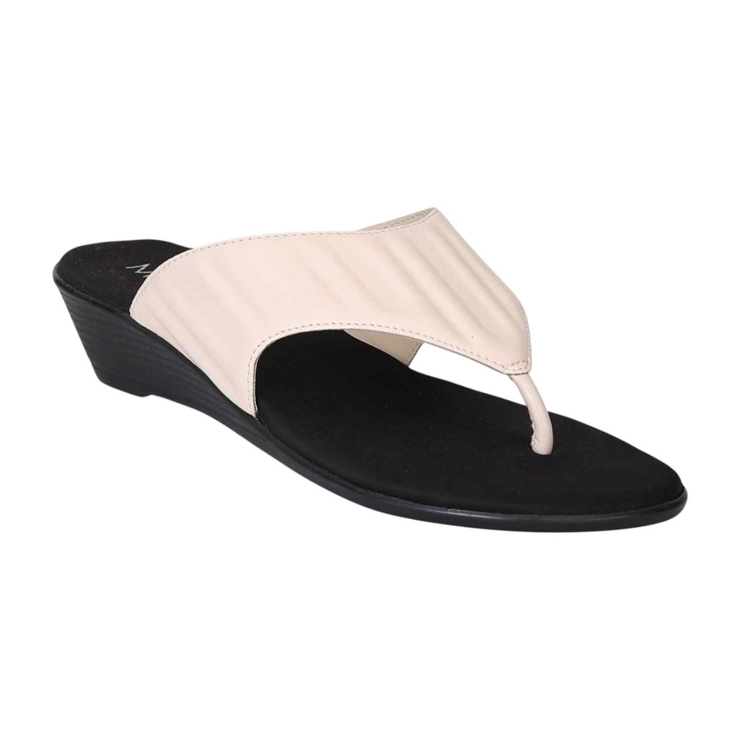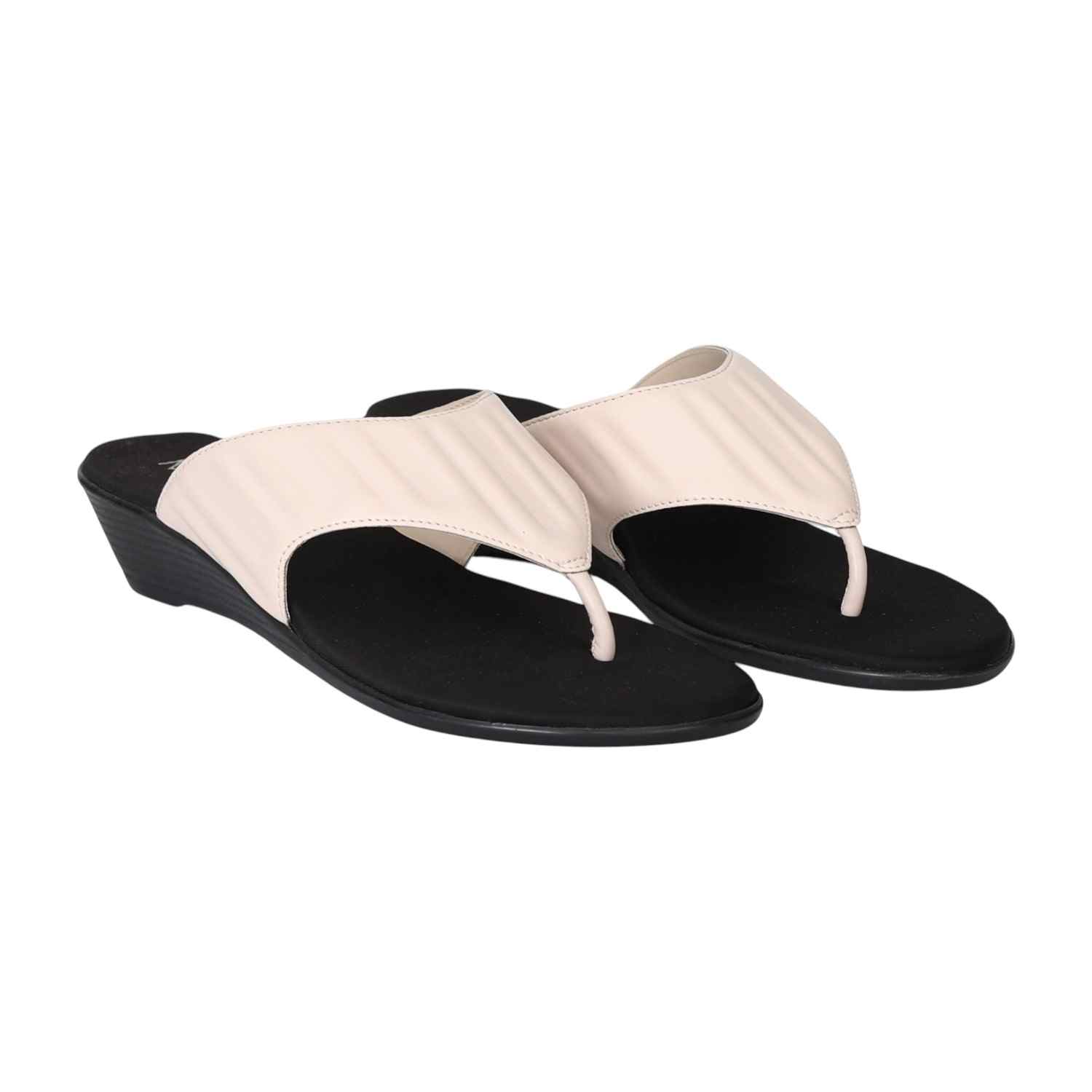 These stylish thong sandals feature a comfortable black wedge sole with a textured off-white upper. The sleek design and subtle color contrast make them a versatile and fashionable choice for both casual and semi-formal occasions.