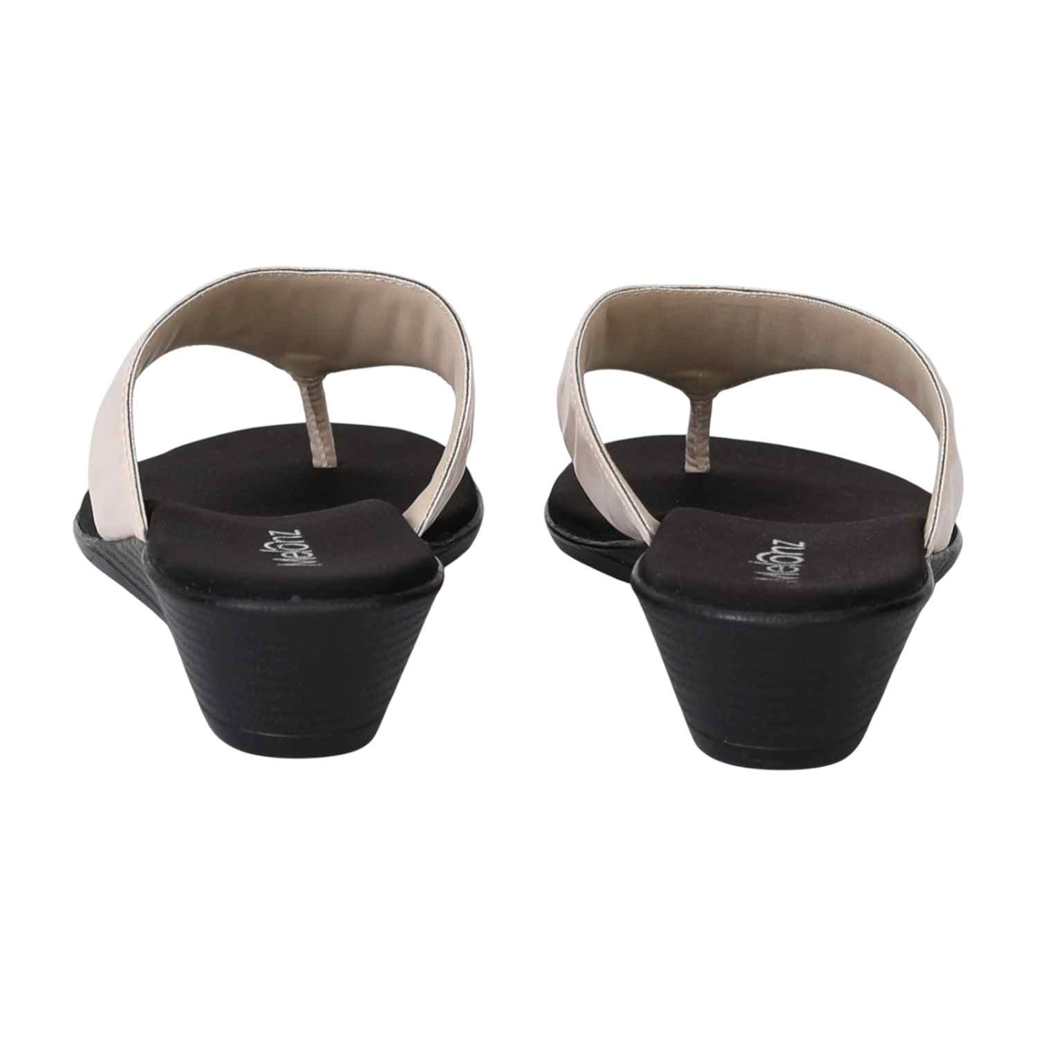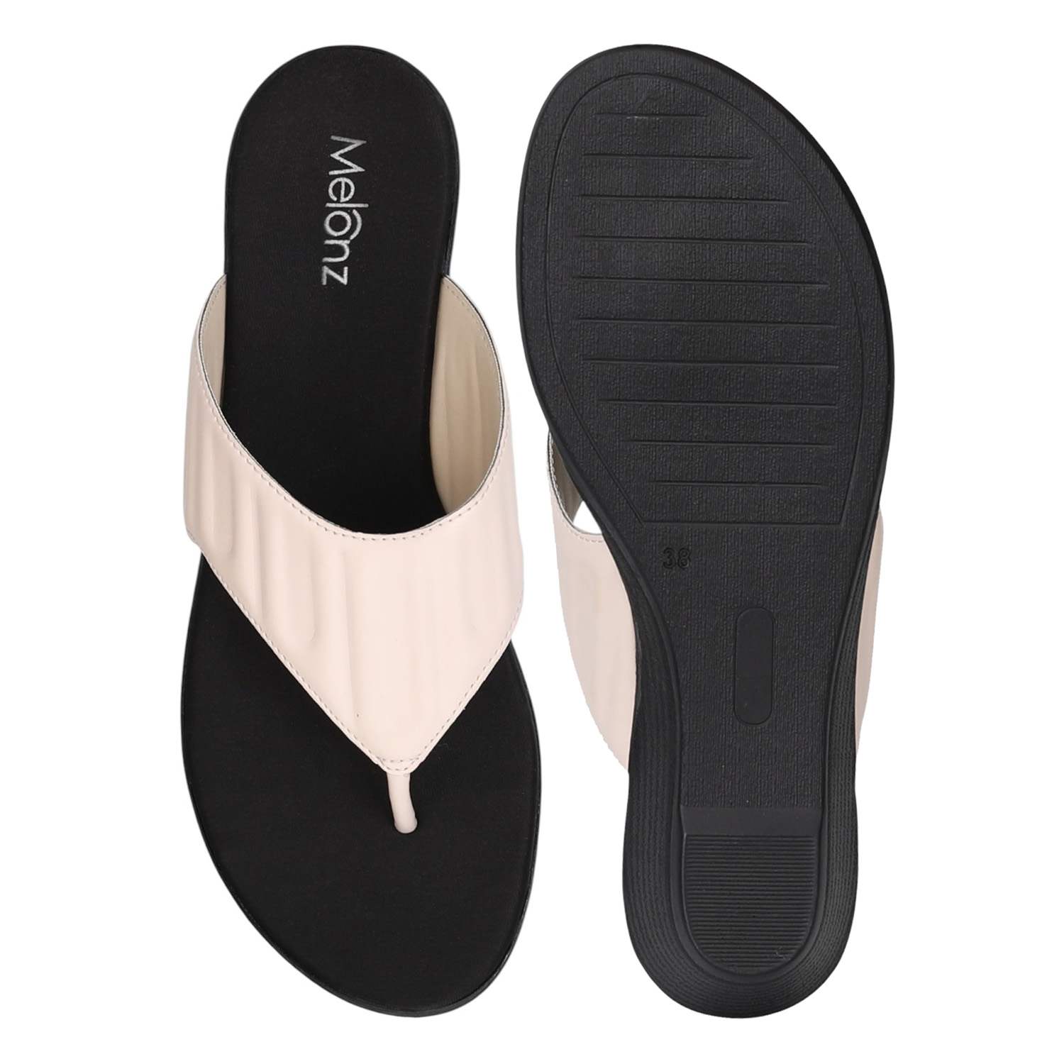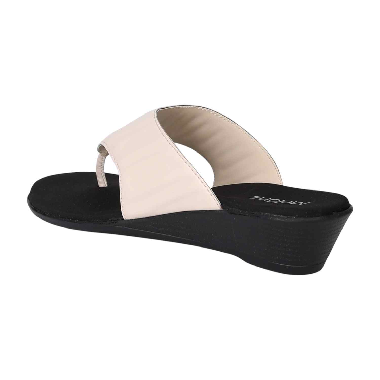 These stylish thong sandals feature a comfortable black wedge sole with a textured off-white upper. The sleek design and subtle color contrast make them a versatile and fashionable choice for both casual and semi-formal occasions.