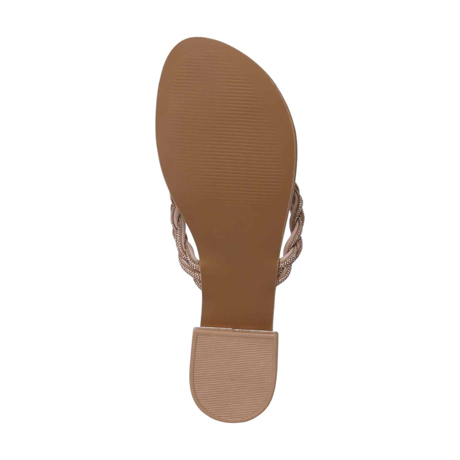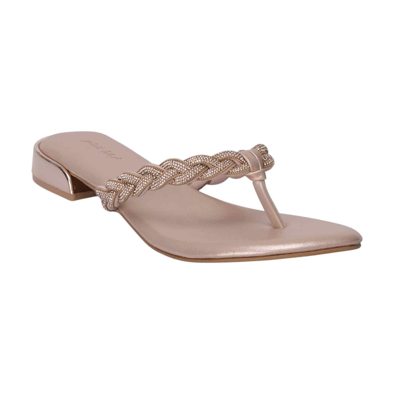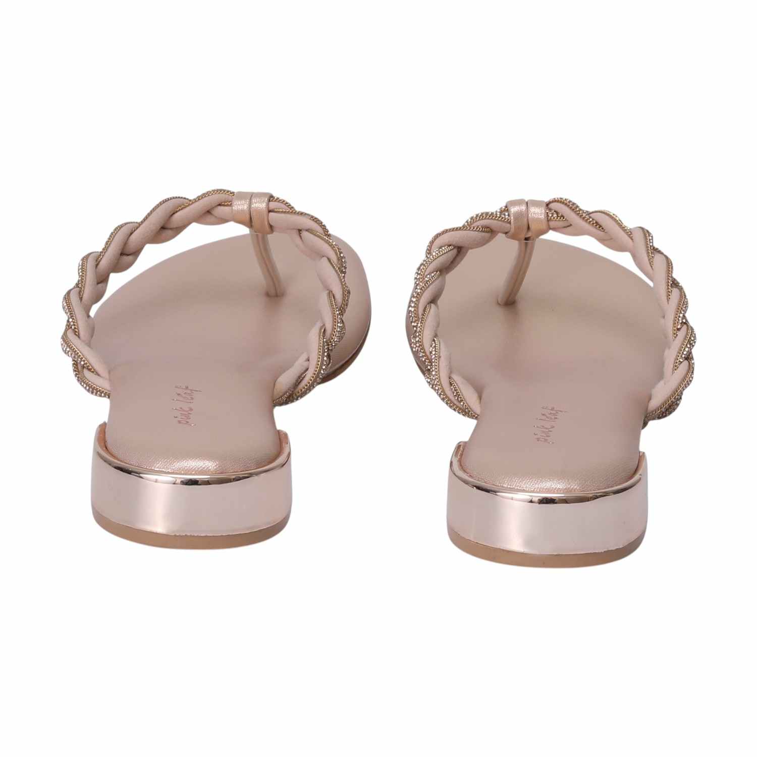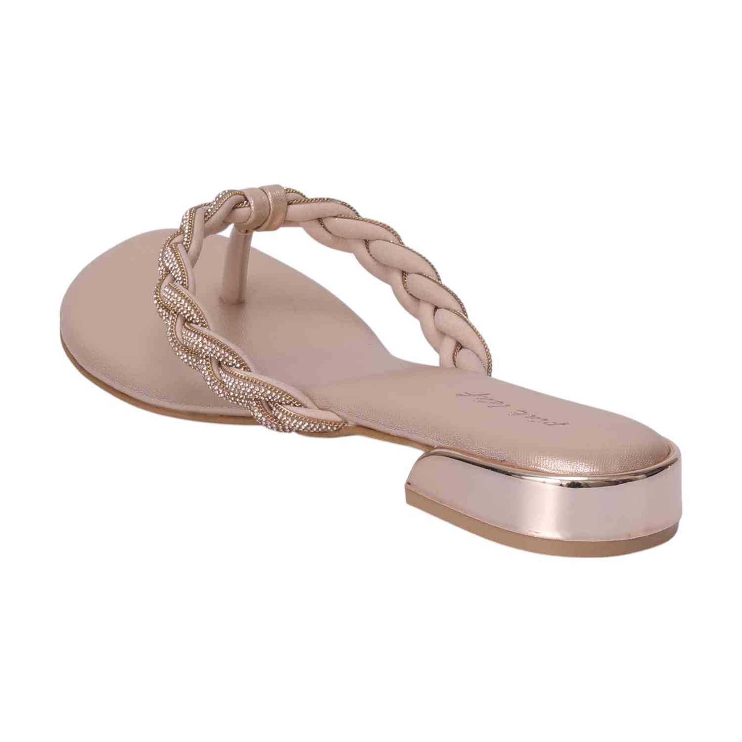 Step into understated elegance with these Rose gold braided thong sandals. Featuring a chic embellished braided strap and a subtle rose gold-detailed low heel, they offer comfortable style perfect for versatile everyday wear.