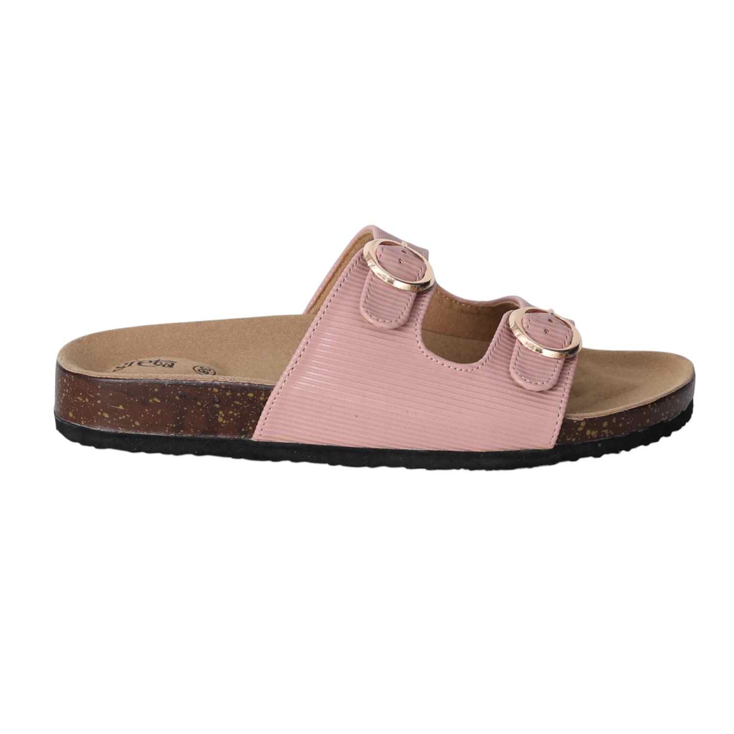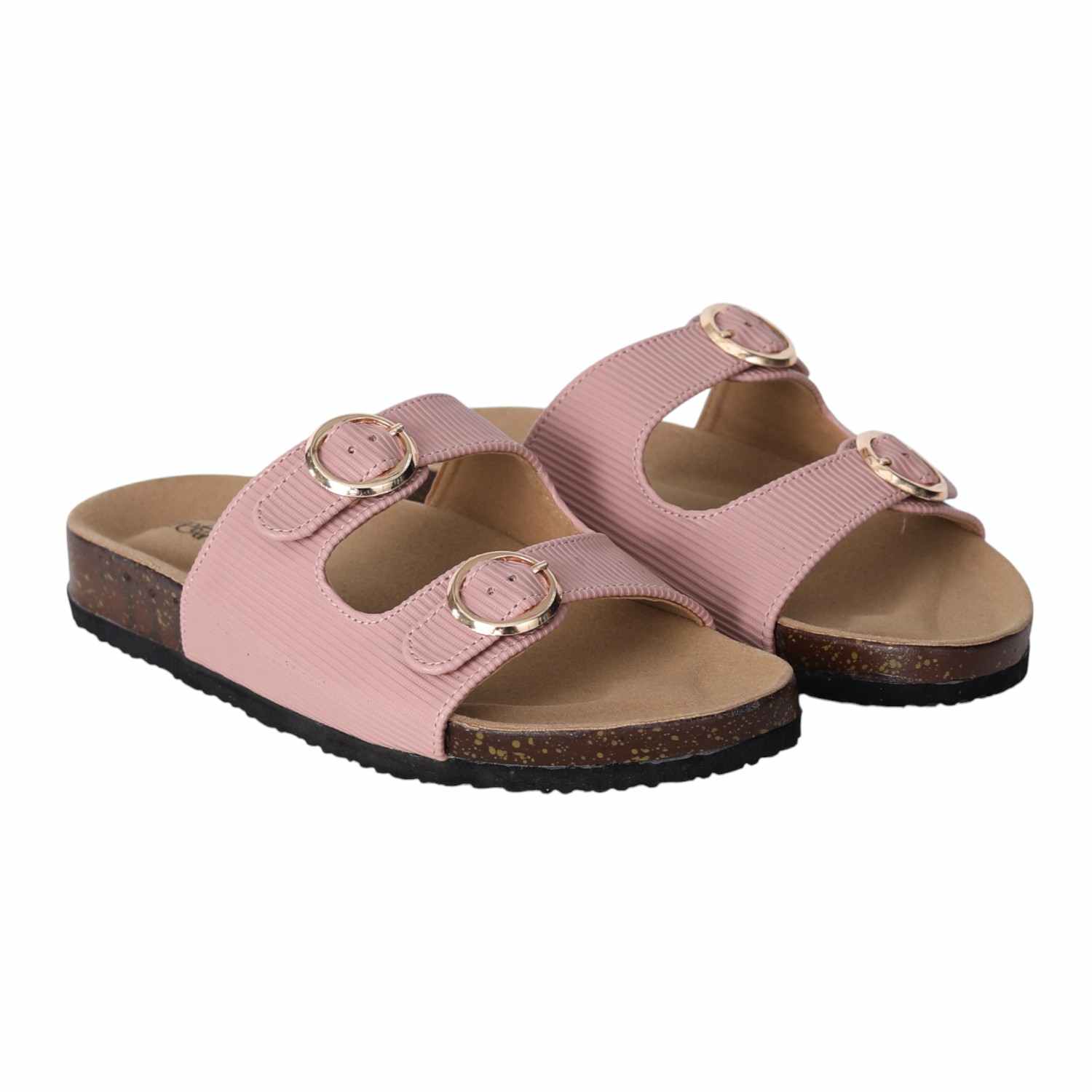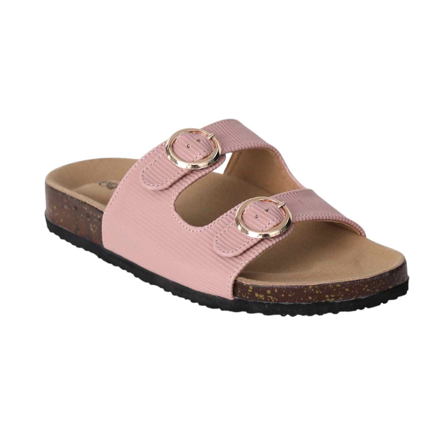 Stay effortlessly stylish and comfortable with these Pink double buckle slide sandals for women. Featuring a contoured footbed and cork-textured sole, these sandals are designed for all-day support. The adjustable twin straps with metallic buckles offer a secure fit and add a touch of sophistication. Perfect for everyday wear