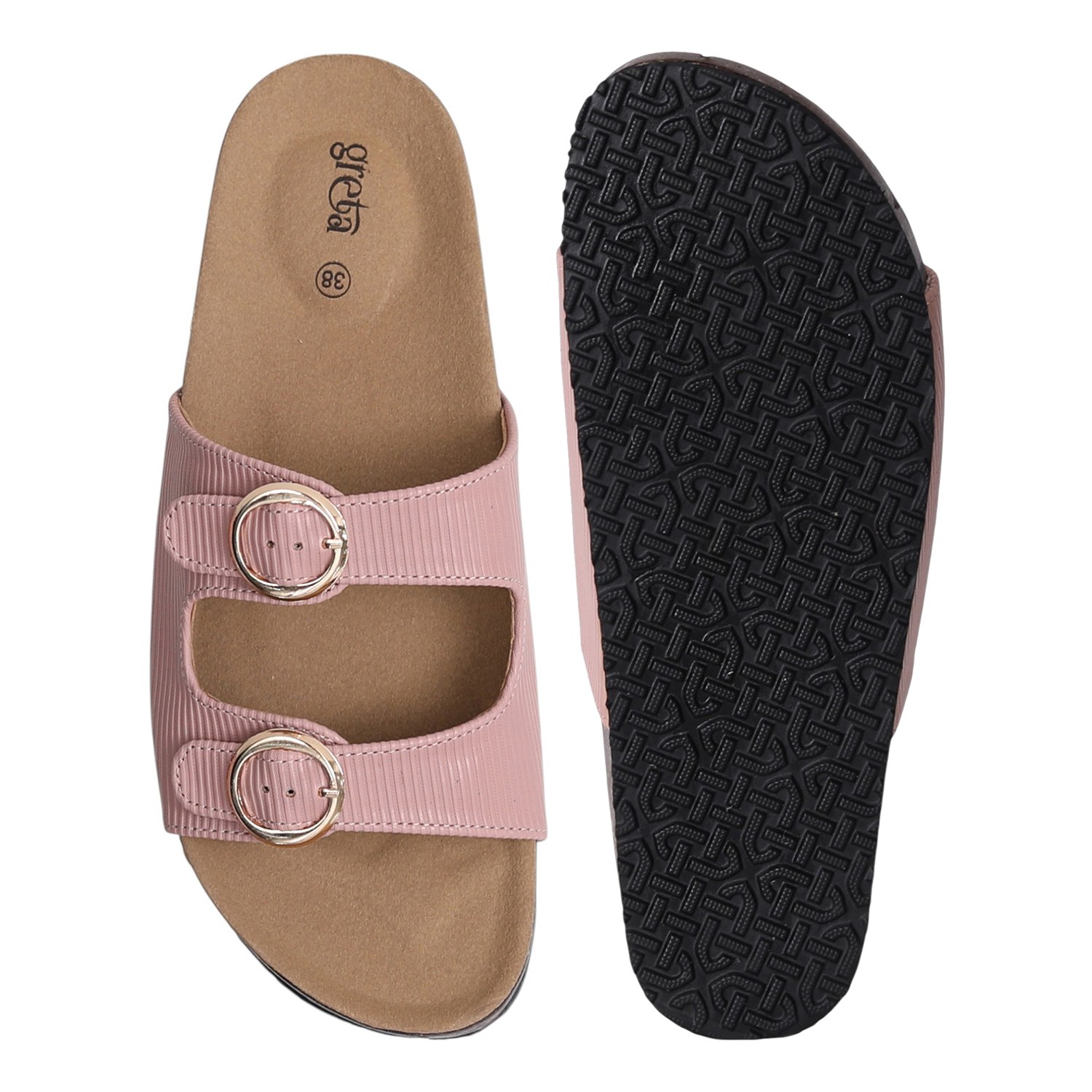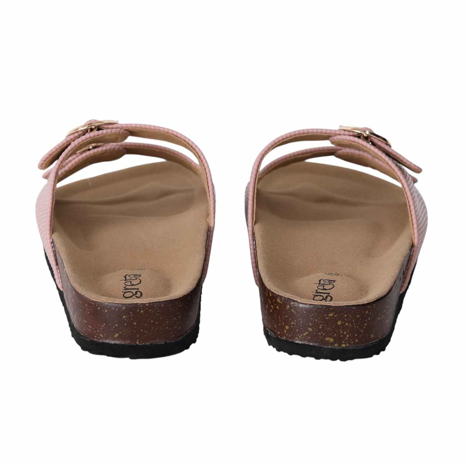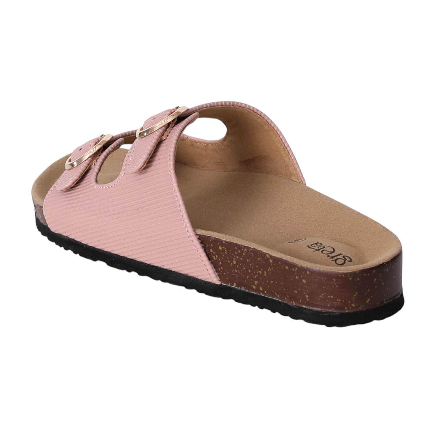Stay effortlessly stylish and comfortable with these Pink double buckle slide sandals for women. Featuring a contoured footbed and cork-textured sole, these sandals are designed for all-day support. The adjustable twin straps with metallic buckles offer a secure fit and add a touch of sophistication. Perfect for everyday wear