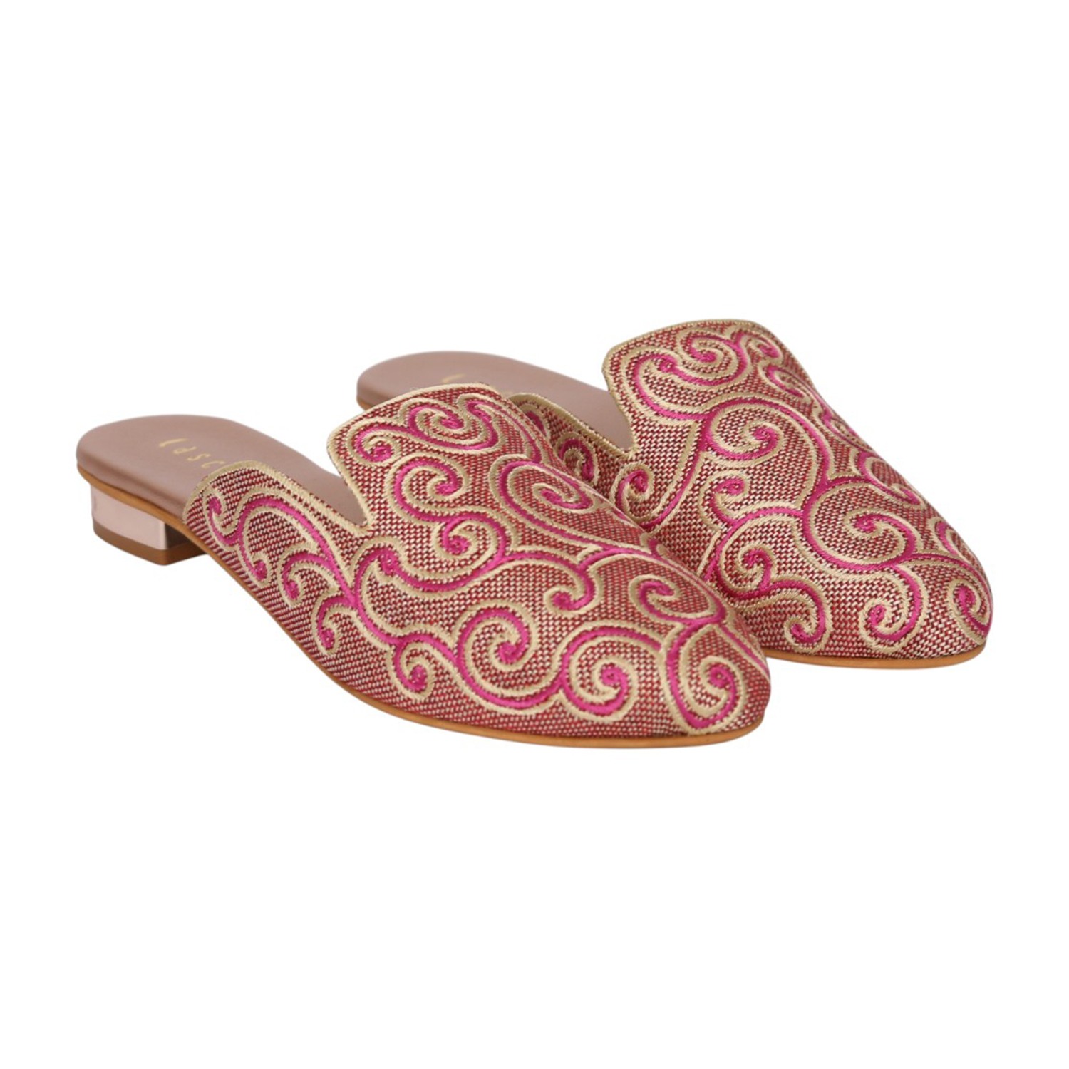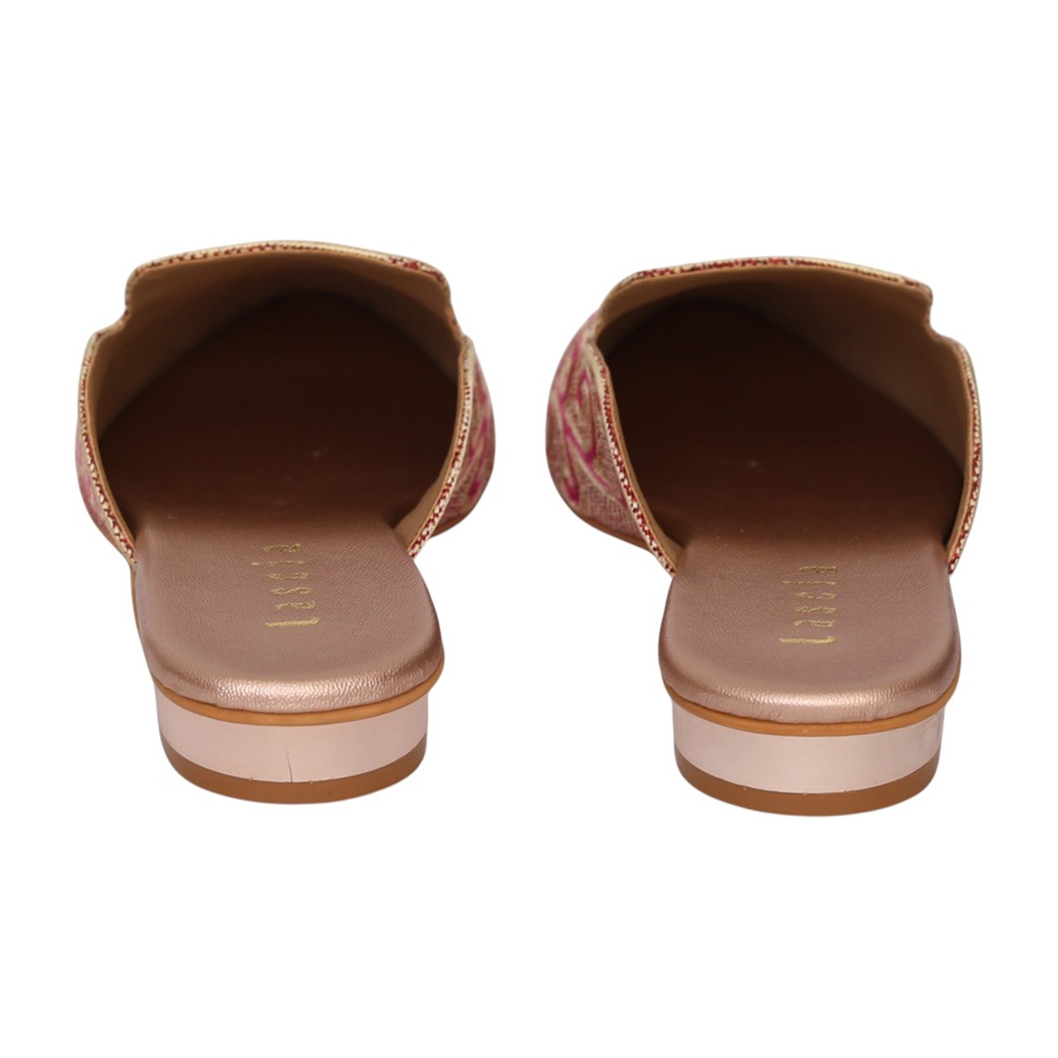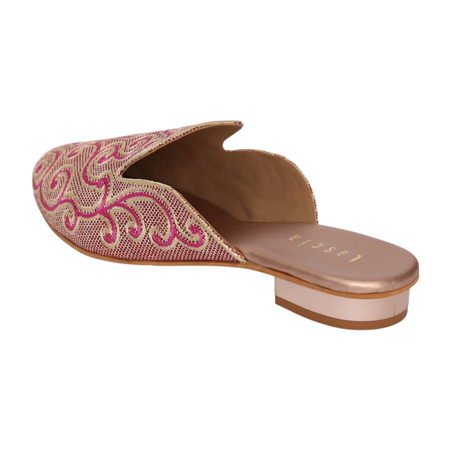 These elegant Metro mules are a sophisticated blend of traditional craftsmanship and modern design. They feature a beige synthetic upper intricately detailed with pink and light gold swirl embroidery, making them an ideal choice for ethnic and festive occasions. The slip-on design is complemented by a small, metallic-accented block heel that provides a subtle lift while maintaining comfort for extended wear.