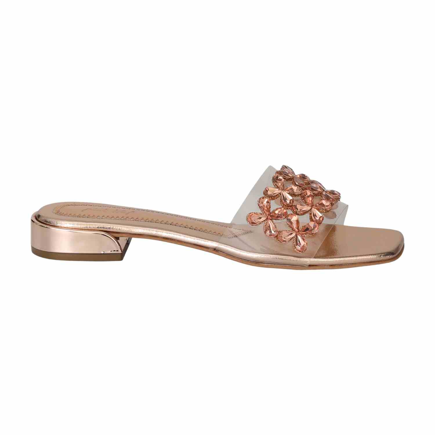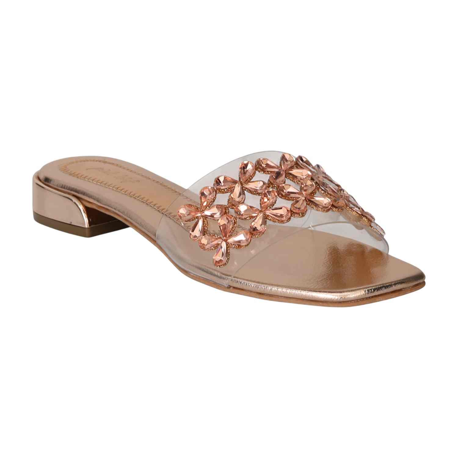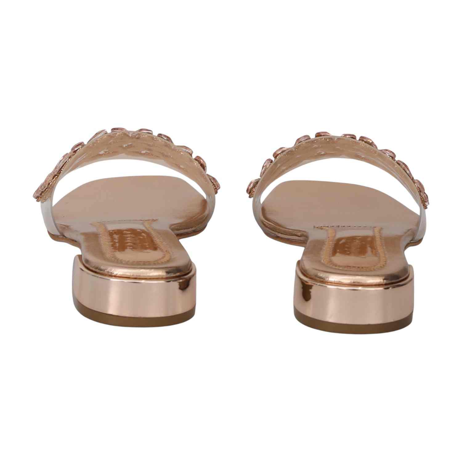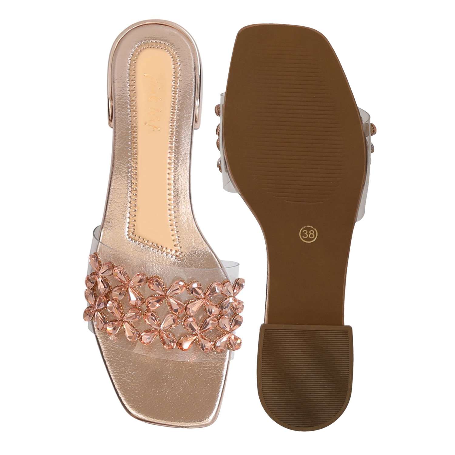 Add a touch of glamour with these rose gold slide sandals, adorned with sparkling embellishments on the strap. Designed for comfort and style, they pair beautifully with both western and ethnic outfits for any special occasion.