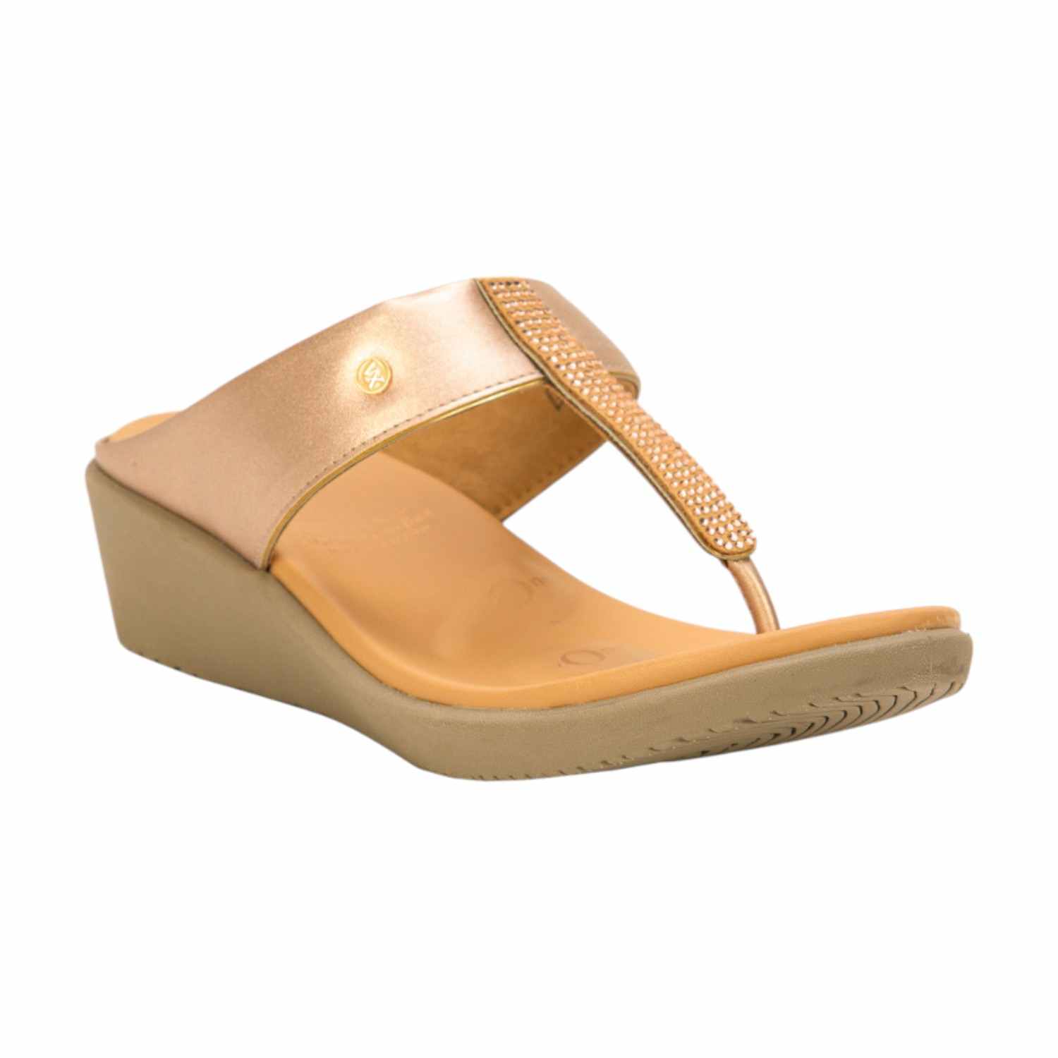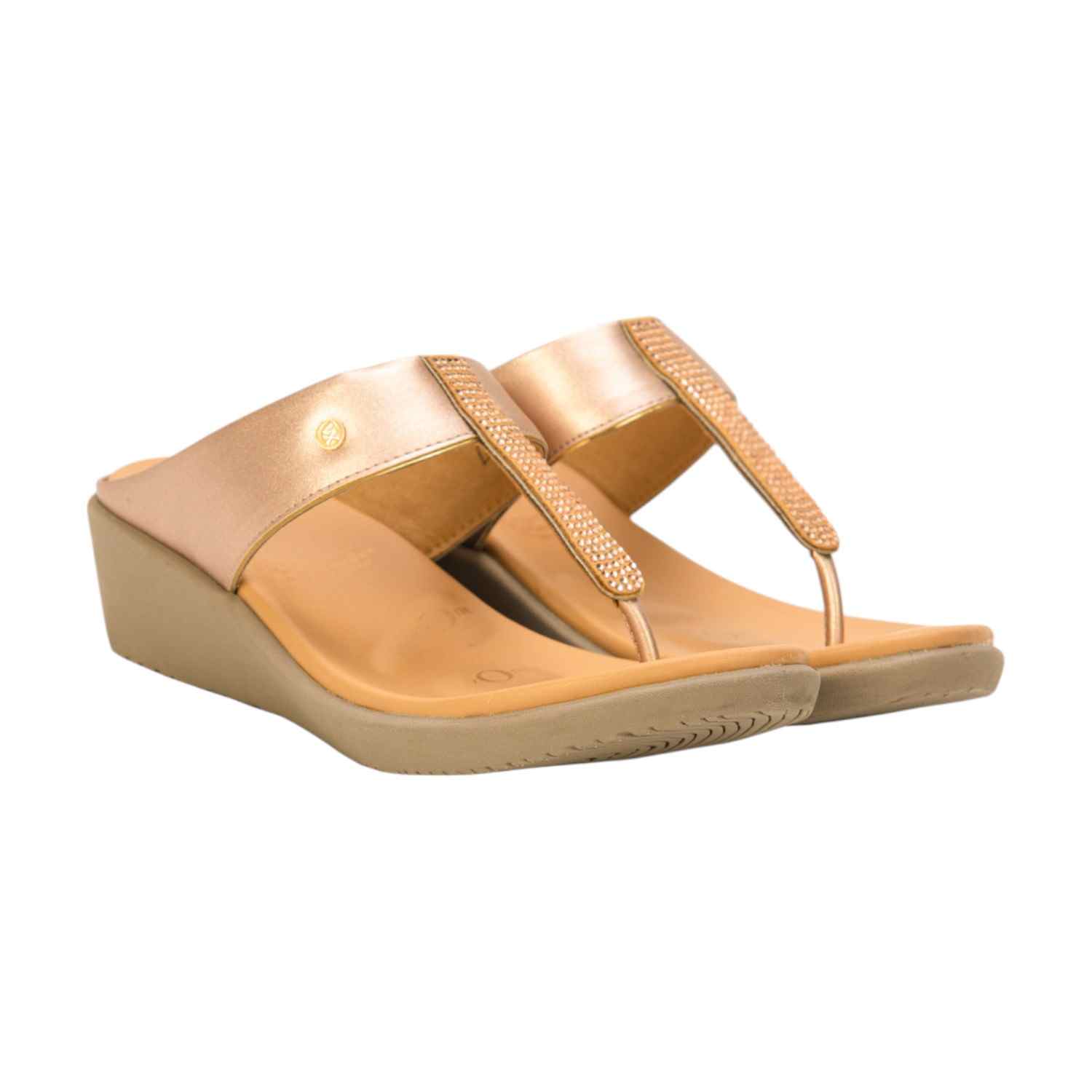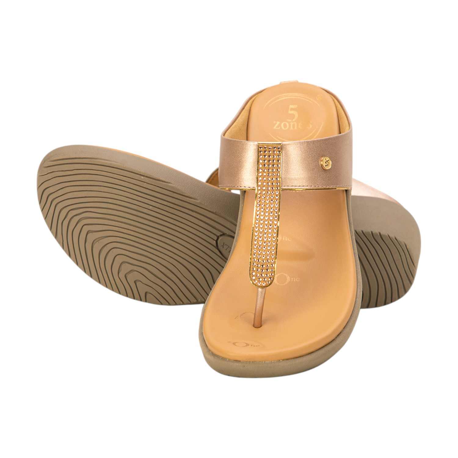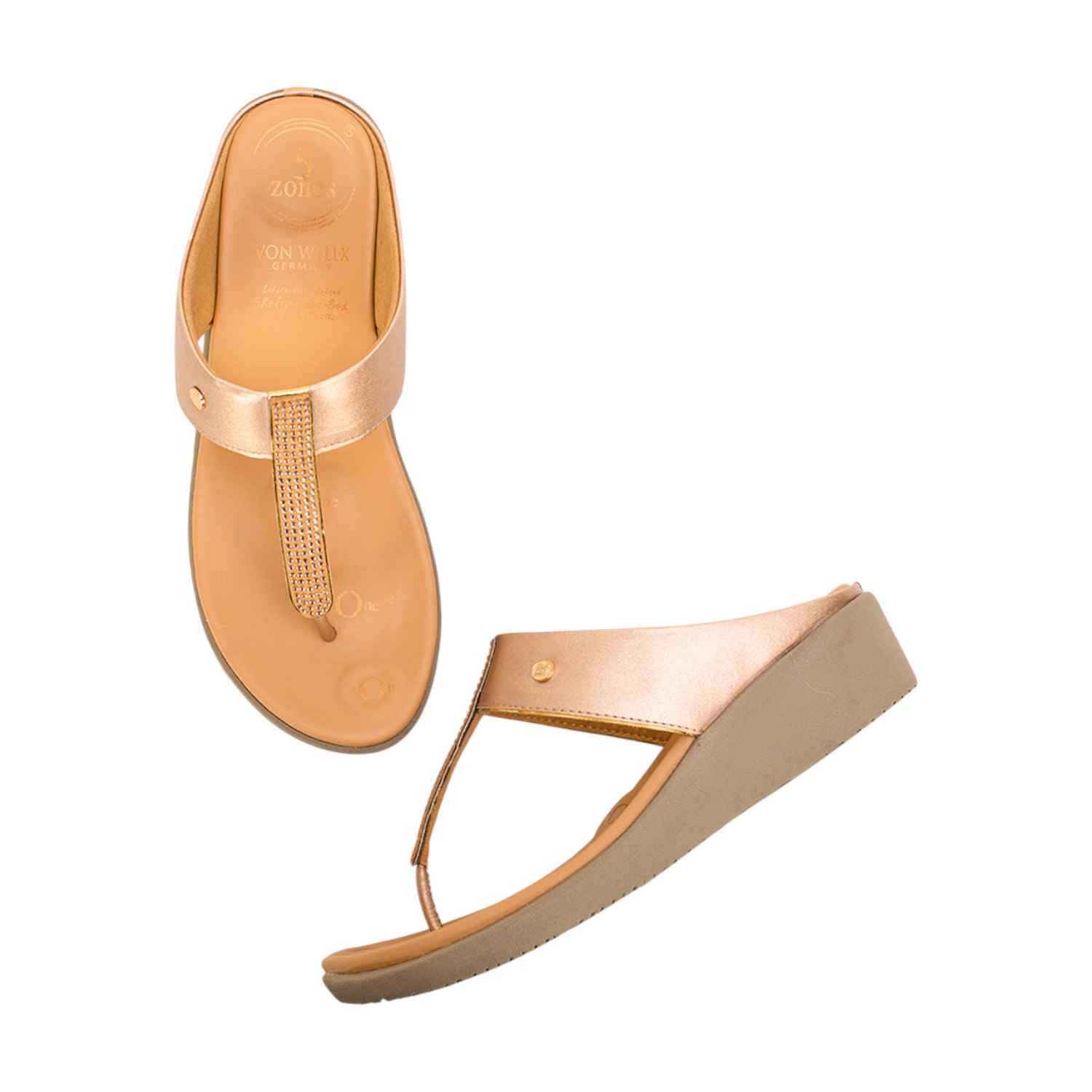 Elevate your look with these elegant rose gold/gold wedge thong sandals. Featuring a shimmering, embellished T-strap and a comfortable, wide top strap, these sandals are perfect for adding a glamorous touch to your ensemble. The contoured footbed, indicating "5 Zones" support, ensures all-day comfort while maintaining a stylish profile. Ideal for special occasions or adding a chic sparkle to everyday wear.
