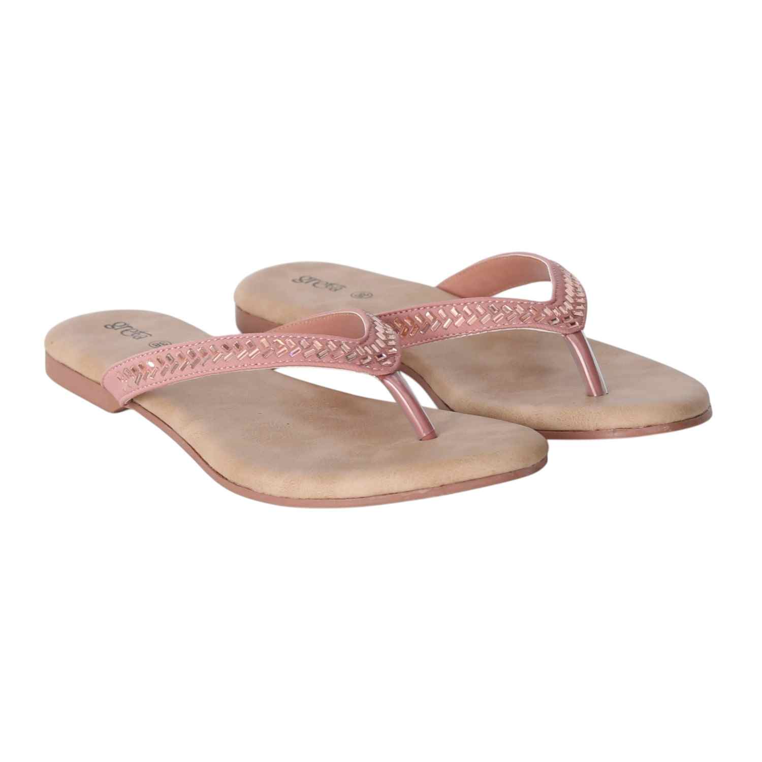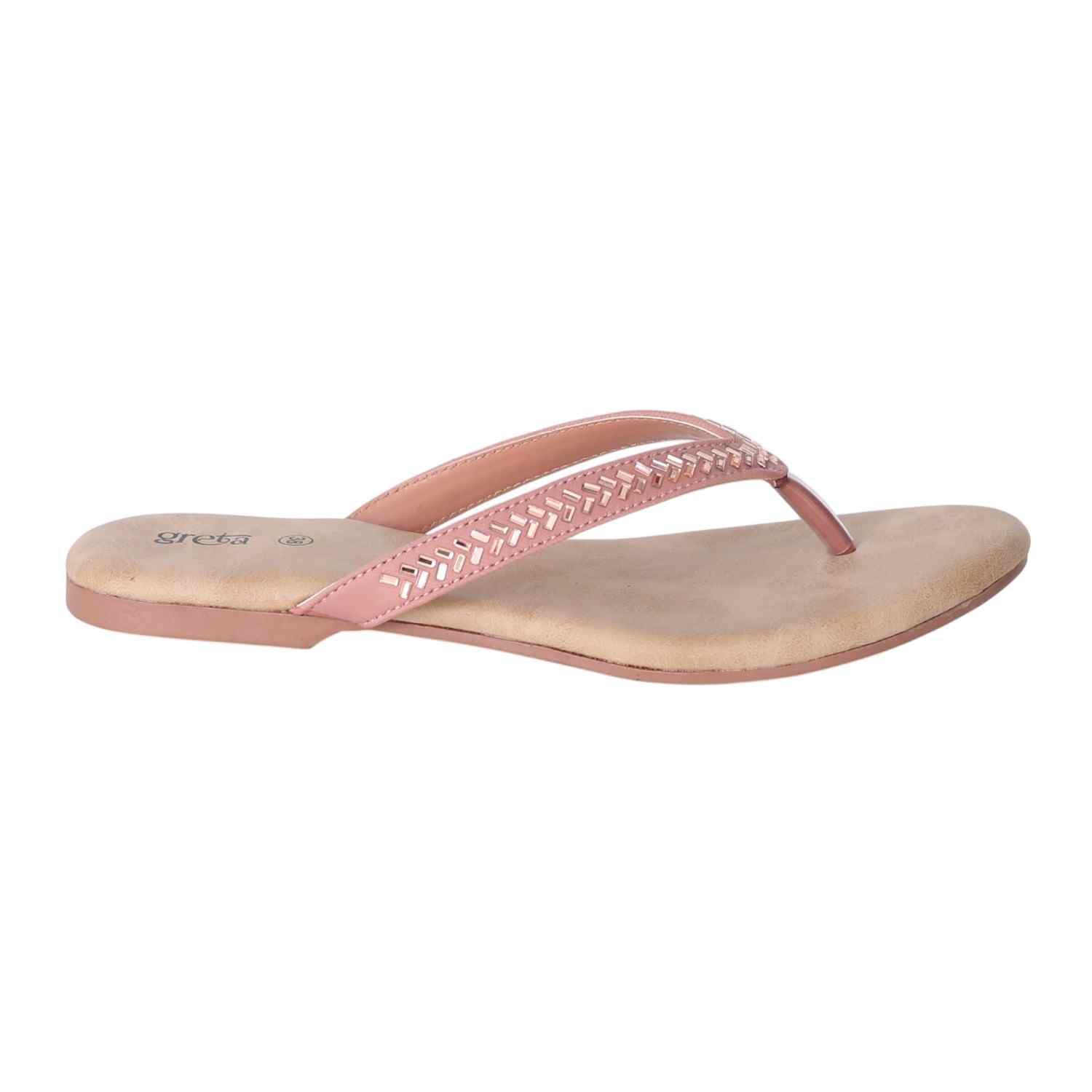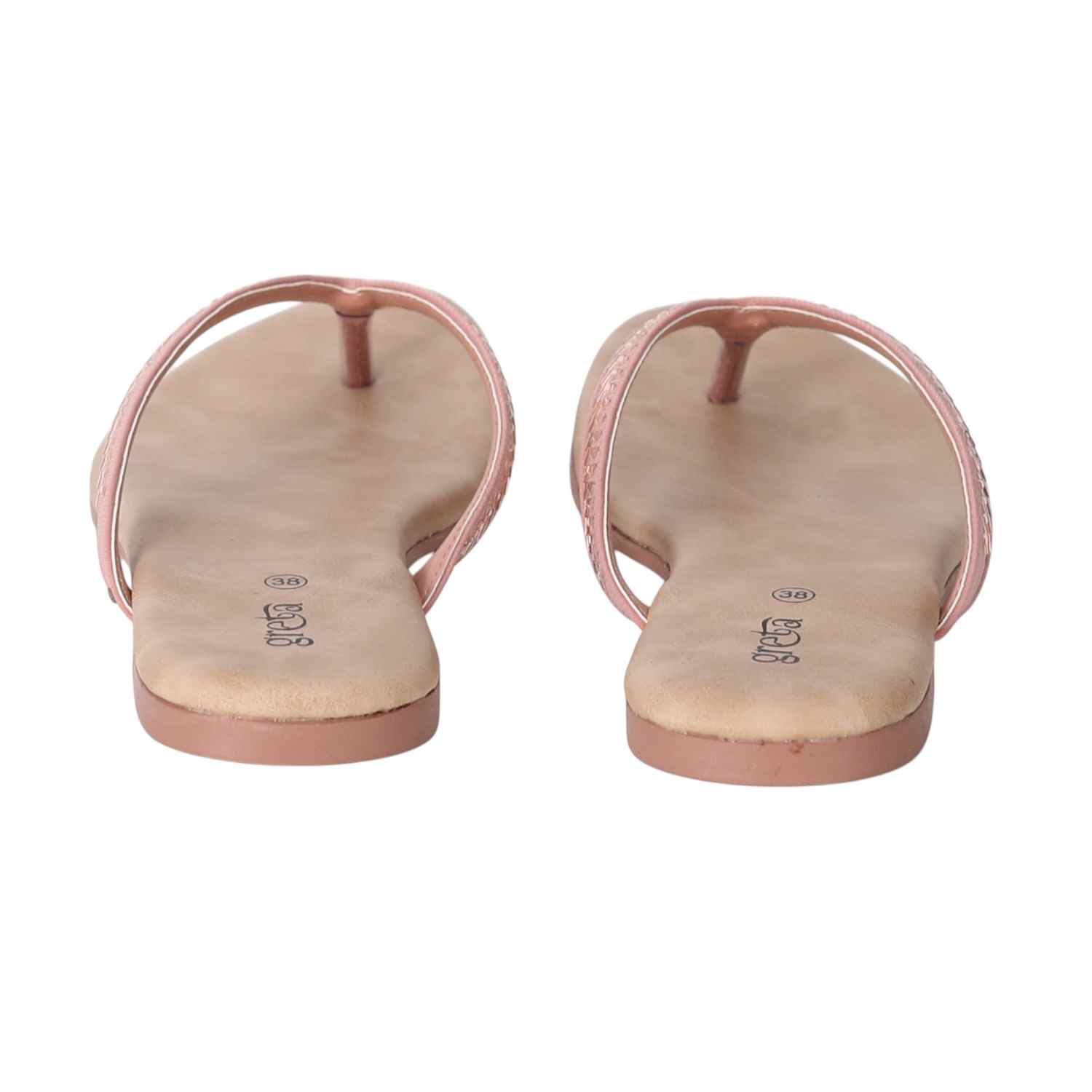 Keep it sleek and stylish with these Rose Gold flat sandals for women. Featuring a minimalist thong-style design with a woven-texture upper strap and metallic toe post, these sandals offer both comfort and elegance. The soft beige footbed ensures a relaxed fit, while the lightweight sole makes them ideal for everyday wear