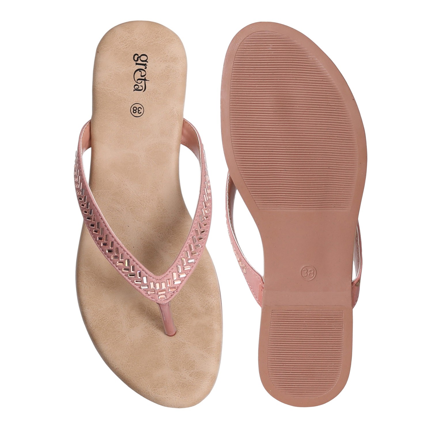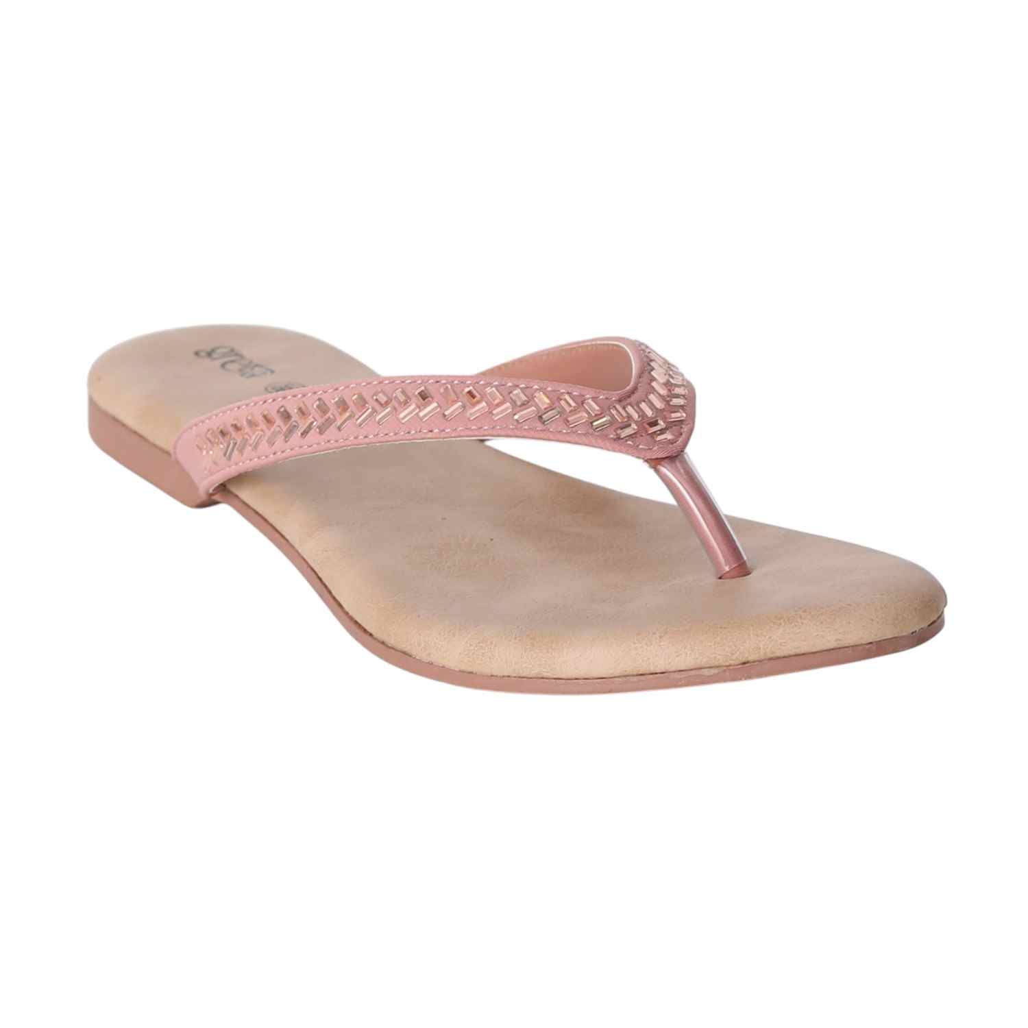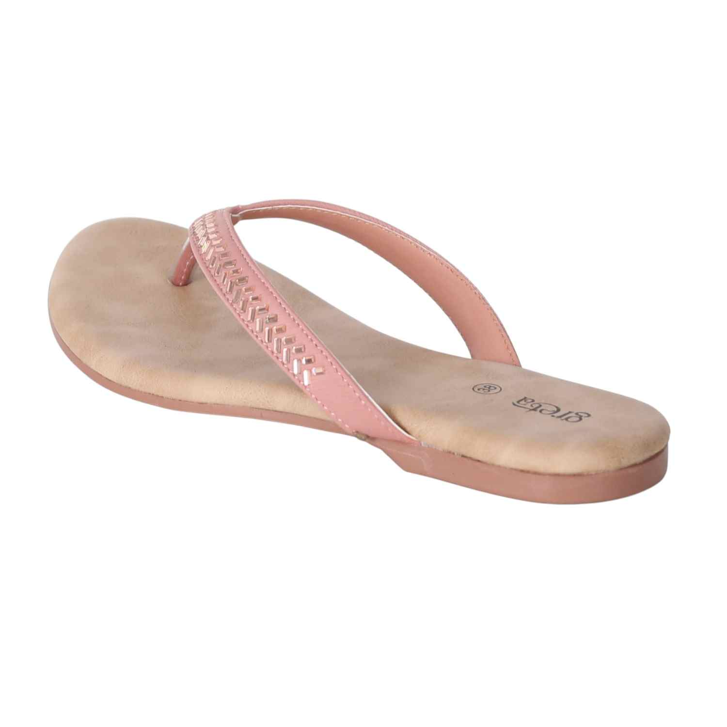 Keep it sleek and stylish with these Rose Gold flat sandals for women. Featuring a minimalist thong-style design with a woven-texture upper strap and metallic toe post, these sandals offer both comfort and elegance. The soft beige footbed ensures a relaxed fit, while the lightweight sole makes them ideal for everyday wear
