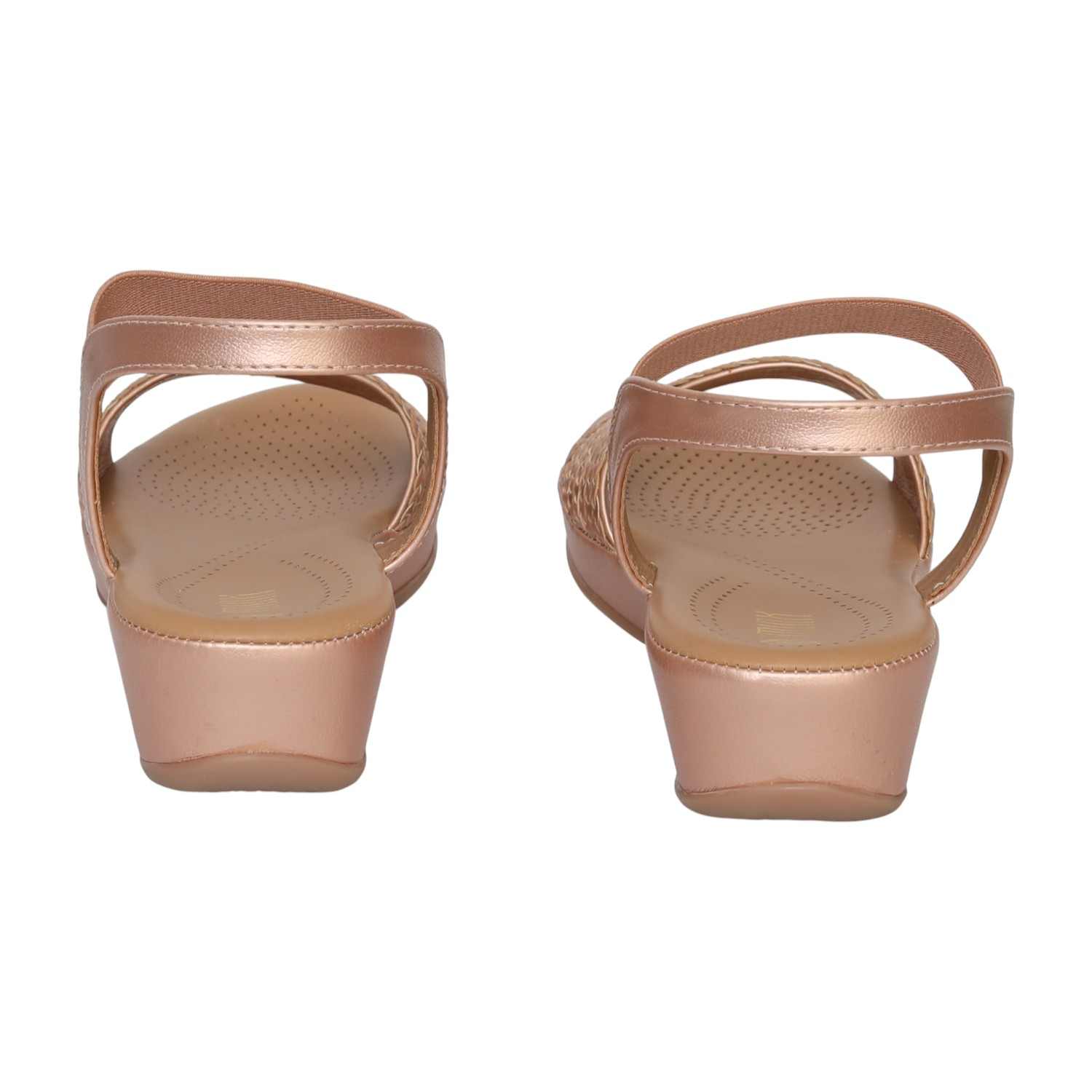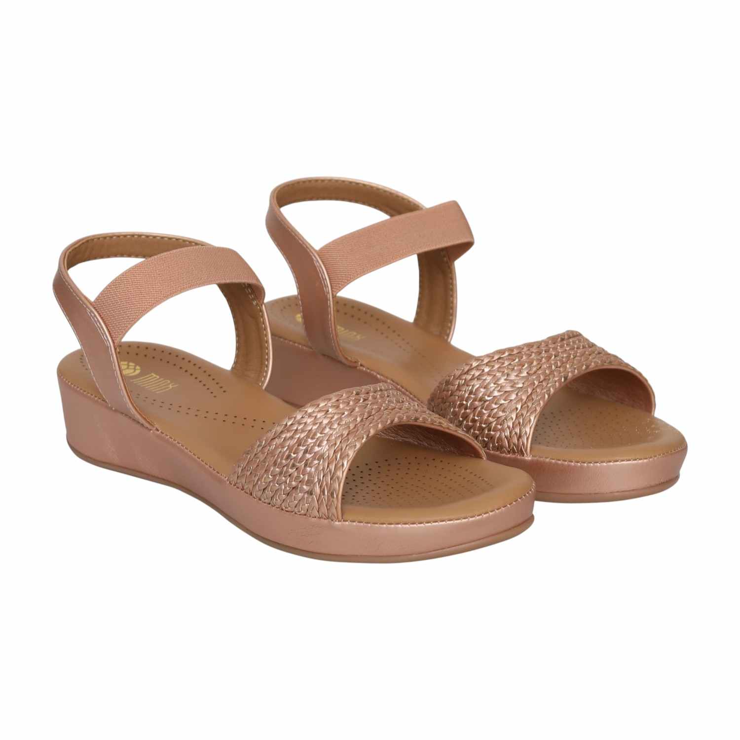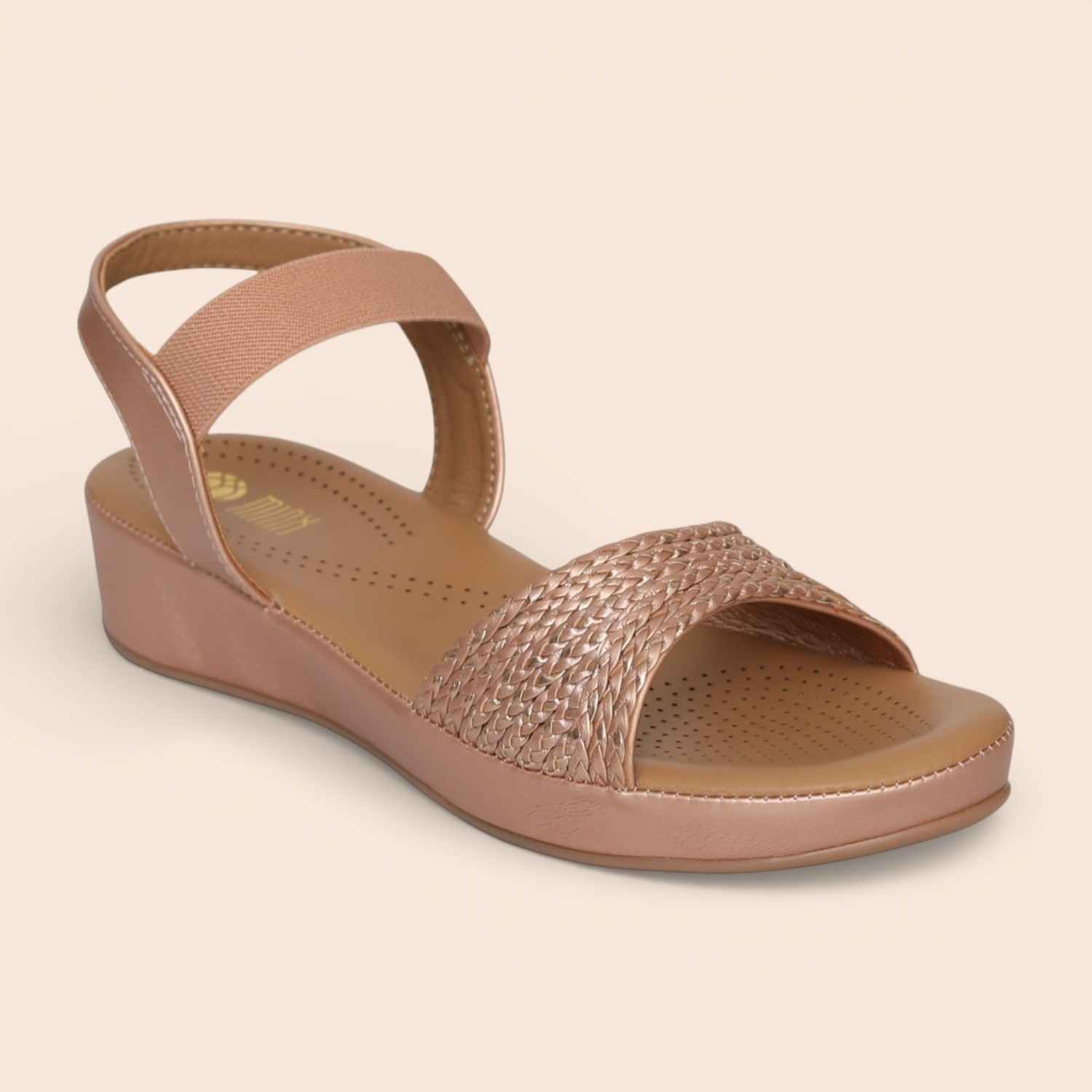 A warm, luminous sandal that brightens any look. Peach shade and shimmering woven texture add a refined elegance. Its supportive wedge is designed for stability and secure, day-long comfort.