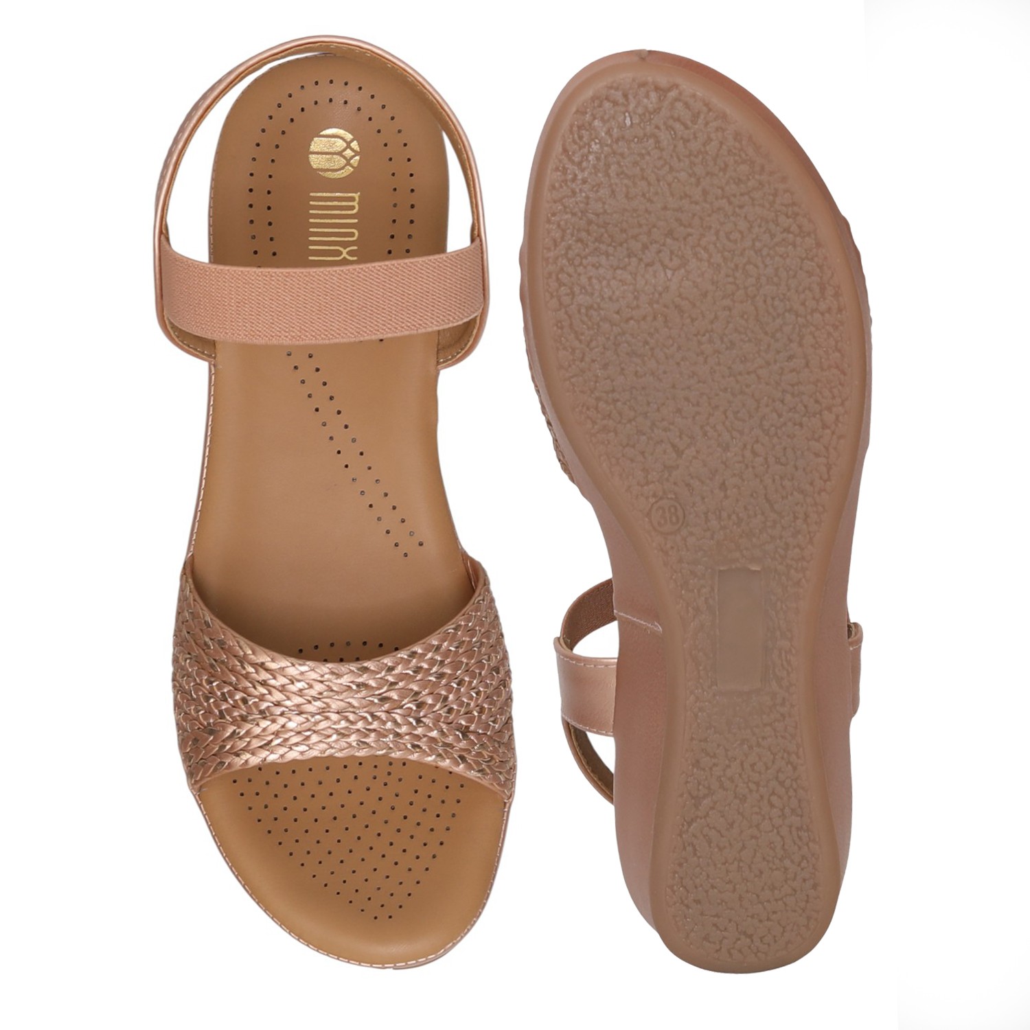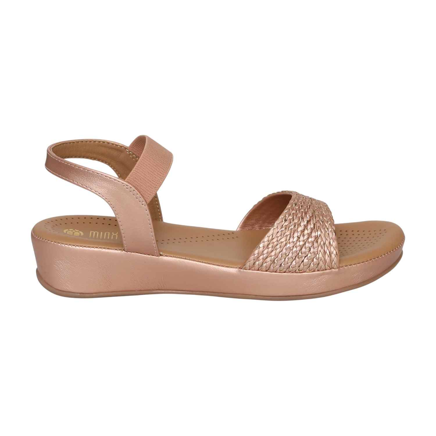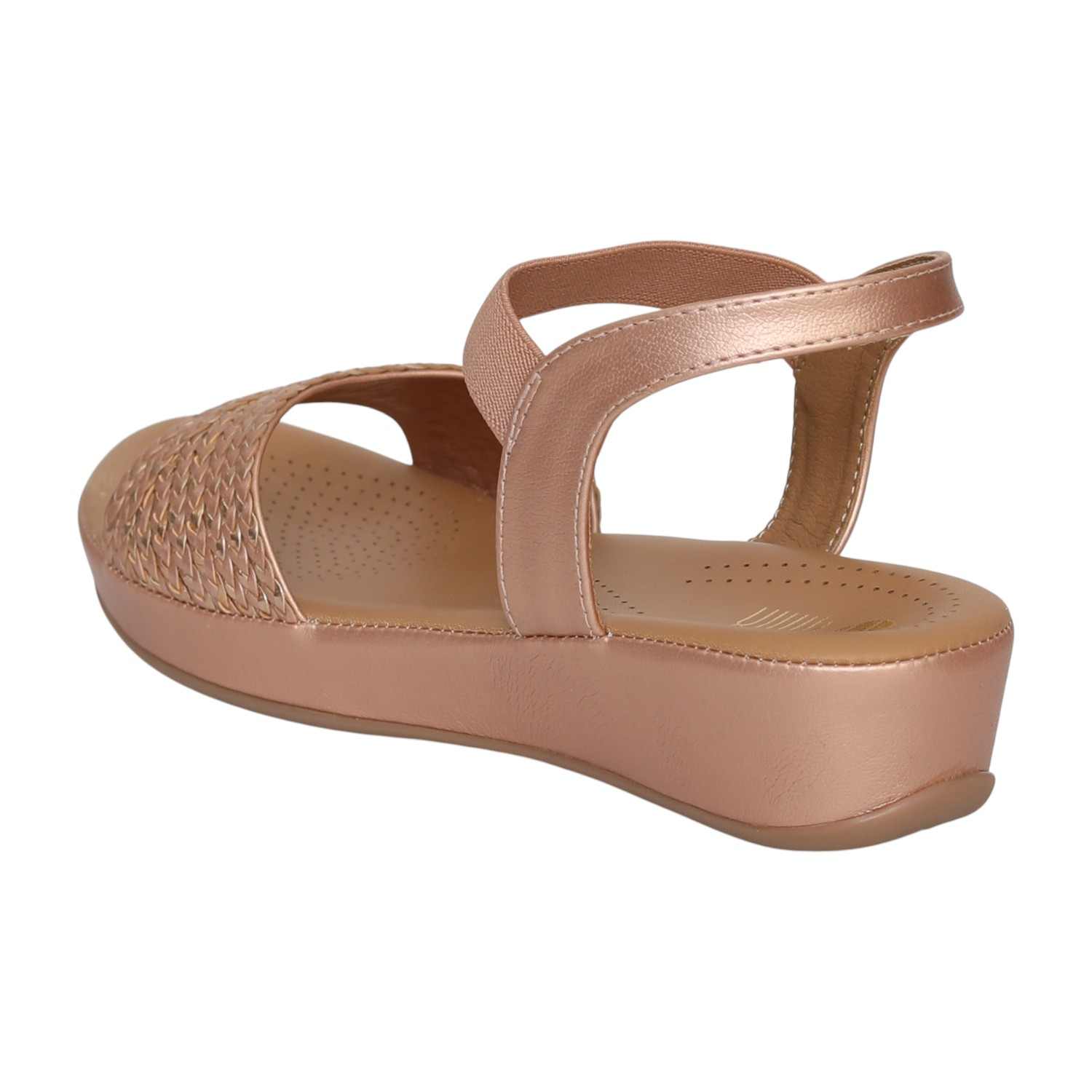 A warm, luminous sandal that brightens any look. Peach shade and shimmering woven texture add a refined elegance. Its supportive wedge is designed for stability and secure, day-long comfort.