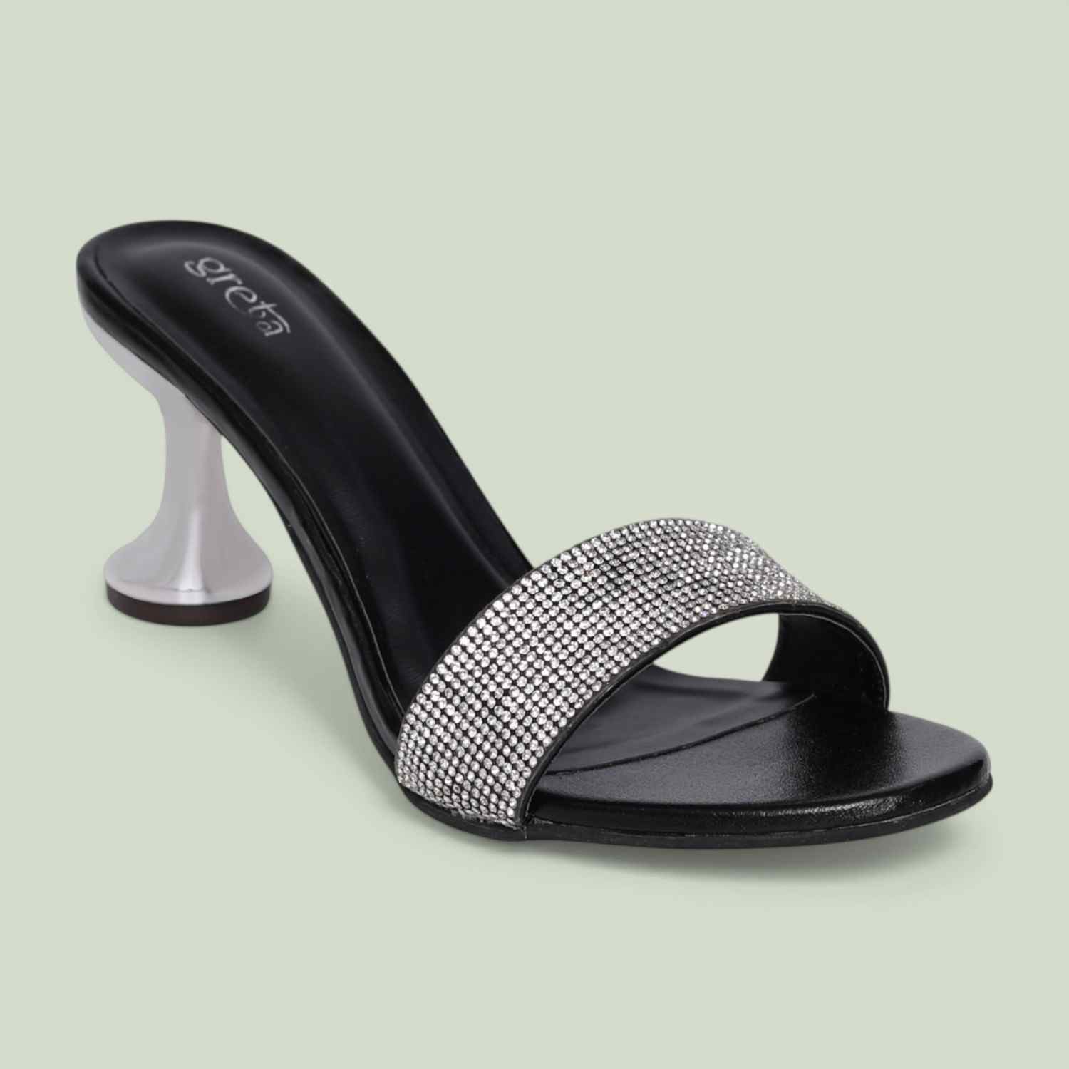 Home / Products / greta / Women’s Black Crystal Slip-On Heels with Sculpted Heel