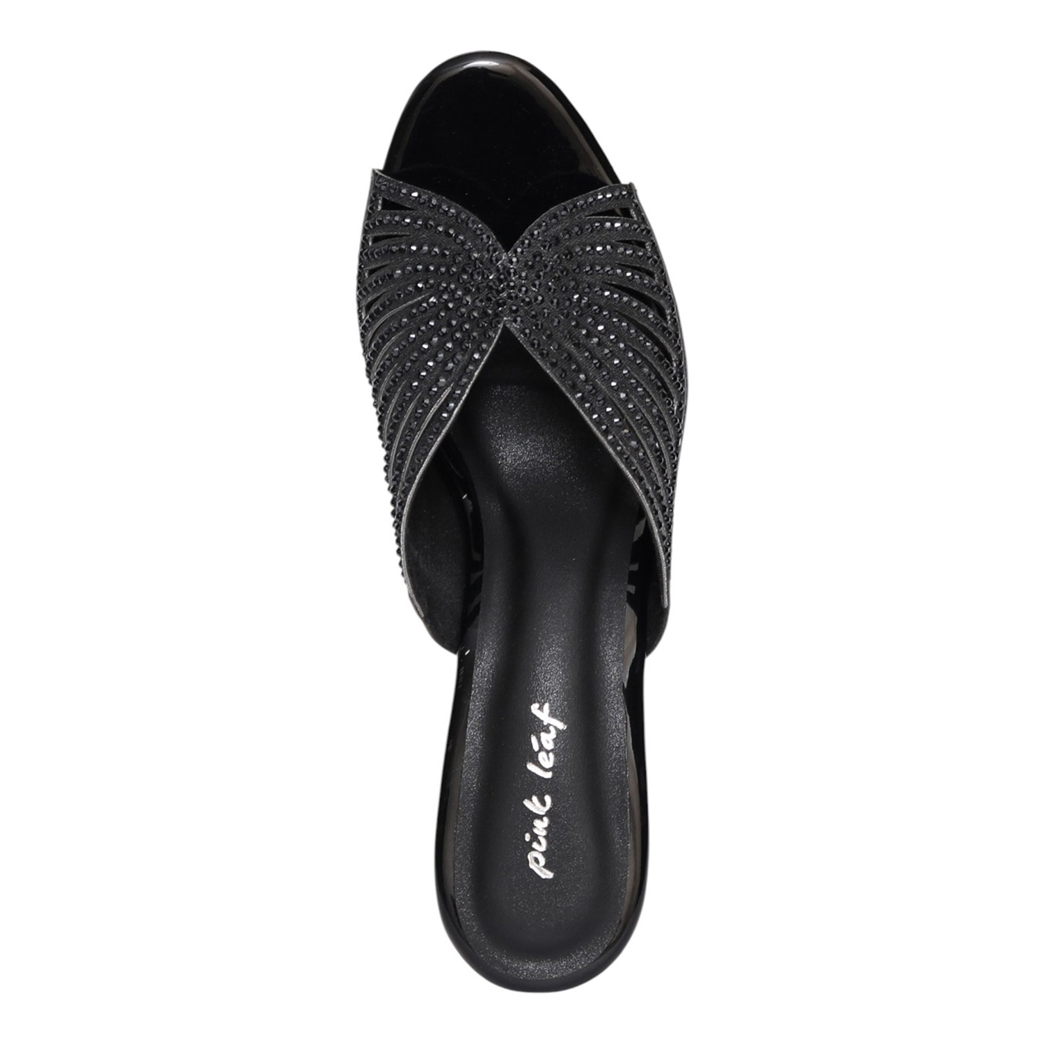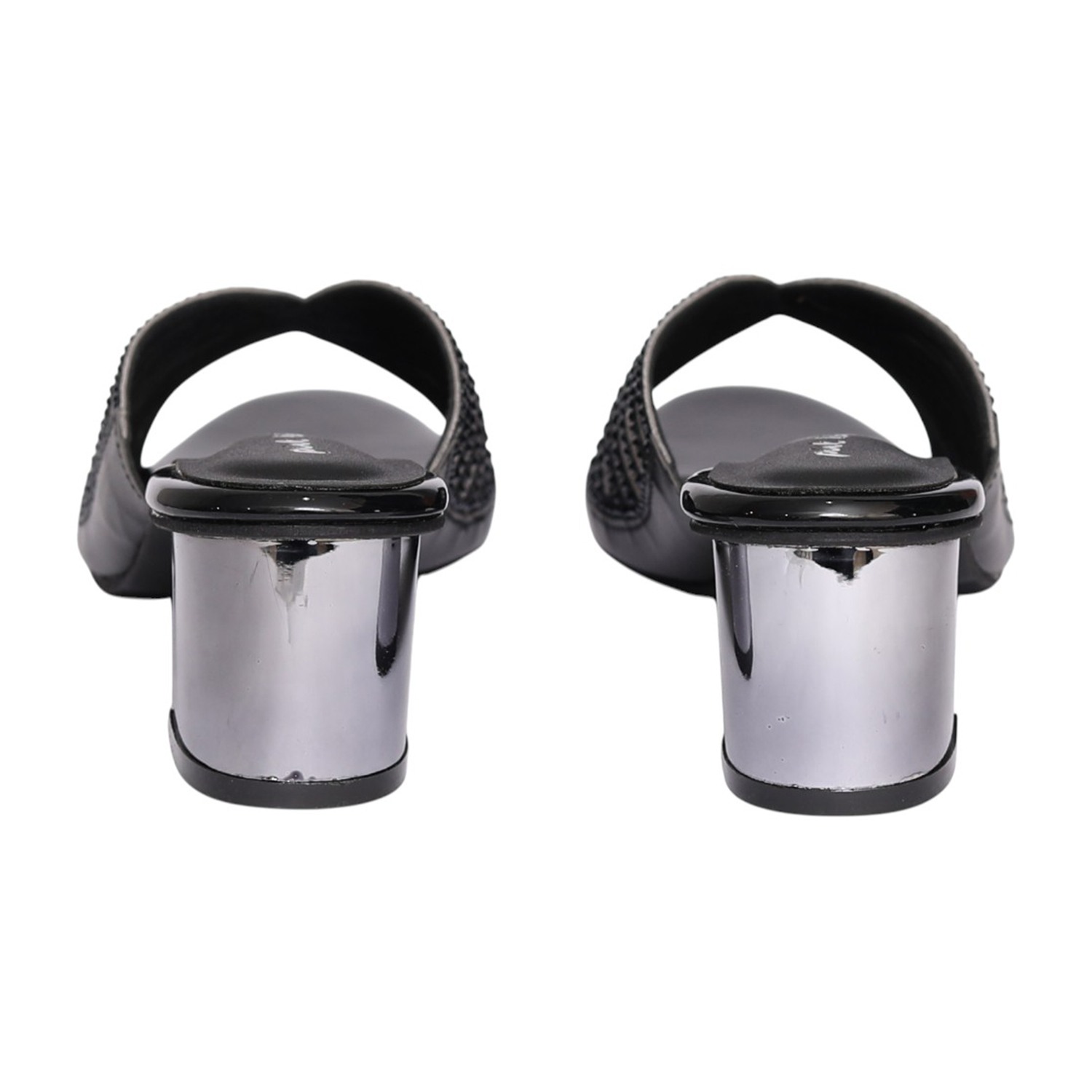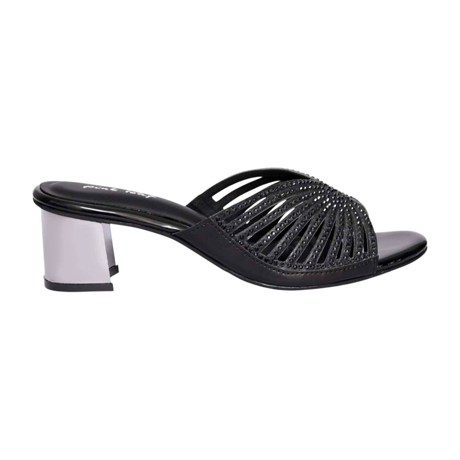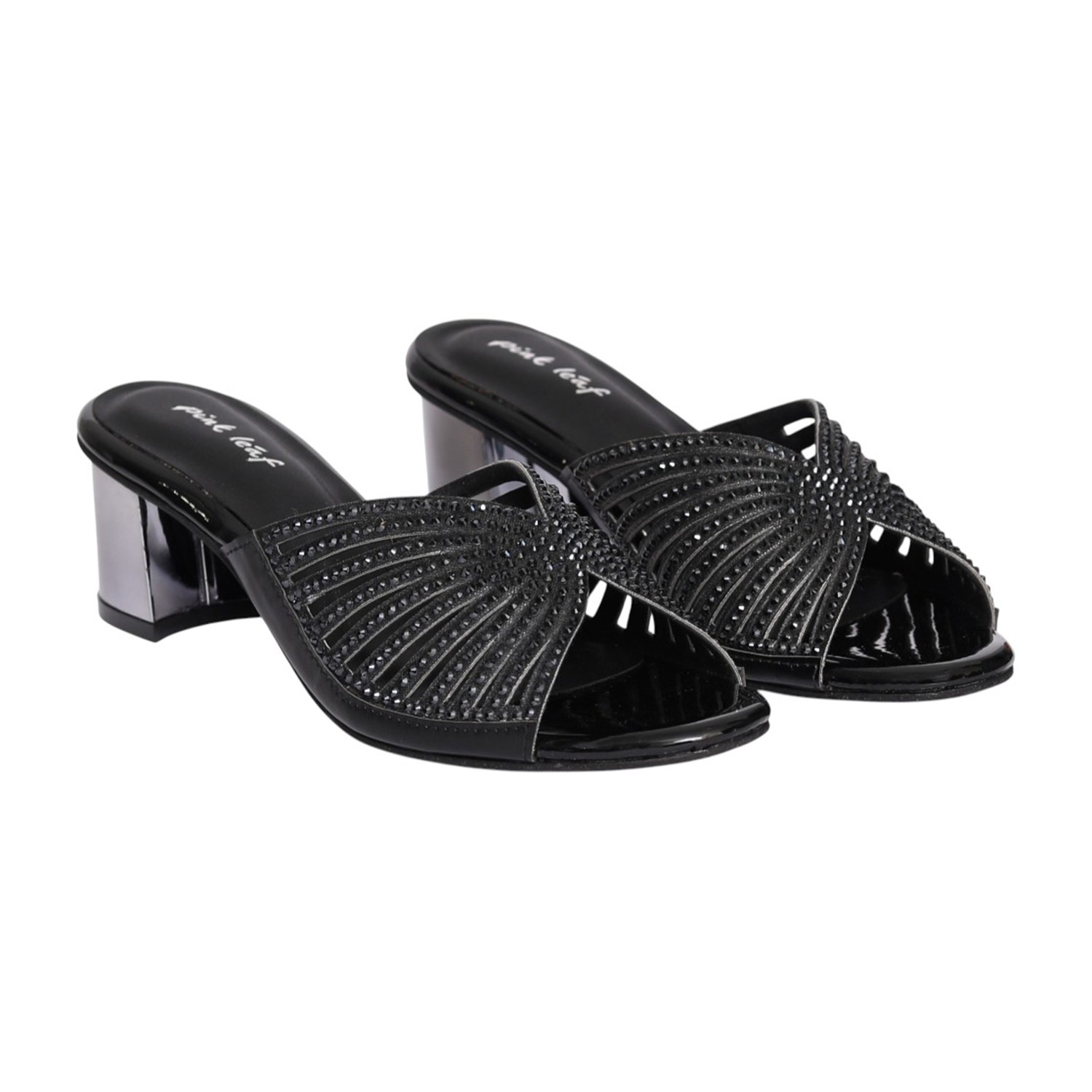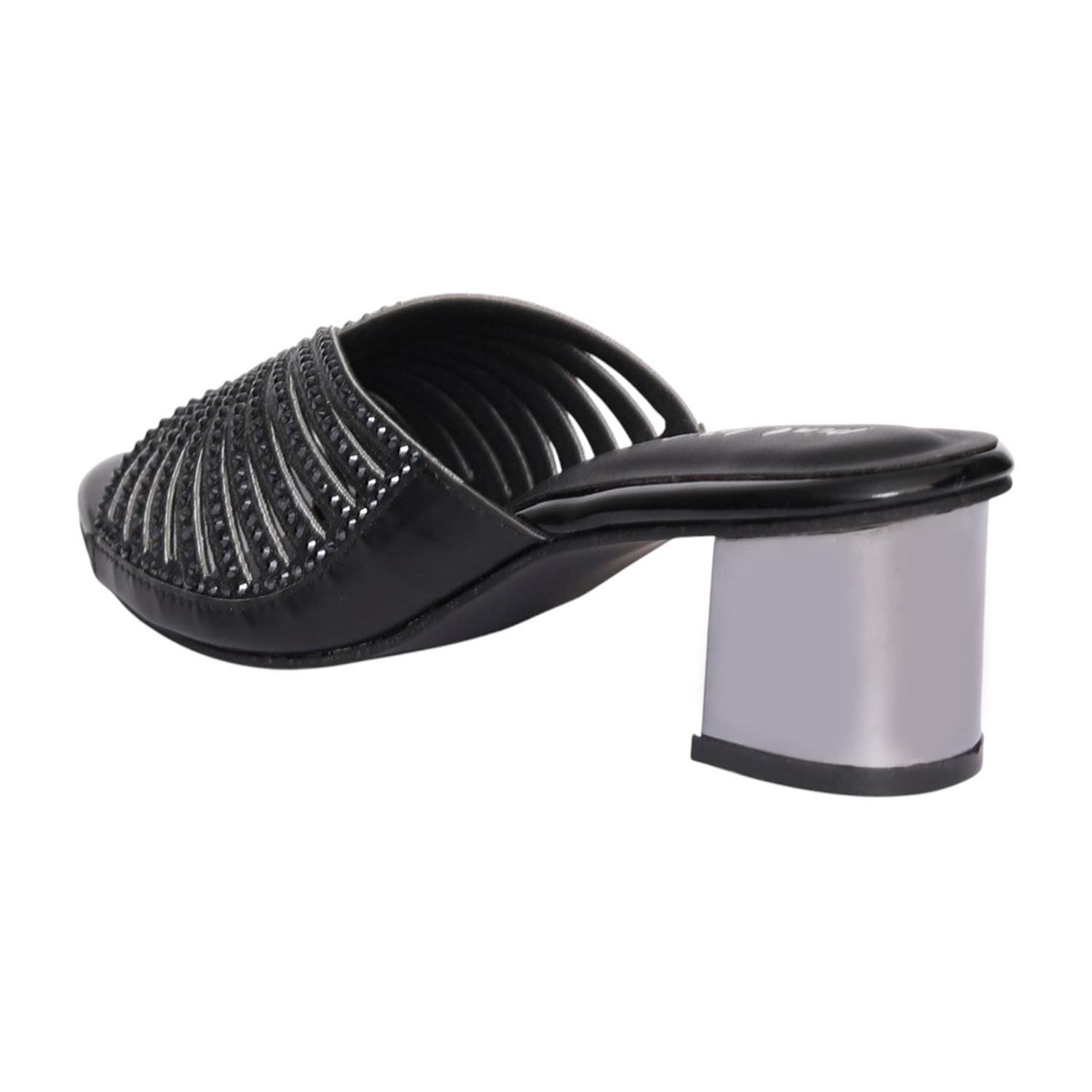 Step into refined elegance with these black embellished mule heels, designed to elevate your everyday and occasion wear. Featuring a beautifully detailed upper with sparkling embellishments in a fan-inspired pattern, these slip-on mules combine style with comfort. The open-toe design adds a modern touch, while the sturdy block heel ensures stability and ease of movement. Perfect for evening outings, festive occasions, or adding a chic edge to your casual looks.