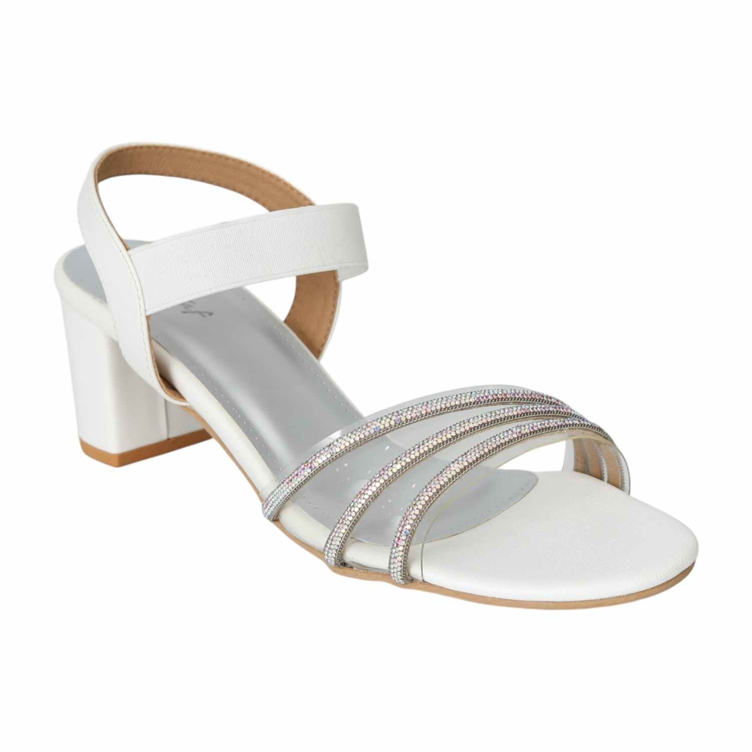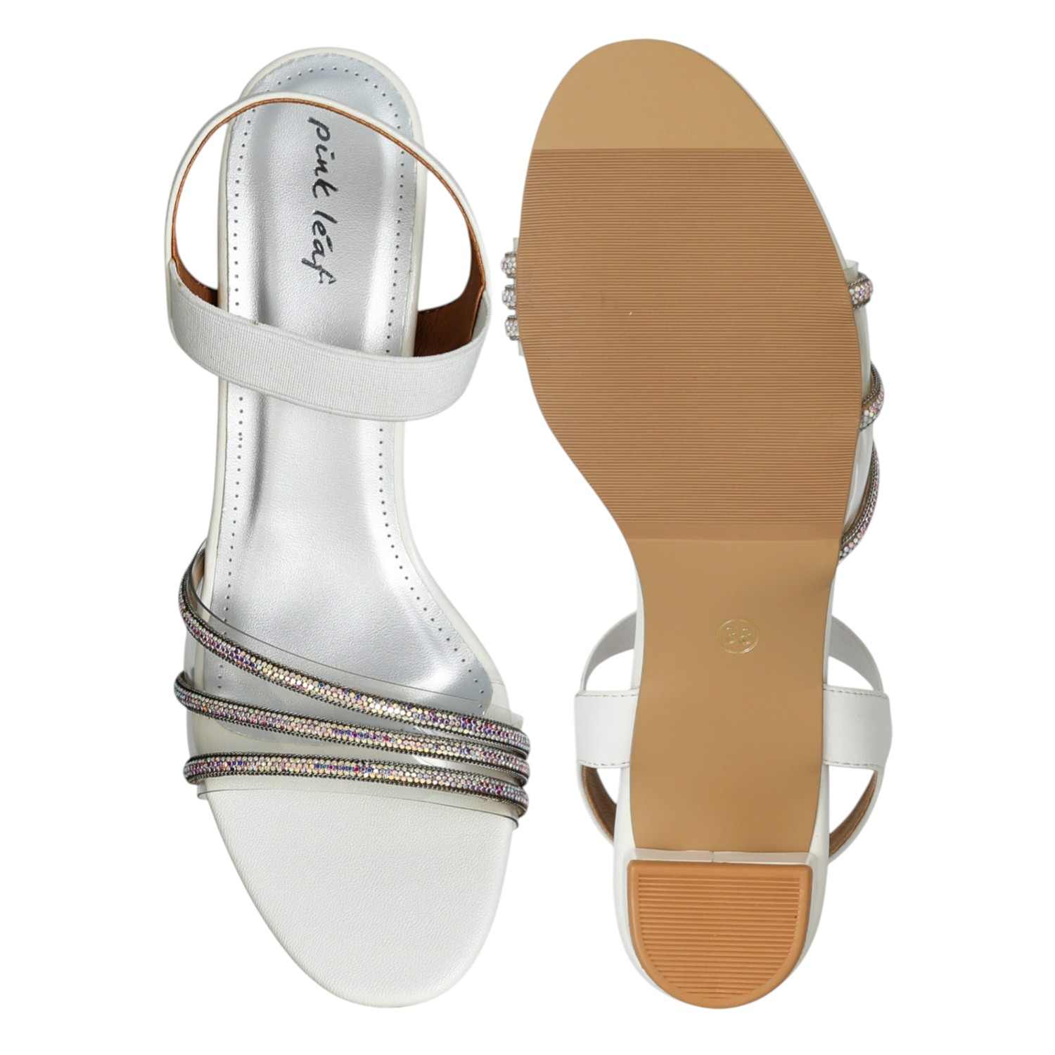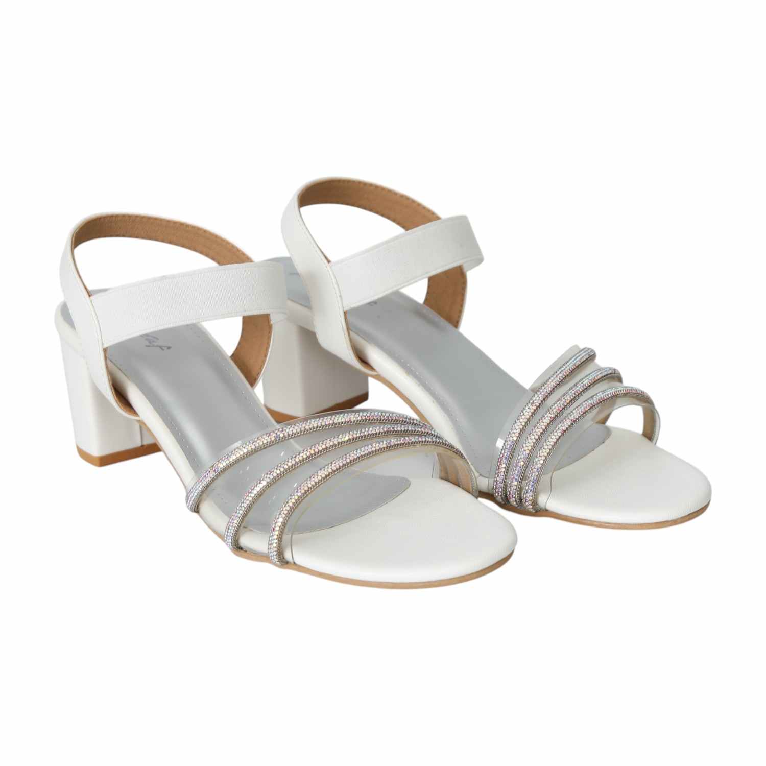 Add a refined sparkle to your look with these elegant white block heel sandals. Designed with shimmering multi-strap detailing across the front and a supportive elastic back strap, they offer both style and ease. The cushioned sole and stable block heel ensure all-day comfort, making them perfect for festive events, evening outings, or special celebrations.
