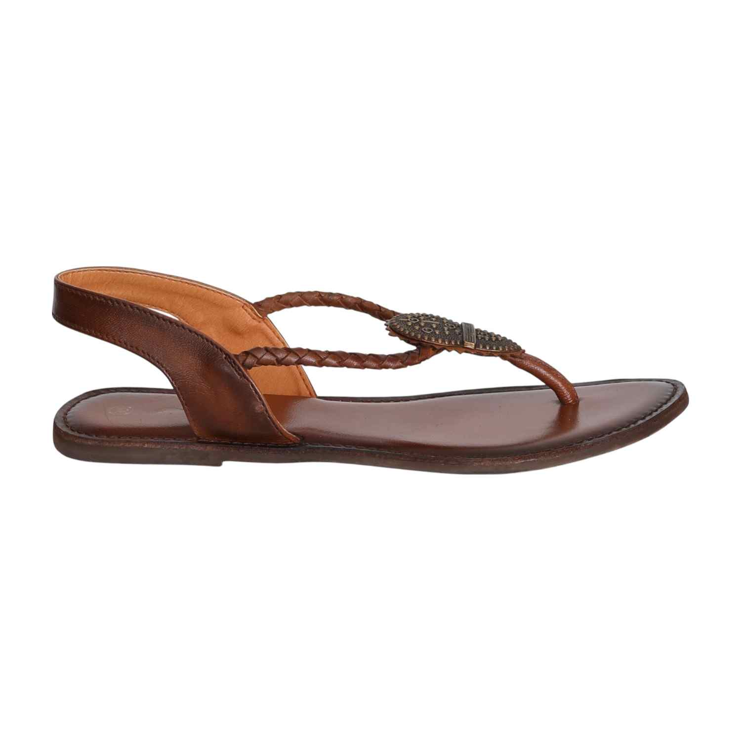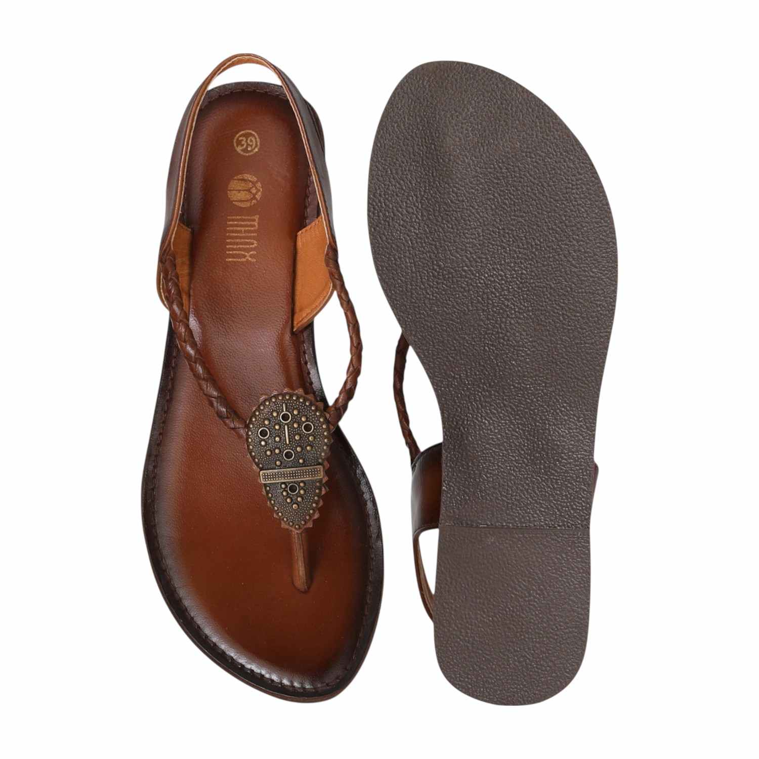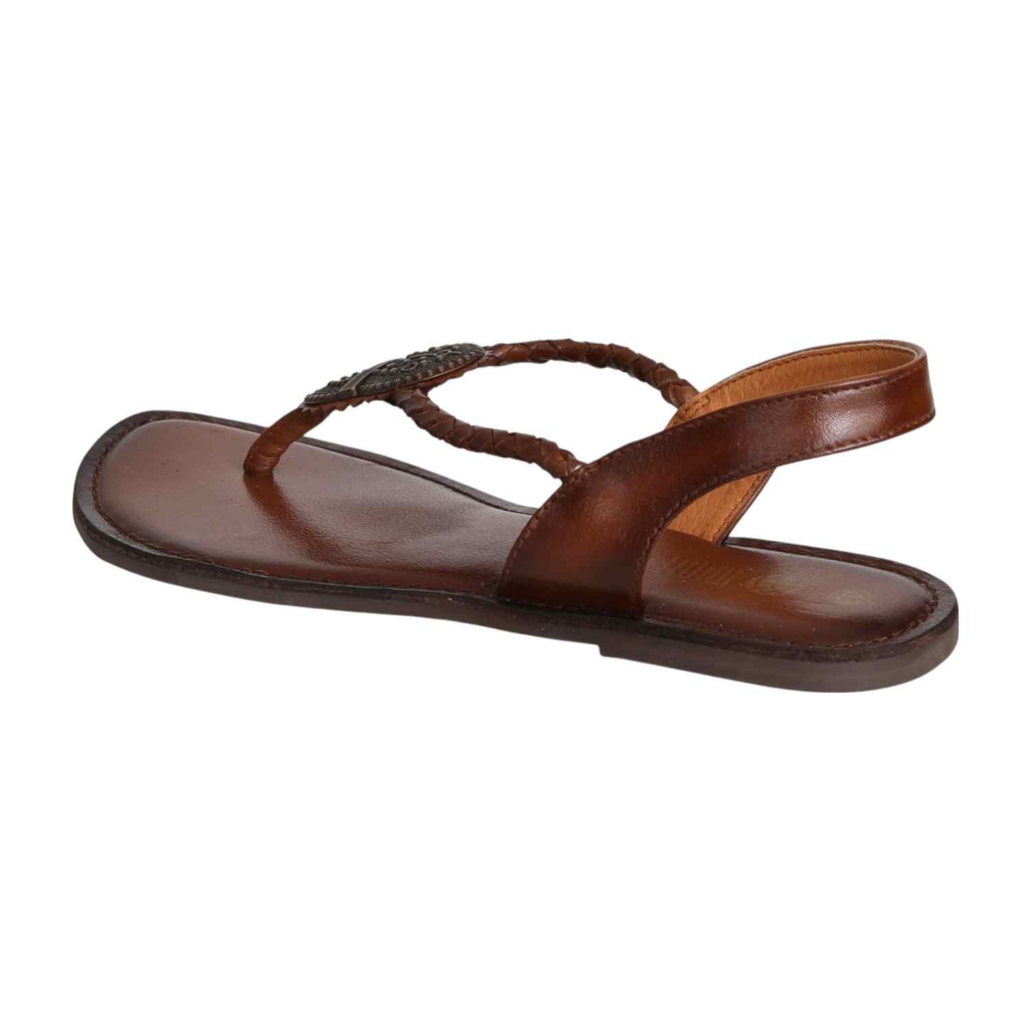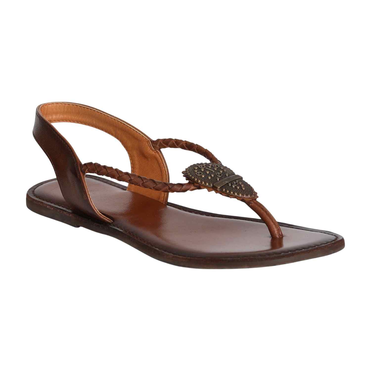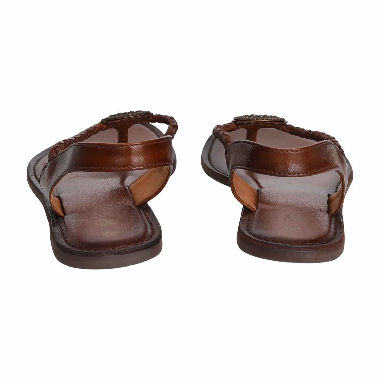 Bring natural charm to your look with these stylish braided thong sandals. Crafted in a warm brown tone with antique metallic accents, they offer a grounded yet graceful appeal. The cushioned footbed and supportive backstrap provide comfort for all-day wear, perfect for both everyday outings and relaxed festive gatherings.