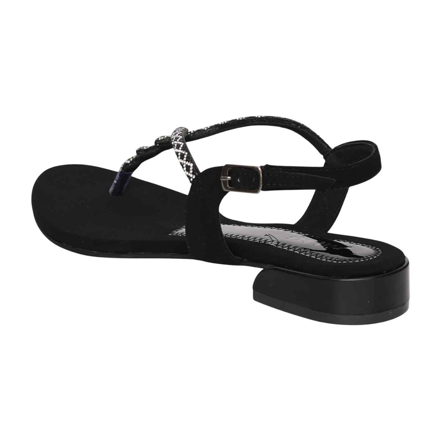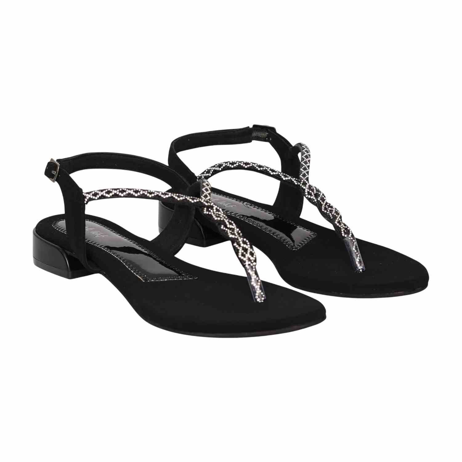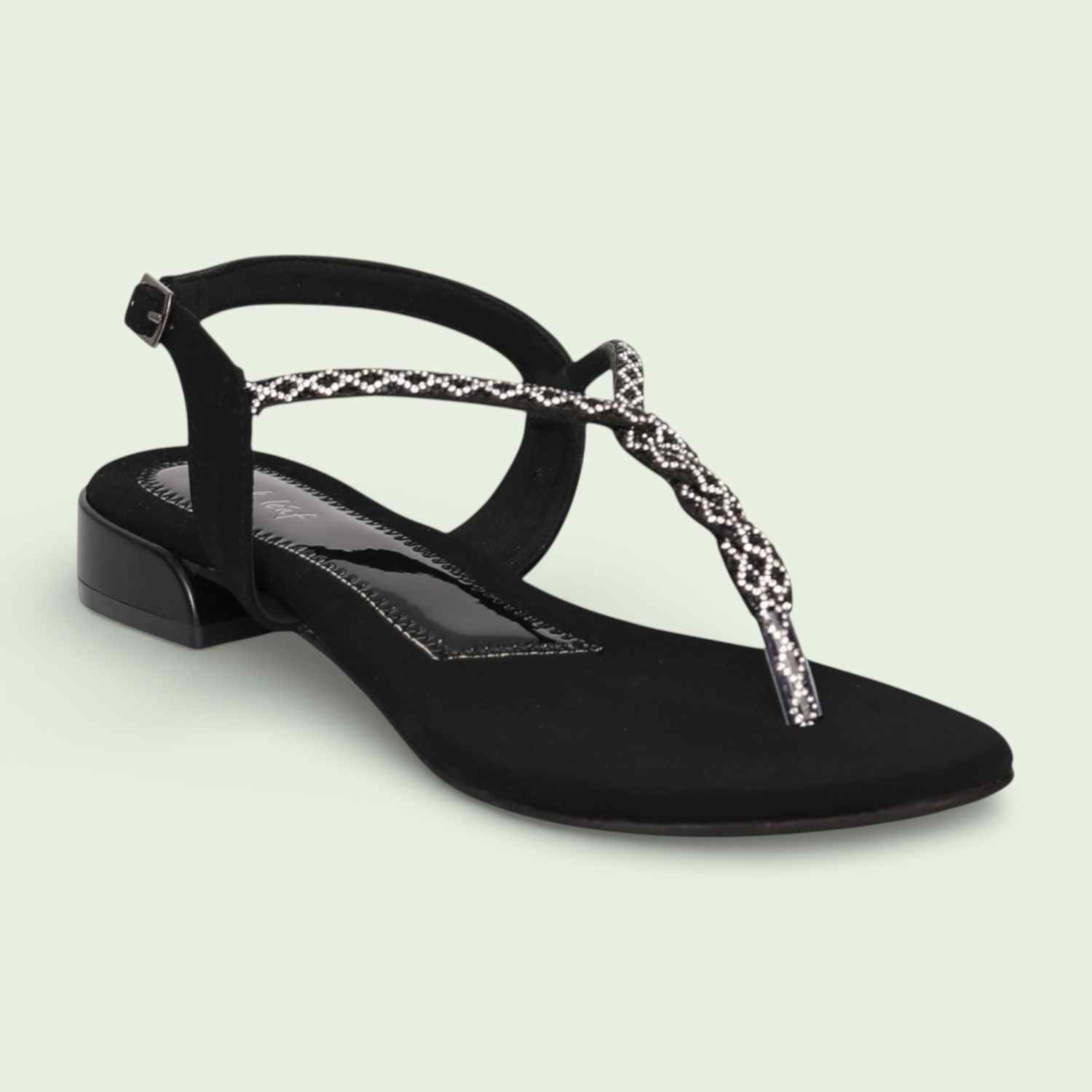 Radiating a sleek, high-contrast charm, this pair embodies timeless sophistication. The T-strap design is detailed with shimmering embellishments, adding a dramatic touch of sparkle perfect for evening wear. Built with a comfortable flat/low heel, it blends classic black elegance with effortless stability.