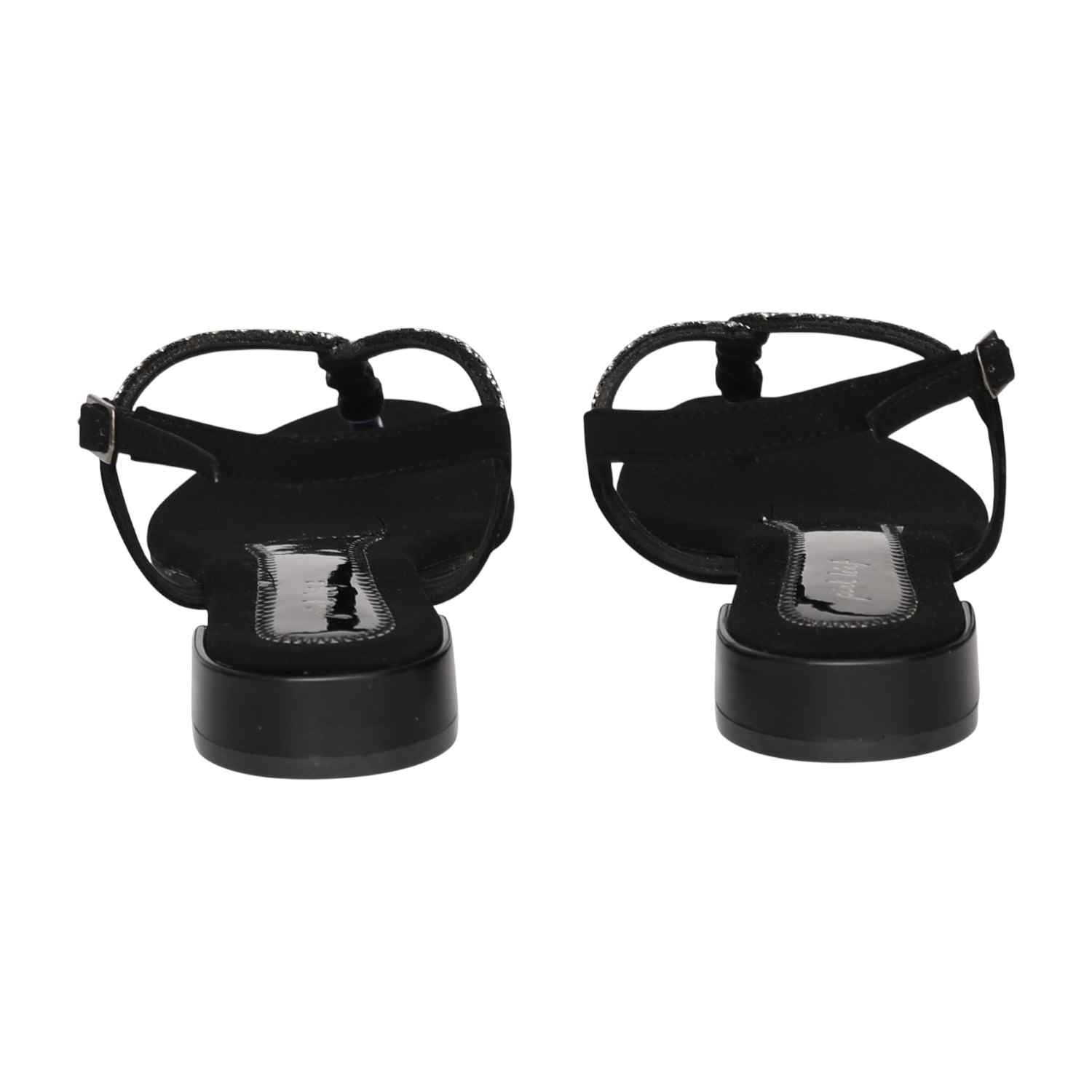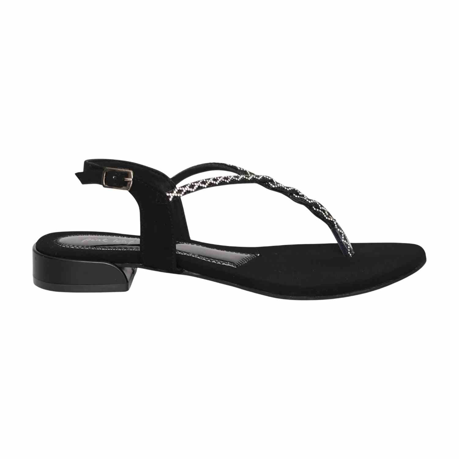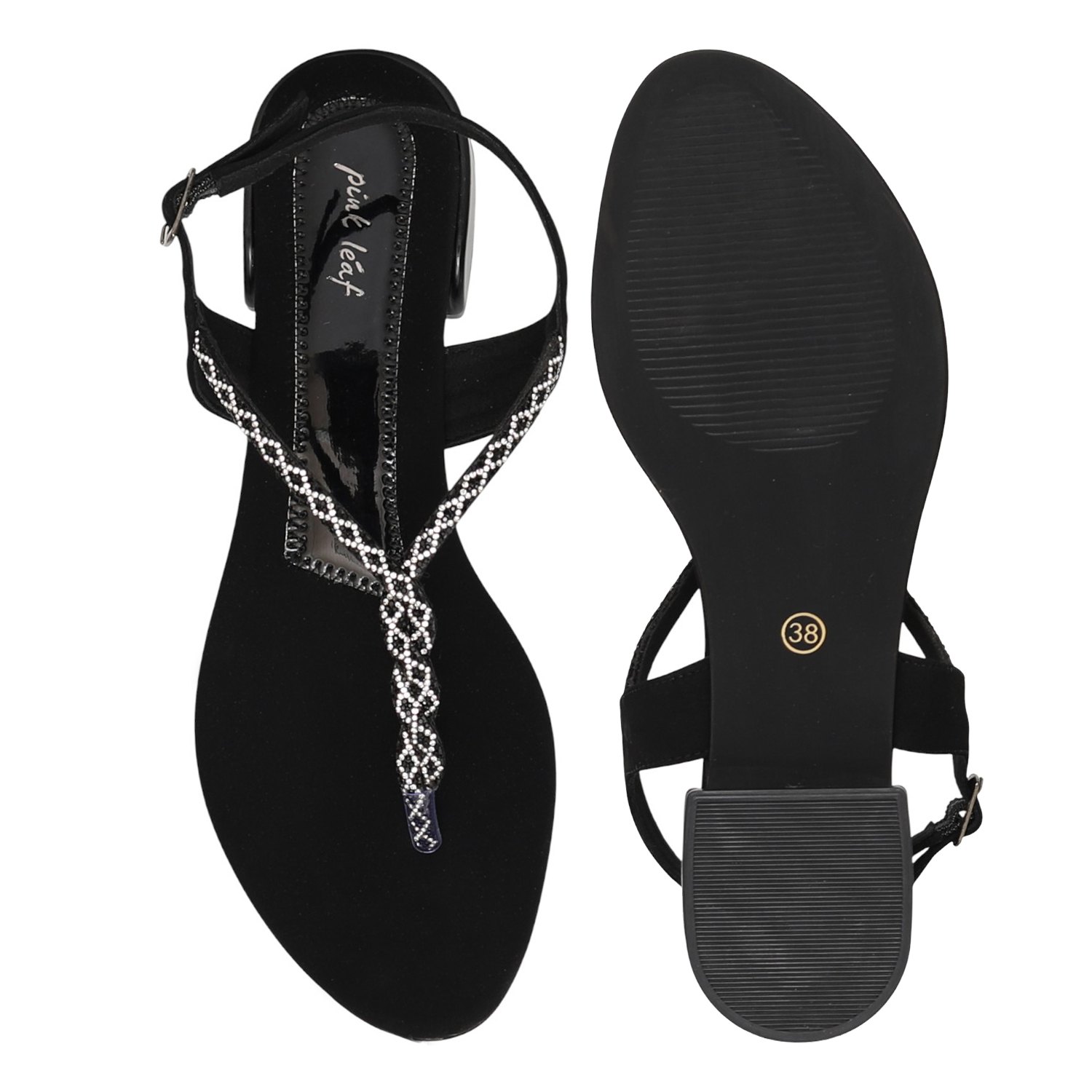 Radiating a sleek, high-contrast charm, this pair embodies timeless sophistication. The T-strap design is detailed with shimmering embellishments, adding a dramatic touch of sparkle perfect for evening wear. Built with a comfortable flat/low heel, it blends classic black elegance with effortless stability.