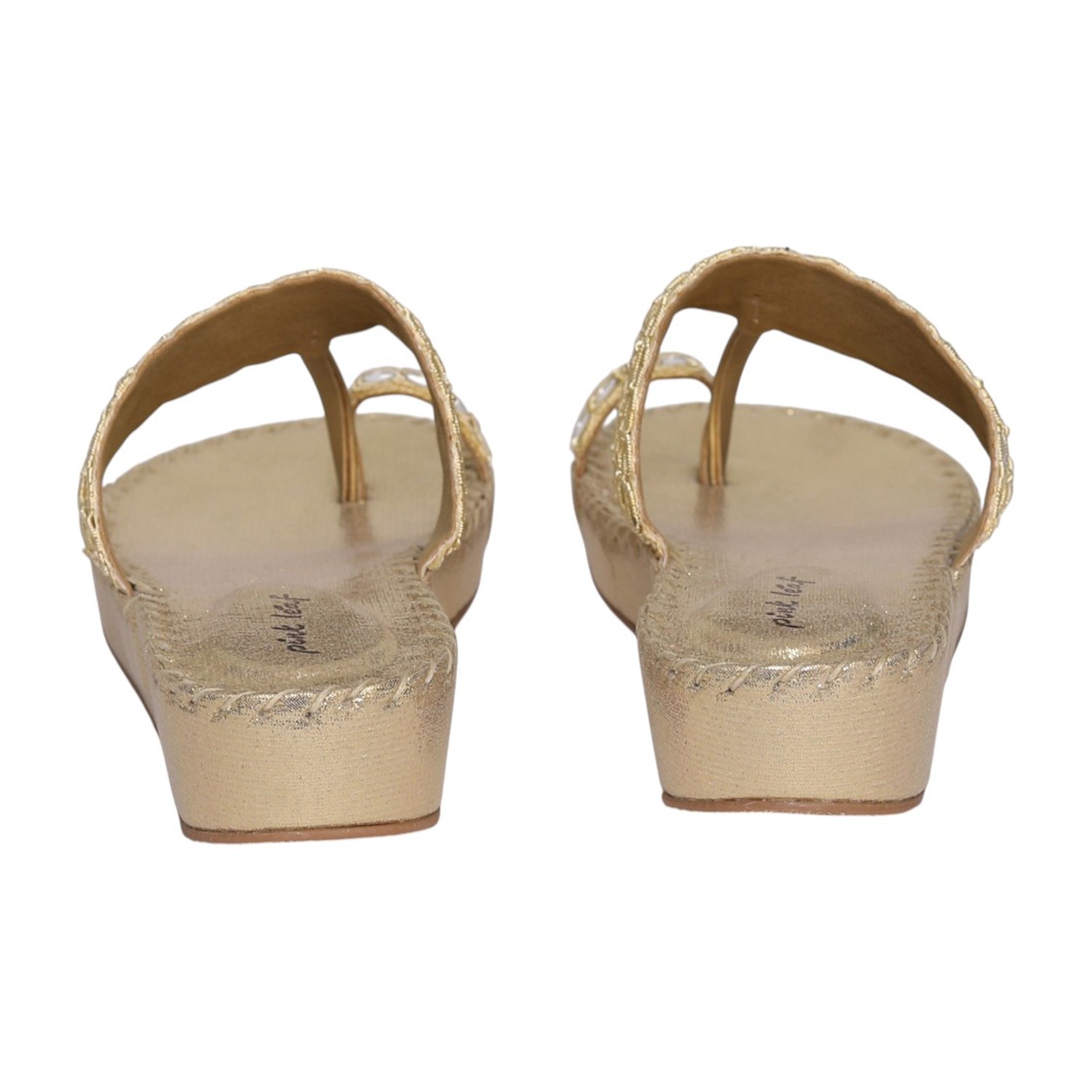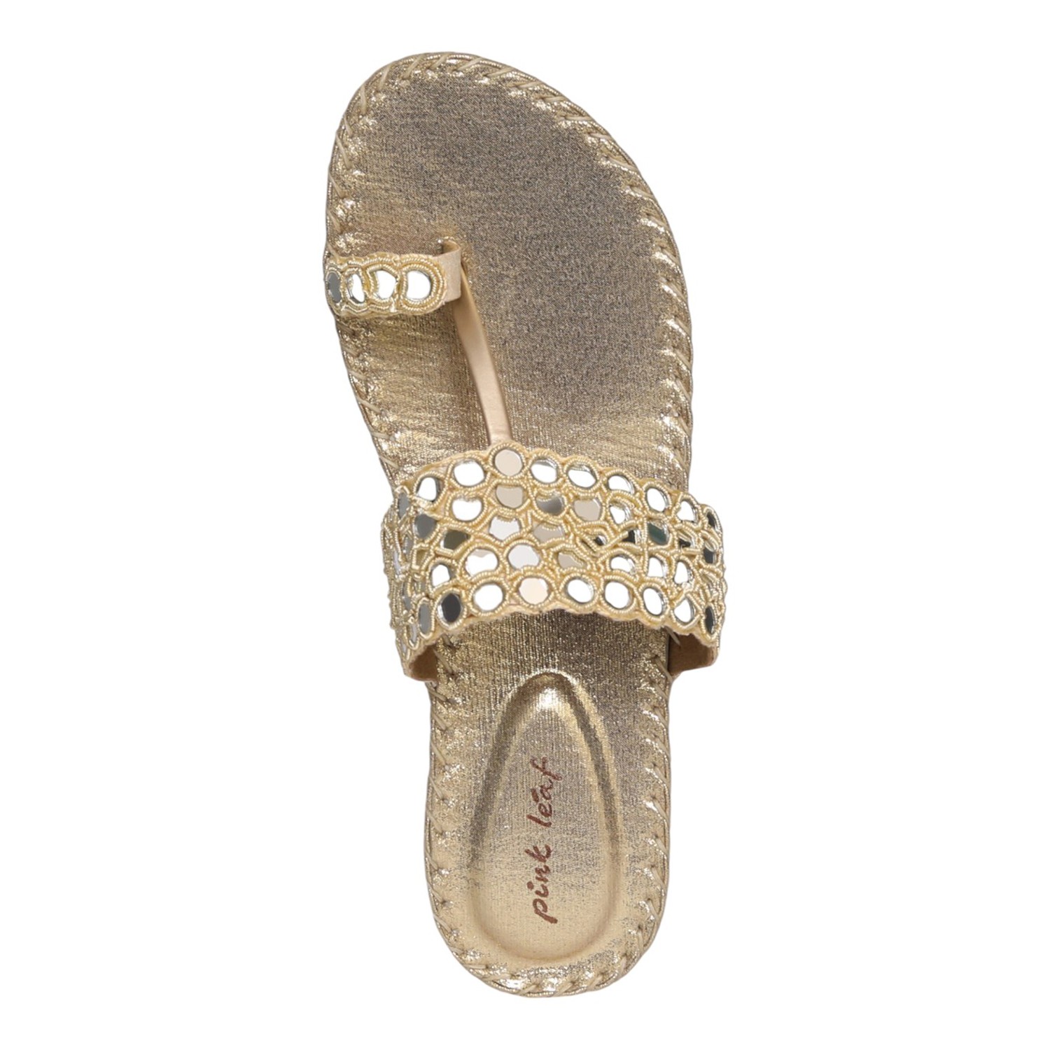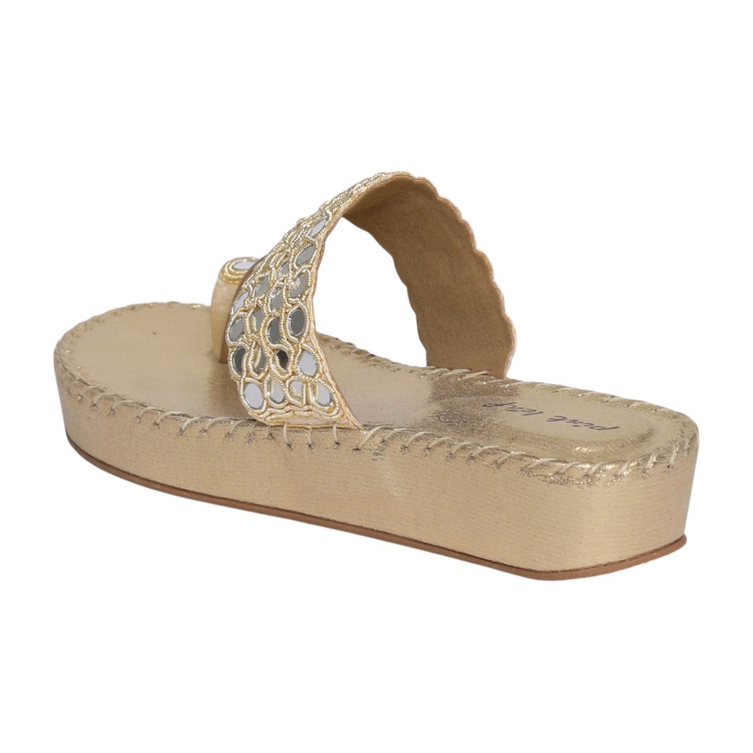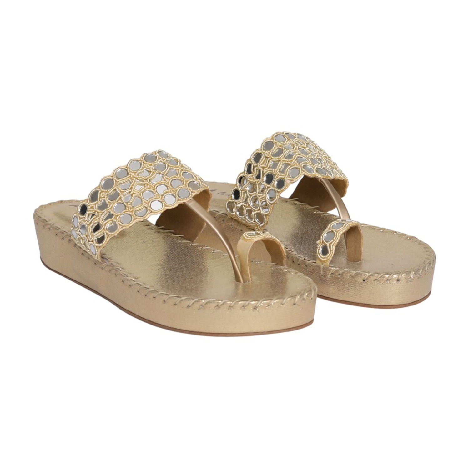 Bring effortless elegance to your everyday style with these gold toe-ring platform sandals. Featuring a beautifully crafted upper with intricate cutwork and mirror-like embellishments, these sandals offer a perfect blend of tradition and modern design. The toe-ring detail ensures a secure fit, while the cushioned platform sole provides added height and comfort. Ideal for festive occasions, casual outings, or ethnic wear, these sandals add a graceful charm to any look.