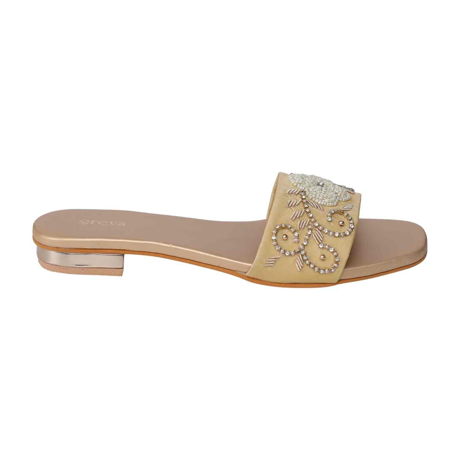 Indulge in sophistication with these pearl accent embroidered Heels, featuring a wide strap with detailed floral embroidery and pearl/bead adornments. Designed for elegance, the low heel and cushioned sole make them perfect for parties or formal gatherings.