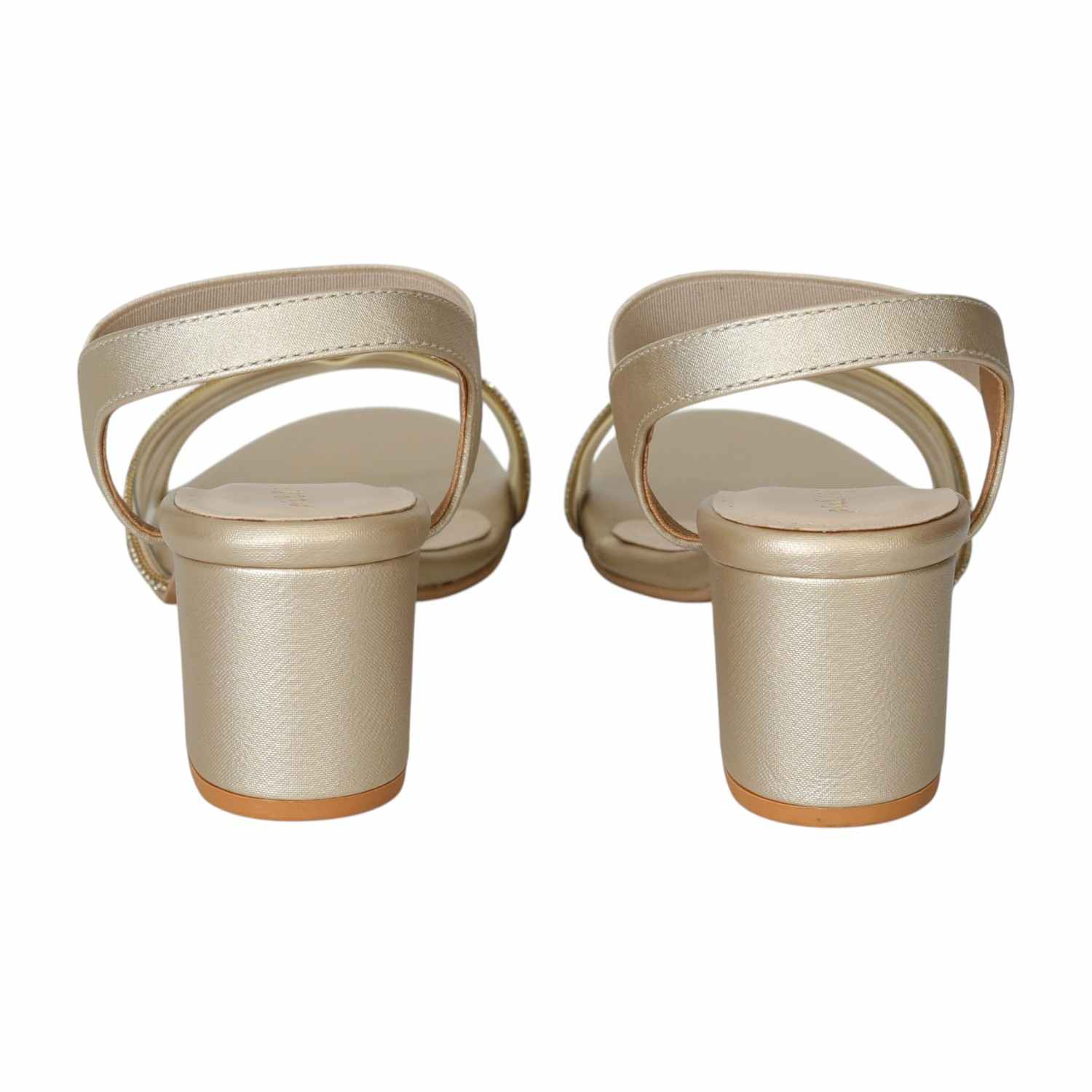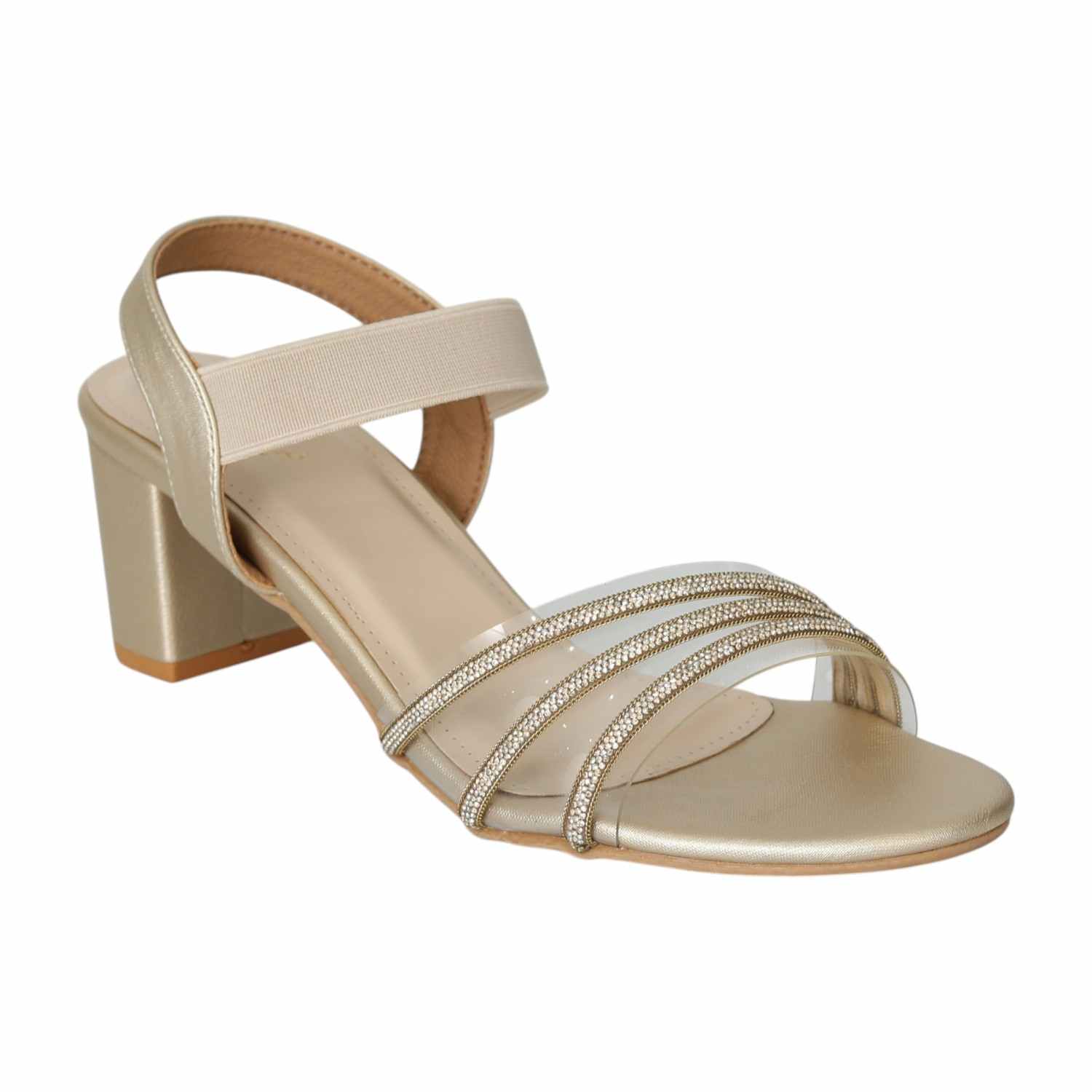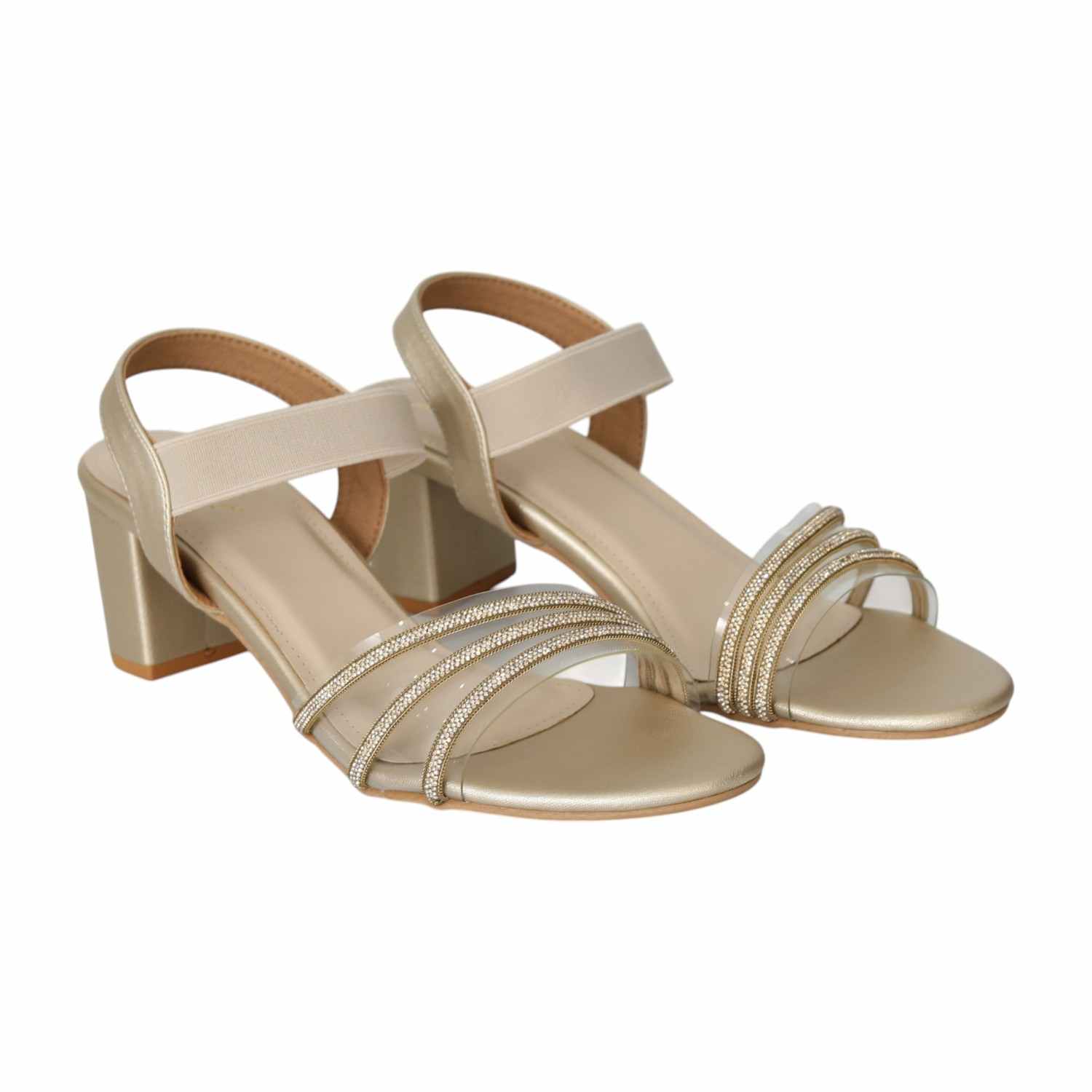 Step into effortless glamour with these radiant gold block heel sandals. Featuring sparkling embellished straps and a supportive elastic back, they blend style with comfort seamlessly. The cushioned insole and sturdy heel make them perfect for weddings, festive events, or elegant evening wear.