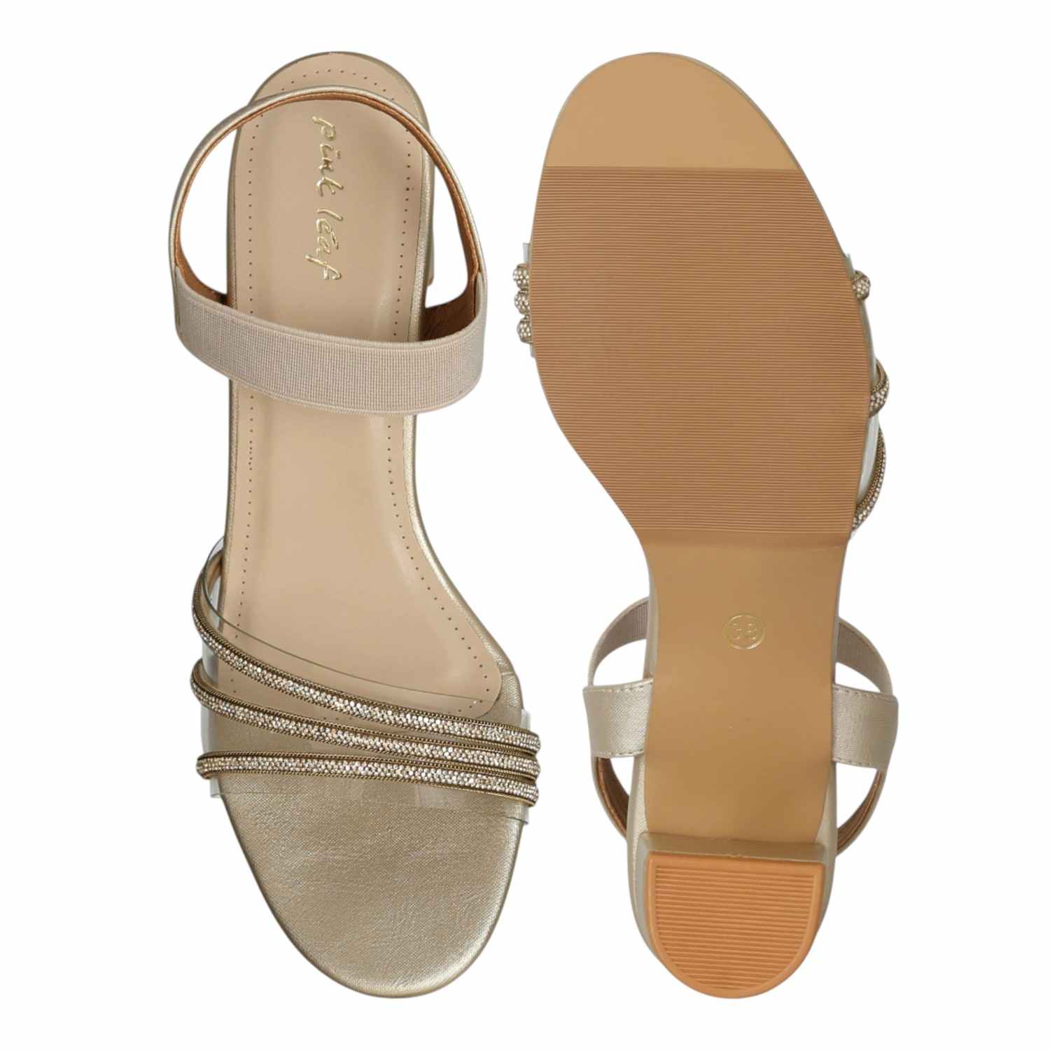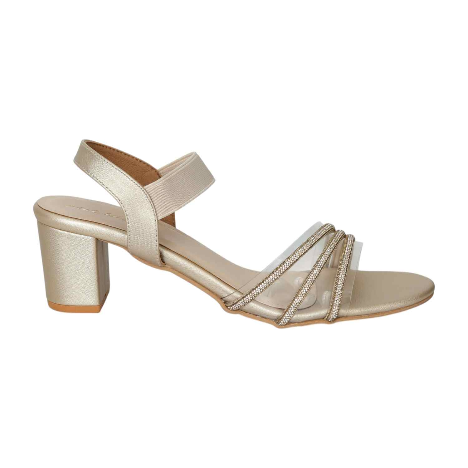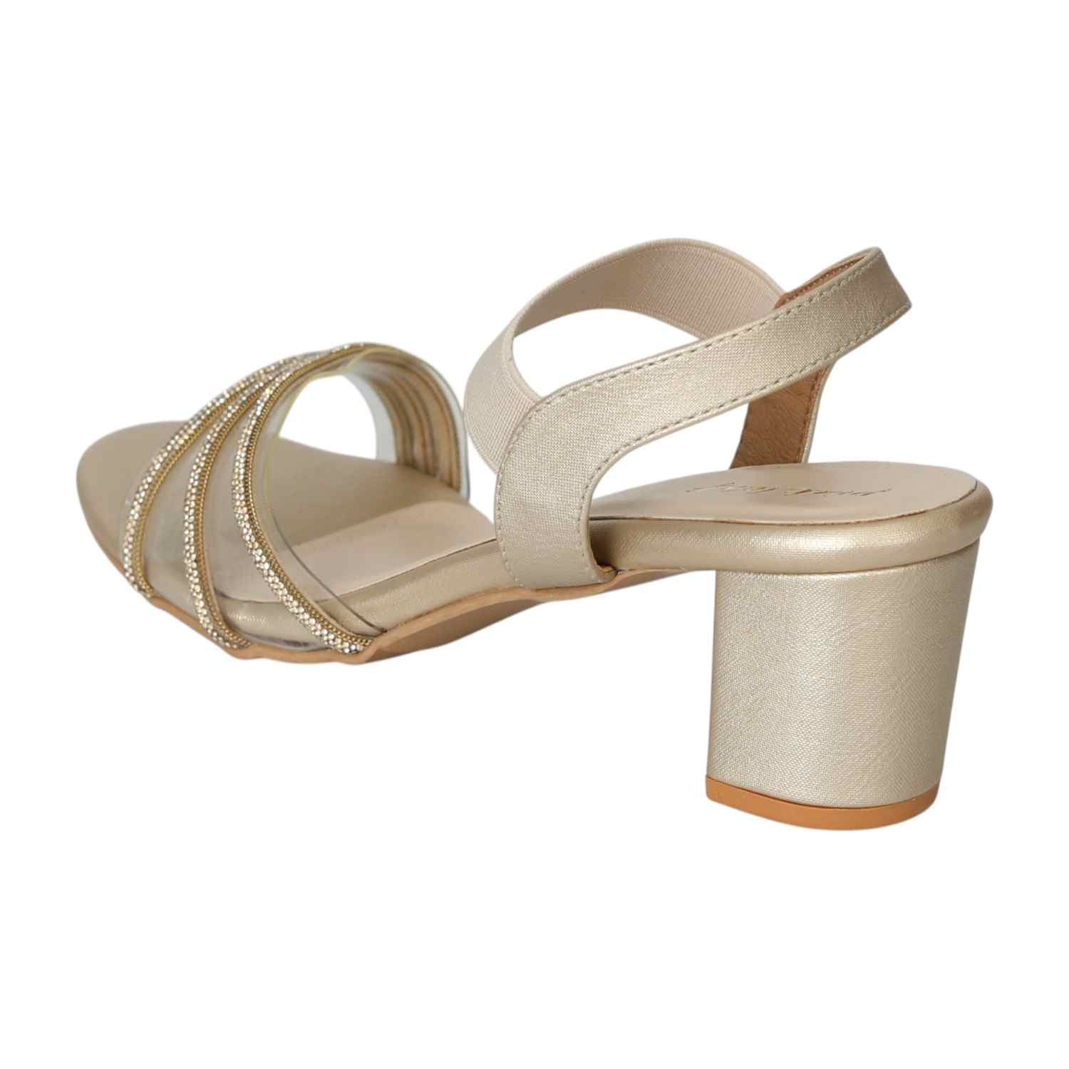 Step into effortless glamour with these radiant gold block heel sandals. Featuring sparkling embellished straps and a supportive elastic back, they blend style with comfort seamlessly. The cushioned insole and sturdy heel make them perfect for weddings, festive events, or elegant evening wear.