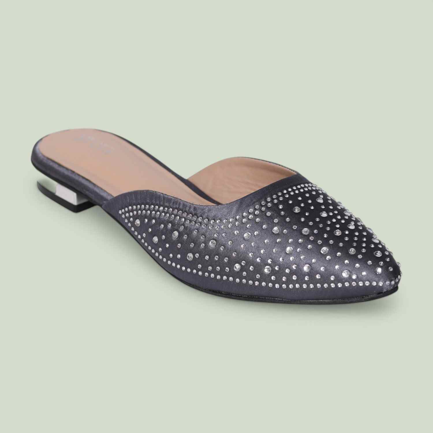 These stylish slip-on mules feature a shimmering satin-like finish paired with intricate cutout detailing that adds both elegance and breathability. The pointed toe gives a refined, elongated look, while the open-back design ensures quick and comfortable wear. Perfect for festive occasions, casual outings, or elevating everyday outfits, these mules deliver effortless charm with a touch of sparkle.