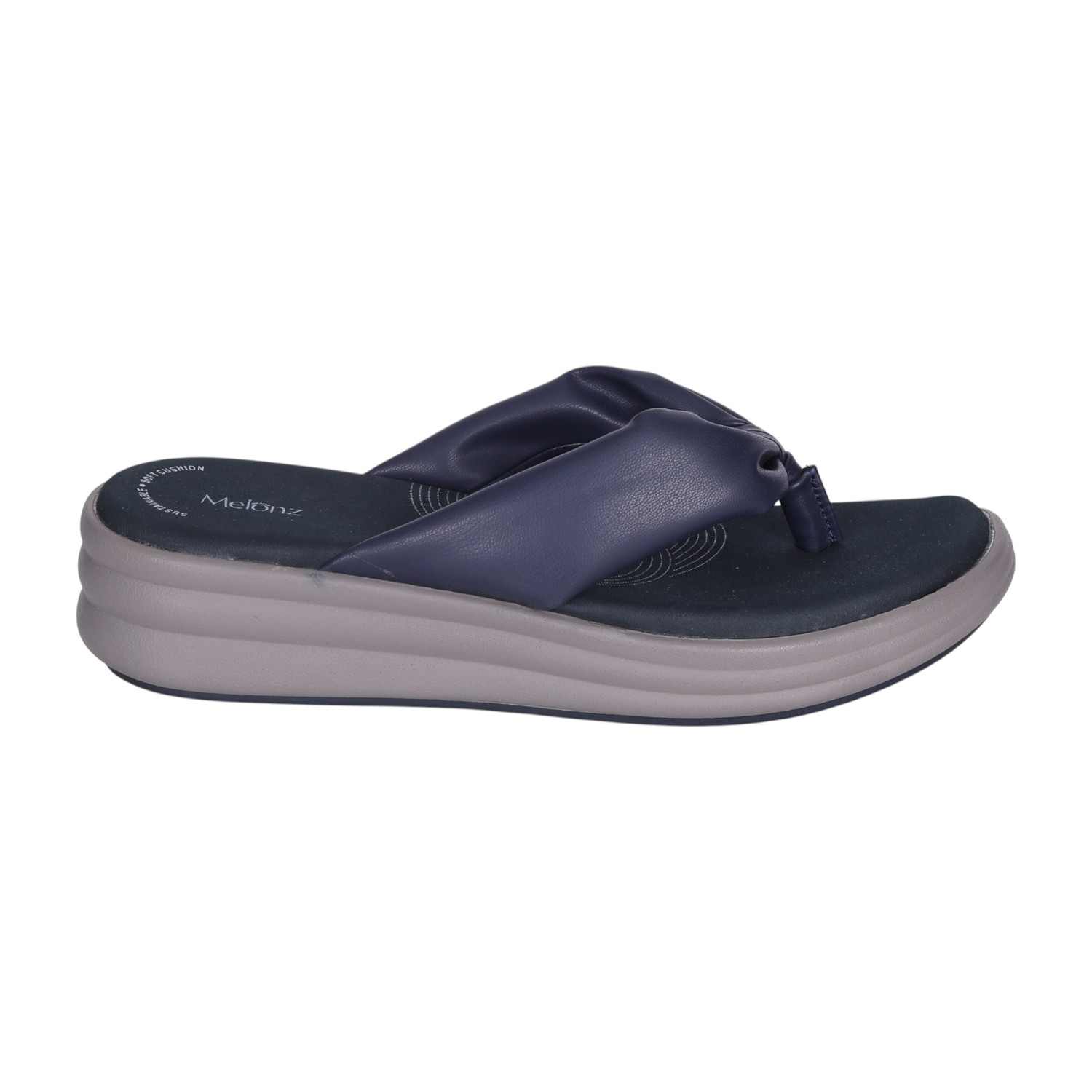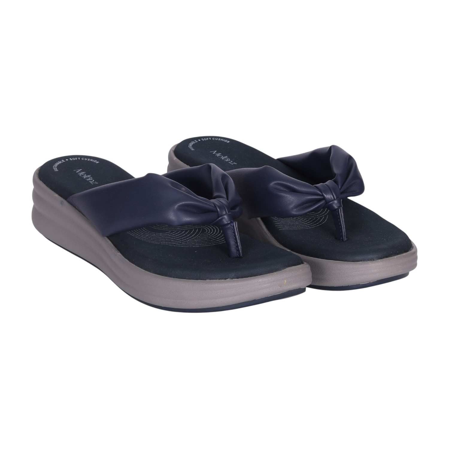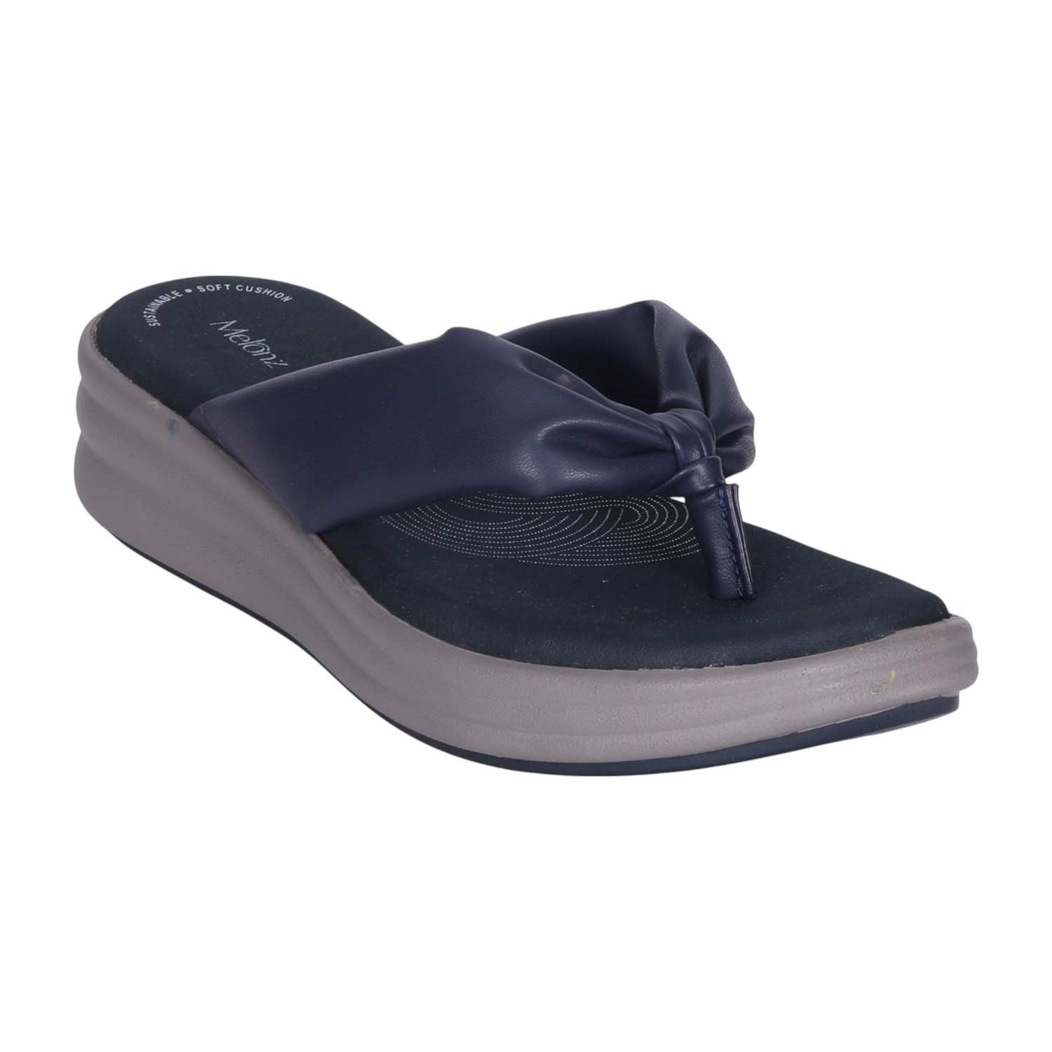 Elevate your everyday look with these sophisticated Navy wedge flip-flops. The soft, knotted strap adds a fashionable detail, while the comfortable wedge sole ensures a pleasant walking experience. Ideal for both daily wear and adding a touch of modern style to a relaxed evening ensemble.
