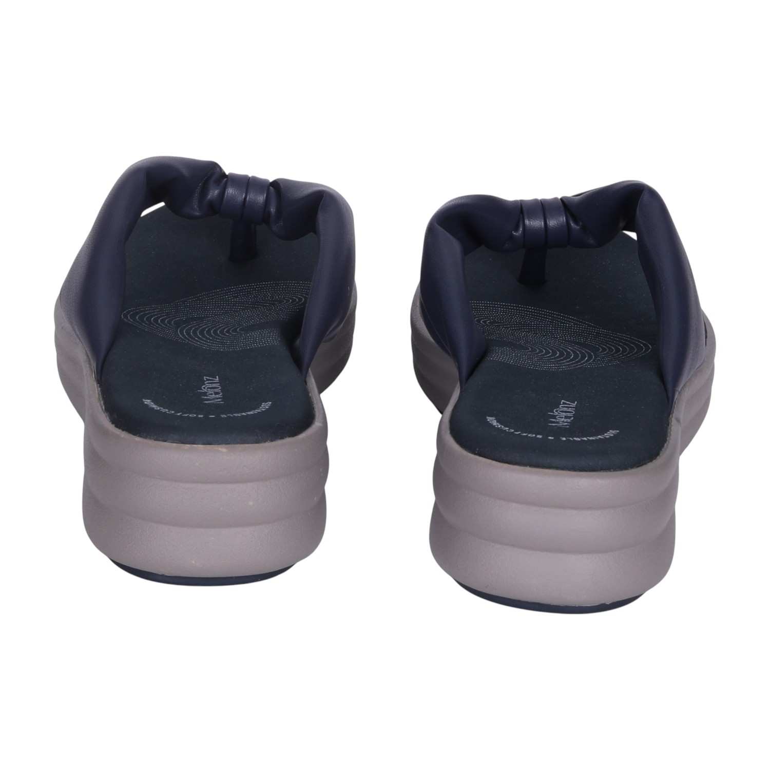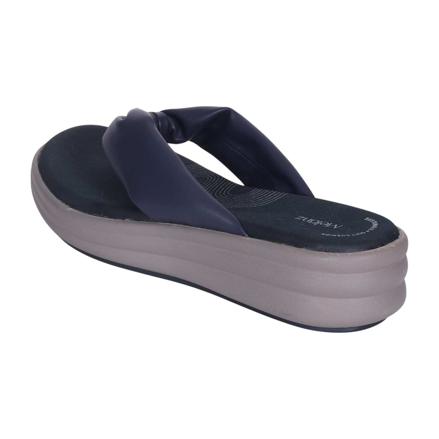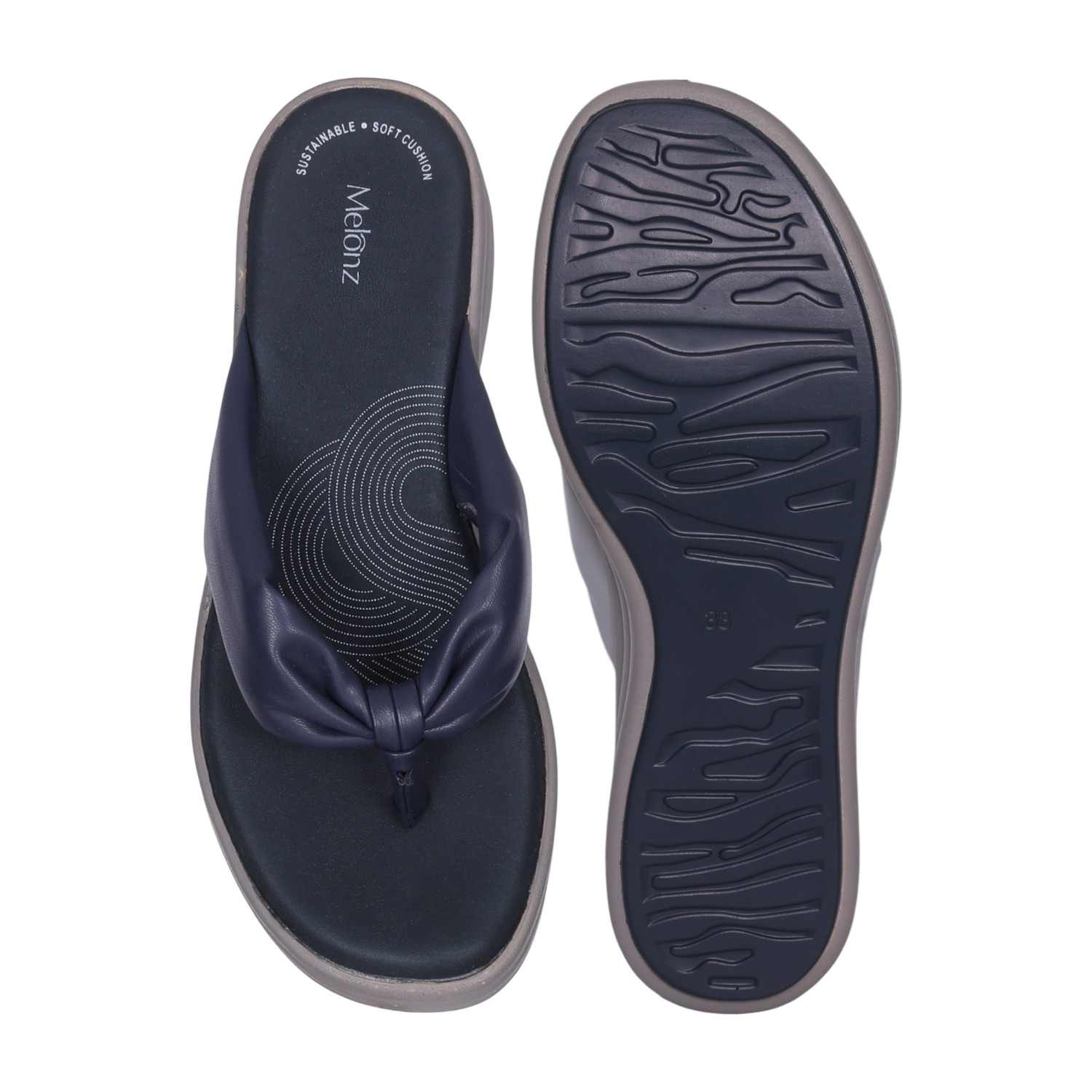 Elevate your everyday look with these sophisticated Navy wedge flip-flops. The soft, knotted strap adds a fashionable detail, while the comfortable wedge sole ensures a pleasant walking experience. Ideal for both daily wear and adding a touch of modern style to a relaxed evening ensemble.