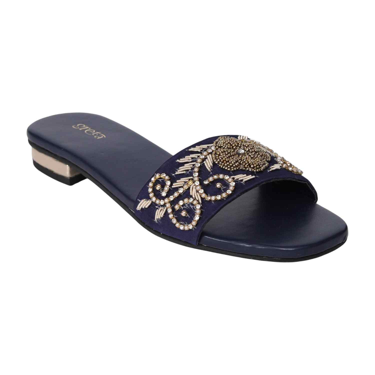 Indulge in sophistication with these pearl accent embroidered Heels, featuring a wide strap with detailed floral embroidery and pearl/bead adornments. Designed for elegance, the low heel and cushioned sole make them perfect for parties or formal gatherings.