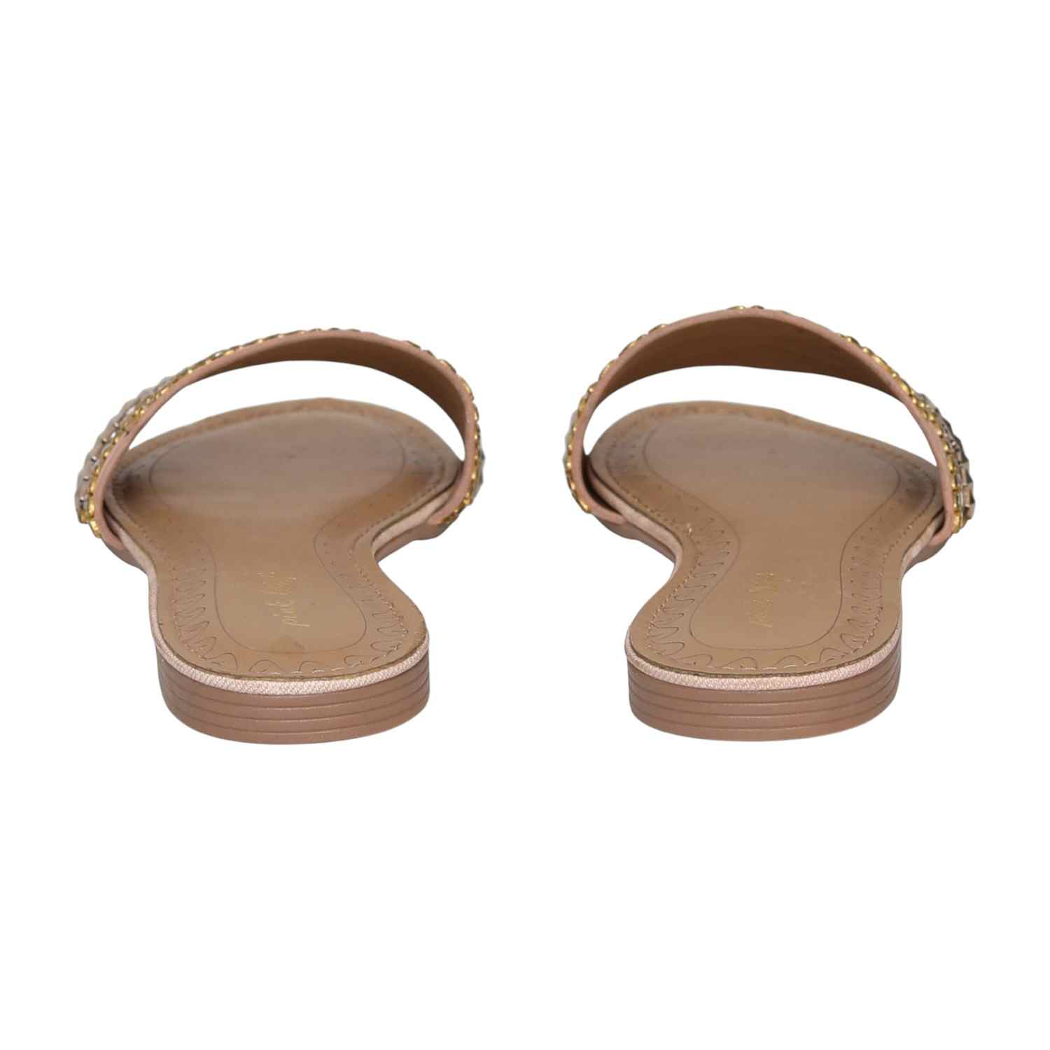 Exuding playful, festive energy, this pair embodies cheerful glamour. The wide strap features an intricate zigzag pattern created with beads, studs, and metallic thread, adding a brilliant, textured detail. Built on a comfortable flat sole, it blends artisanal sparkle with effortless ease for long-lasting wear.