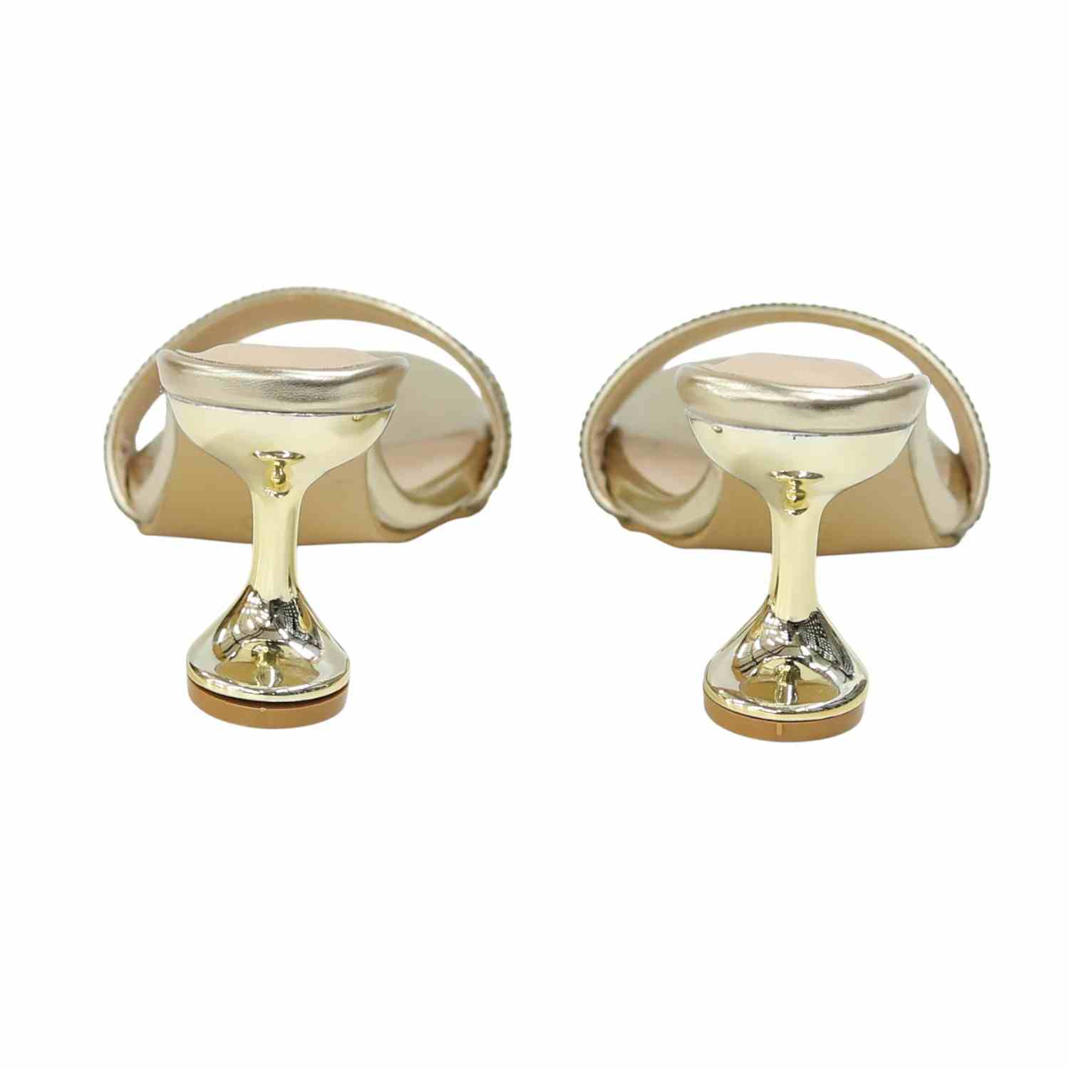 These glamorous slip-on heels are designed to make a statement at any event. Featuring a sparkling crystal-embellished front strap and a unique sculpted metallic heel, they combine luxury with modern elegance. The sleek silhouette, cushioned footbed, and open-toe design ensure both comfort and sophistication, making them perfect for parties, weddings, and festive occasions.